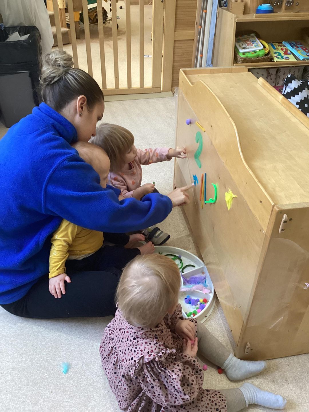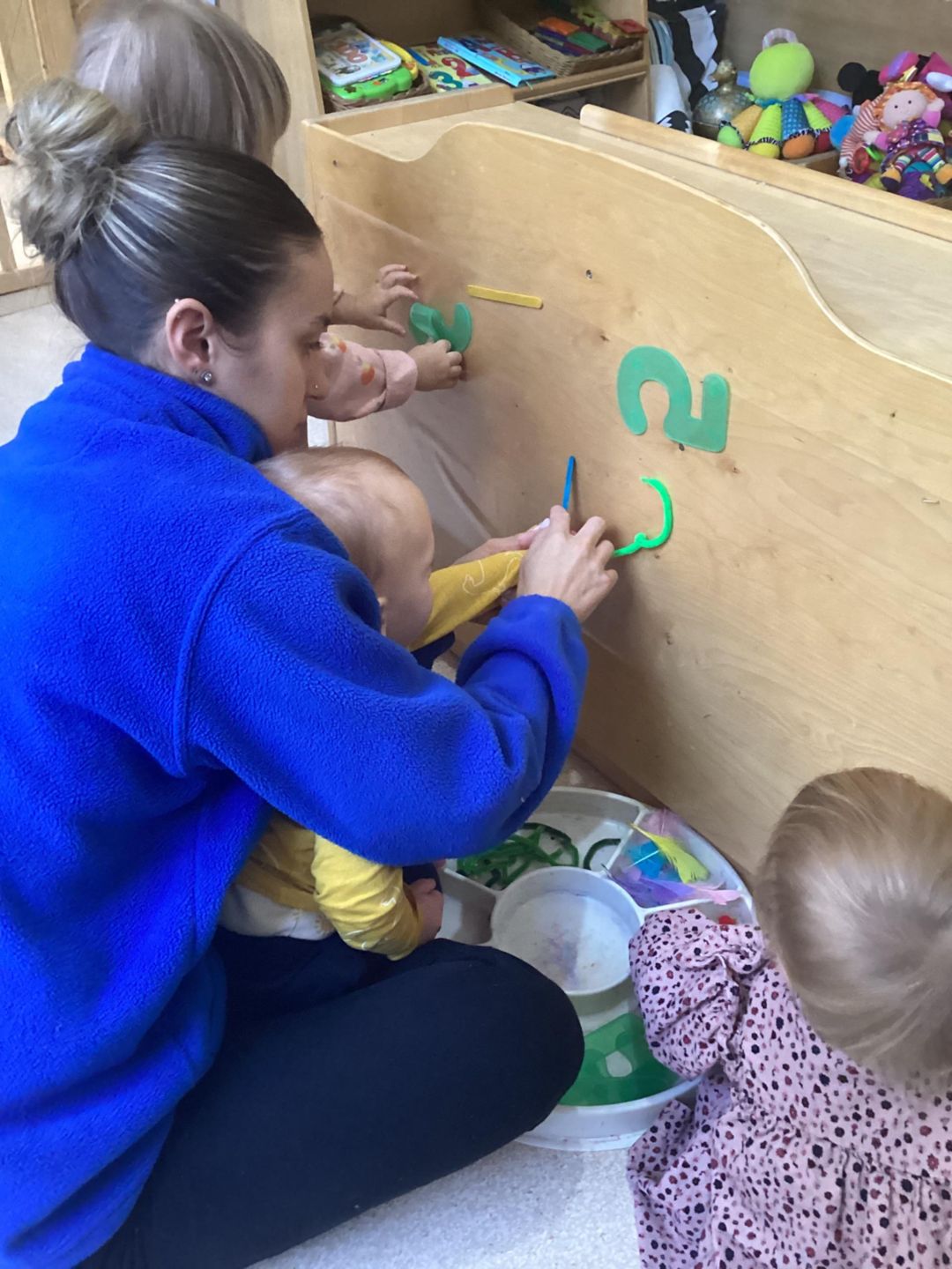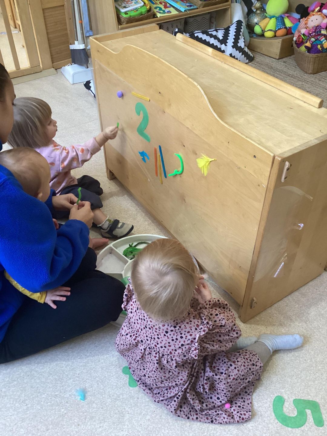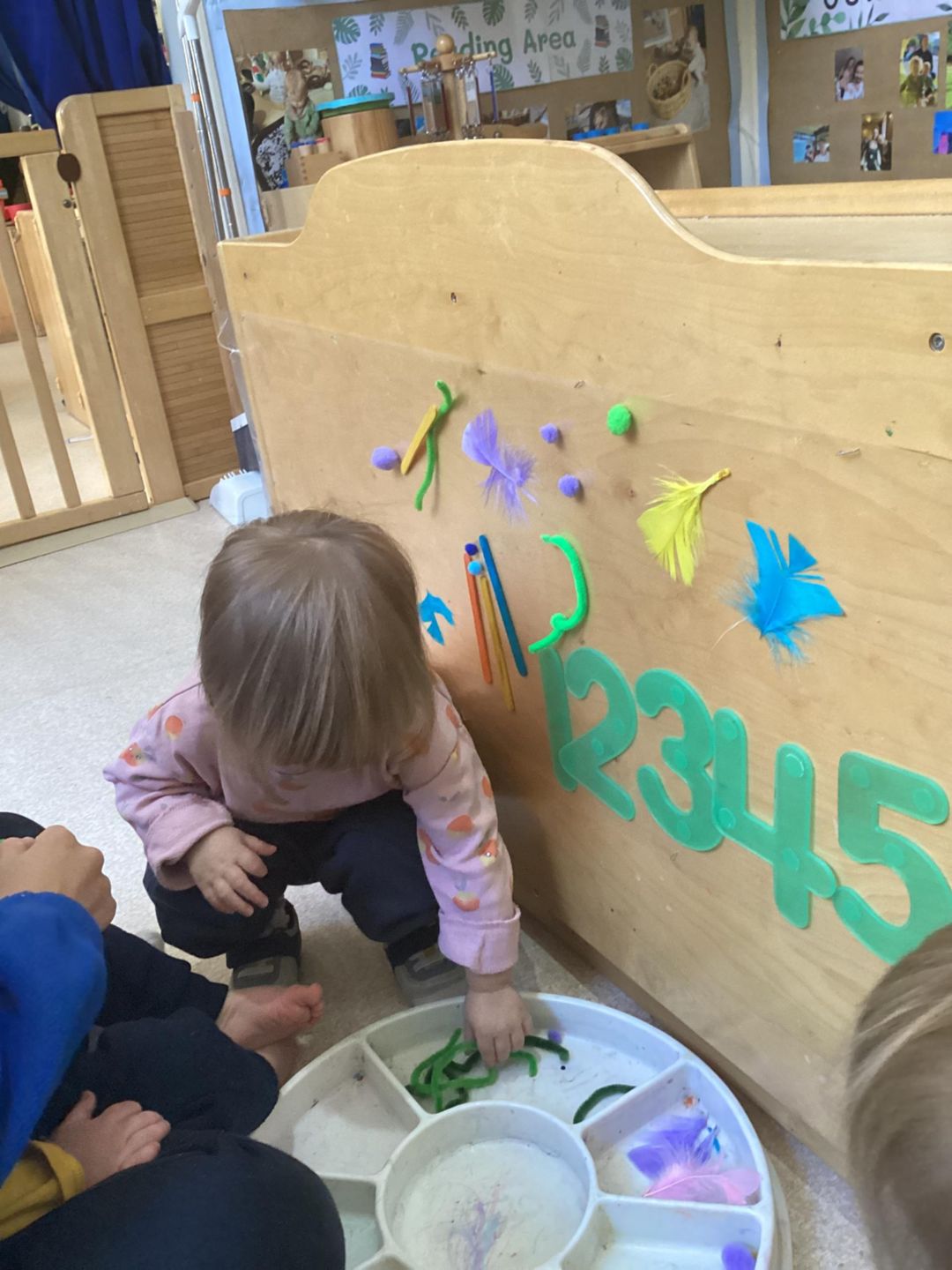 Today in the baby room, the children enjoyed a fun and sensory-rich activity using our clear sticky sheet, which we placed securely behind the cabinet at their level. The babies were immediately curious, reaching out to explore the new texture with their hands. We offered a selection of soft pompoms, numbers, and feathers. The children loved pressing the items onto the sticky surface and discovering that they stayed in place. Some gently patted the pompoms, others giggled as the feathers stuck with the lightest touch, and a few carefully chose numbers to add to the display. The babies engaged for a long time, returning again and again to move items around or add new ones. It was a lovely, hands-on way for them to explore textures, colours, and early numeracy concepts in a playful, creative environment.