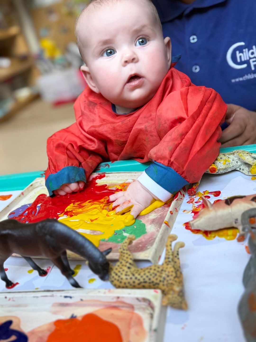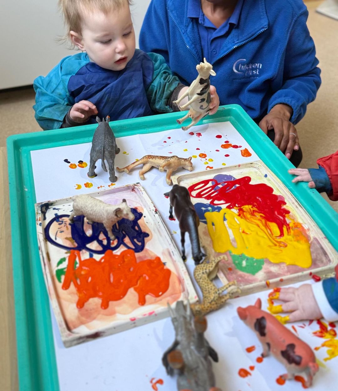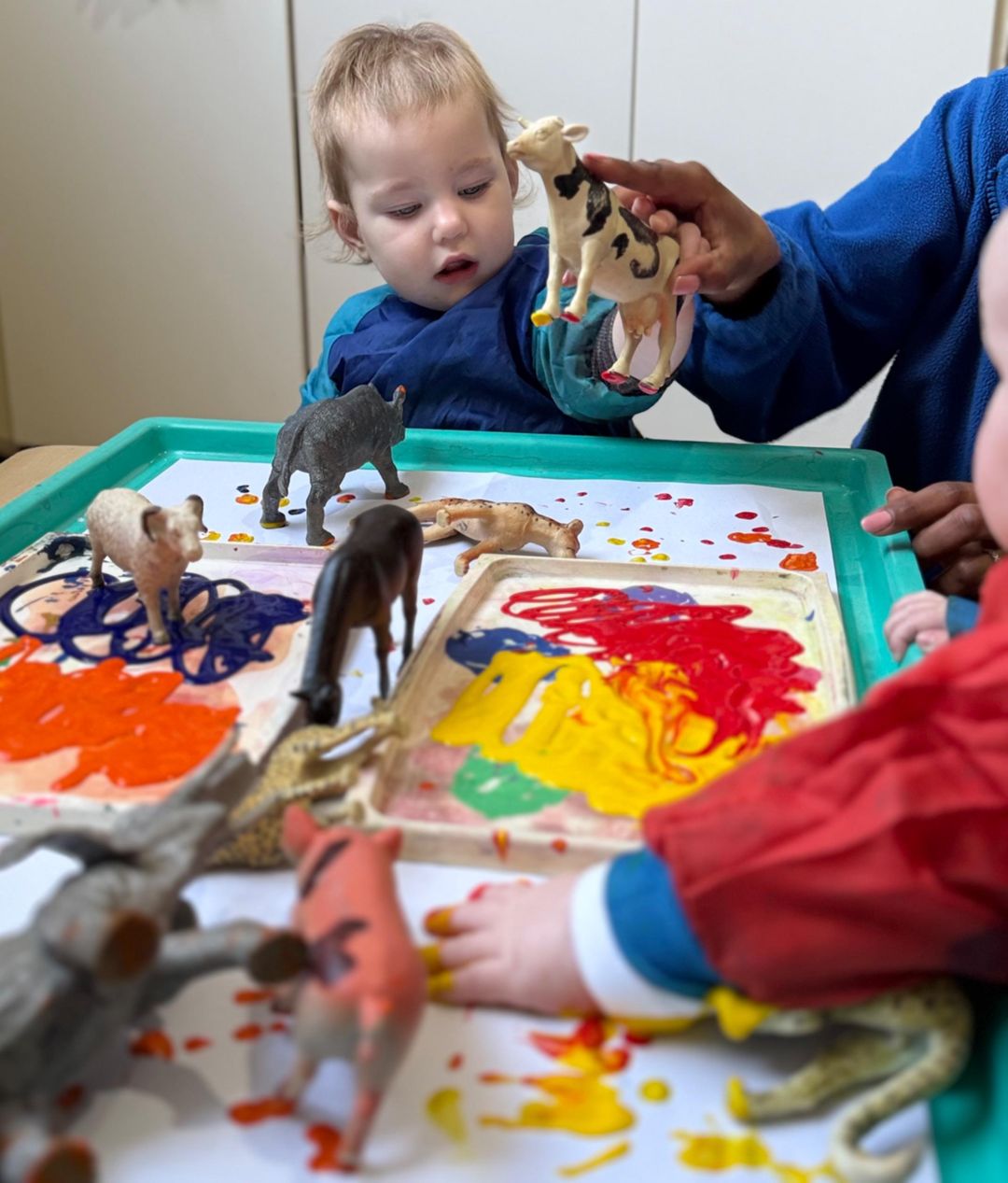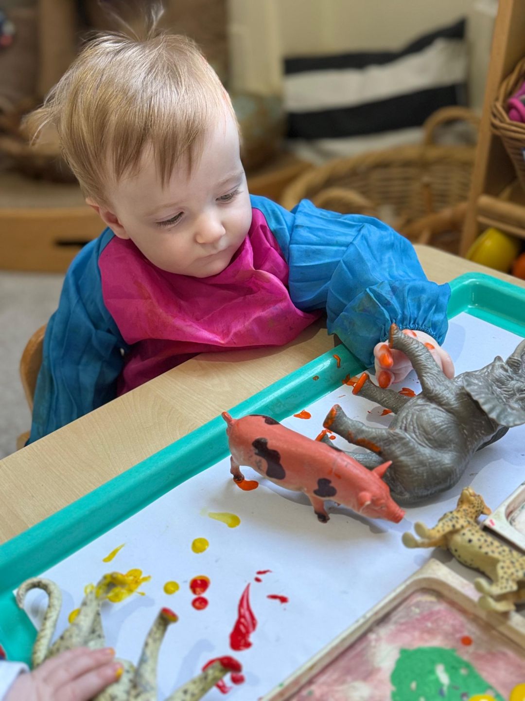 This week we decided to combine one of our children’s interests, animals, with a fun mark-making experience. We set up a shallow tray with paper, paint, and a selection of animal figures, encouraging the babies to create animal footprints. The babies were very engaged, happily stomping, moving the animals, and smearing the paint across the paper. Some of the babies enjoyed the experience so much that they wanted to explore further by touching and feeling the texture of the paint with their hands. It was a lovely sensory activity that encouraged curiosity, exploration, and creativity throughout.