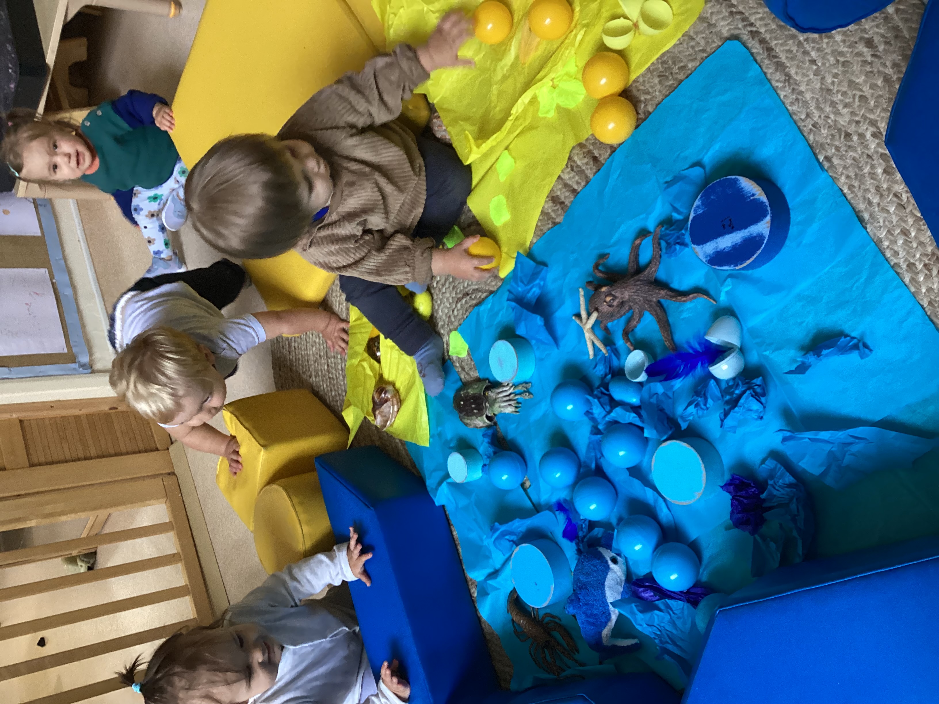 To start our summer blog we made a soft play sensory beach, we used different resources and textures for the children to explore. The children thoroughly enjoyed using their senses to discover and play. They developed their gross motor skills by climbing in and out of the beach and over the soft play and throwing the balls. They explored risky play by being able to fall back on to the soft play and finding it very funny. They also crinkled the tissue paper to make rustling sounds and enjoyed how it felt in their fingers. The babies communicated with each other using babbling and single words to share their excitement with each other.