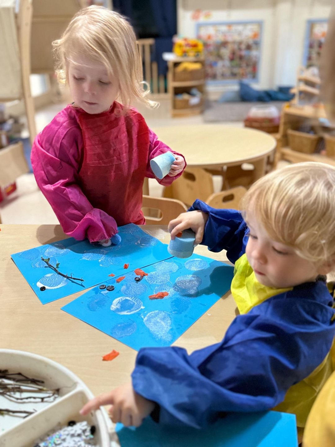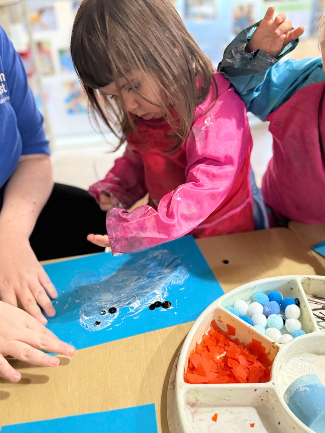 This week, the toddlers enjoyed some wonderful winter-themed art activities. We set out to create our very own melted snow people, using a variety of materials found around the nursery. The children began by exploring different textures—circular sponges dipped in white paint, colourful fabric pieces, buttons, and even sticks that we collected from the garden.