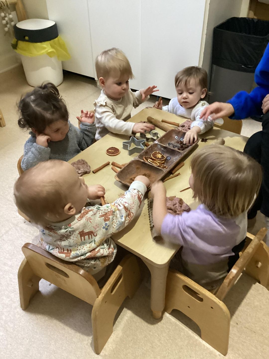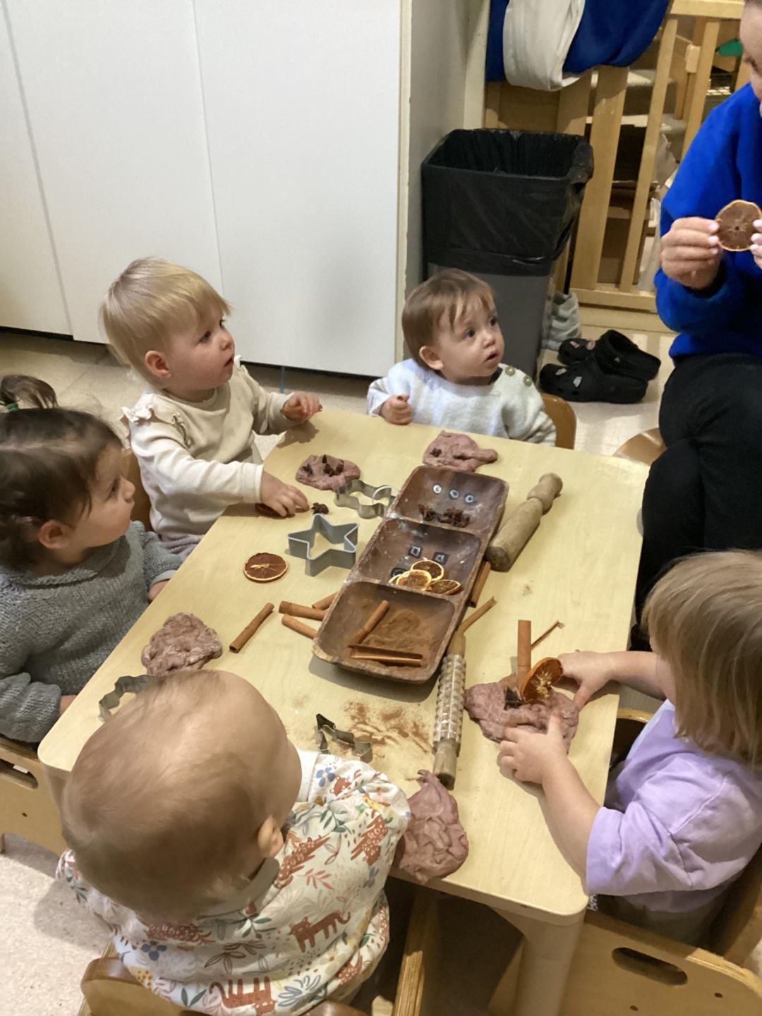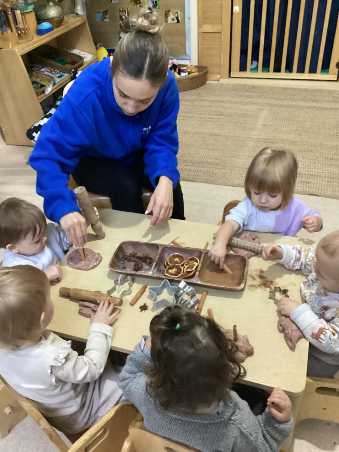 The babies in the baby room enjoyed exploring Winter spice playdough. We provided brown playdough along with dried orange slices and cinnamon, which the babies added and mixed in, using their hands to squeeze, pat, and explore the different textures and scents. Rolling pins were available to encourage pressing and rolling movements, supporting the development of fine motor skills while engaging the babies’ senses through smell, touch, and sight.
