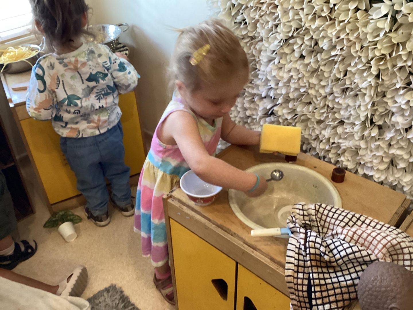 The Ladybirds explored a real working kitchen in the home corner. The children were able to explore cooking real food and using tools and equipment such as spoons and tongs. They were also able to keep the kitchen clean and wash up the dishes. The children took on a role in their play offering each other play ques by serving up cups of tea's and food. The children also learnt key life skills.