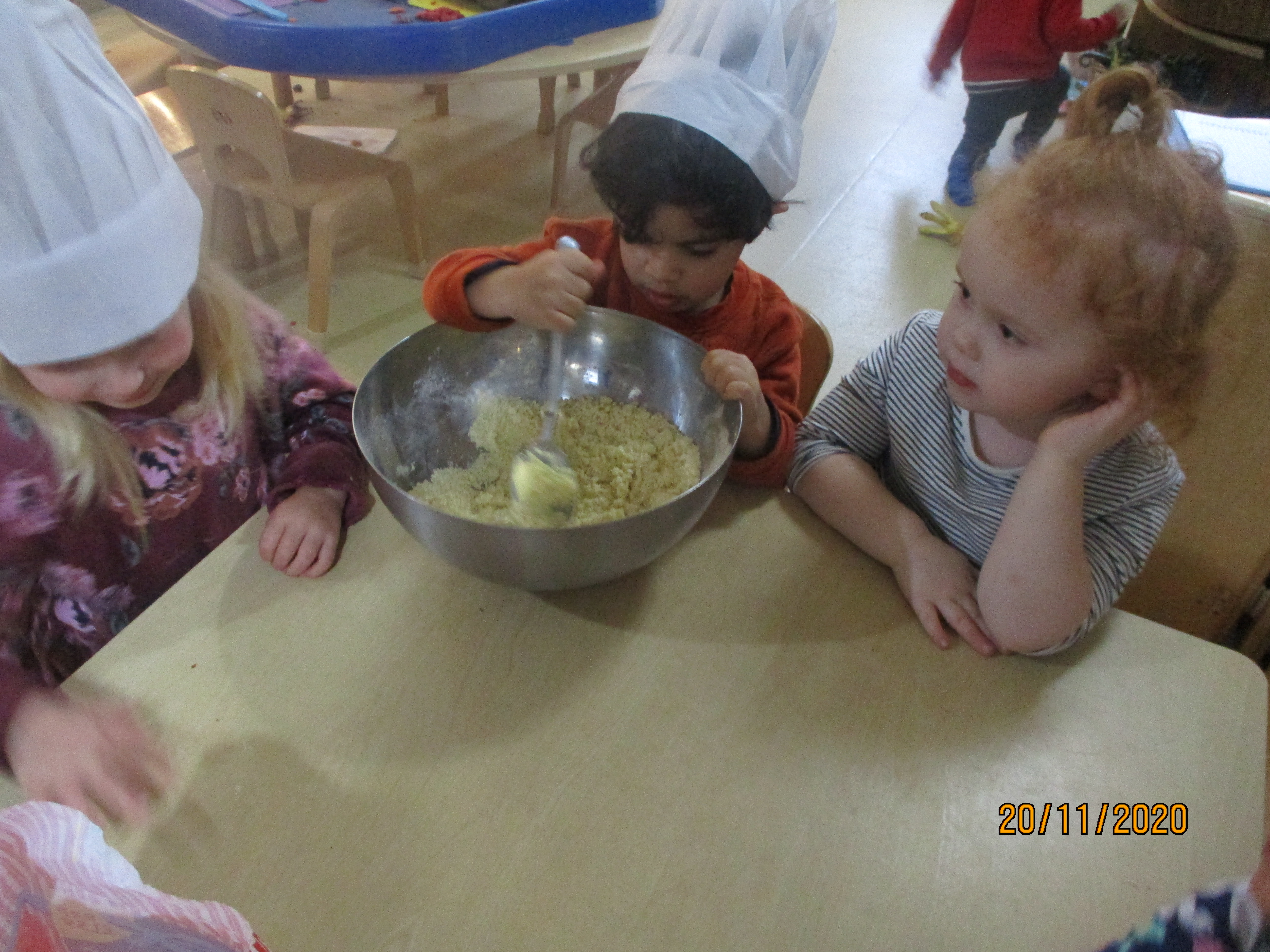 They helped to pour the flour, sugar, butter and raisins into the bowl. They spoke about what the different ingredients were and where they come from.
