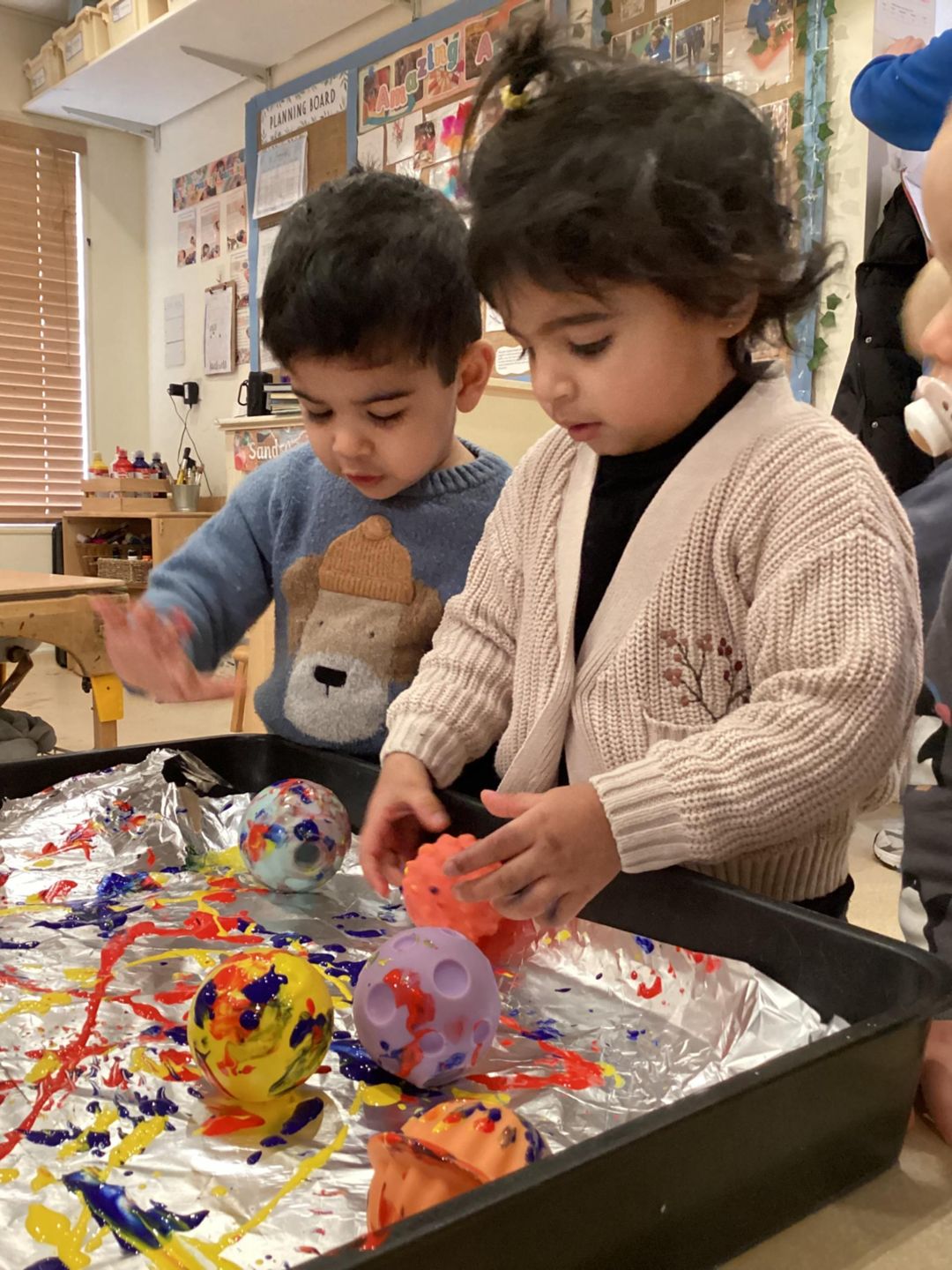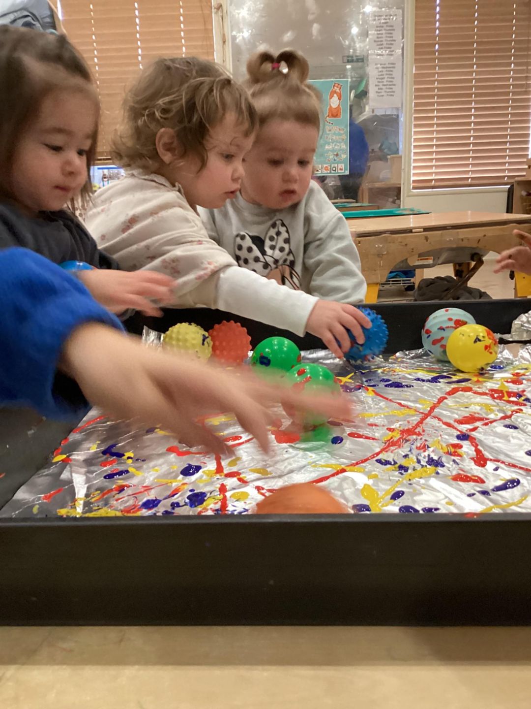 Today the ladybirds had lots of fun exploring our Tin foil, balls and paint. They began to roll, throw and bounce the different textured balls around on the tin foil with different coloured paint on. They spoke about the different colours they could see and we used the words such as ‘bounce’, ‘throw’ or ‘roll’ the balls around on the paint. They really enjoyed getting messy!
