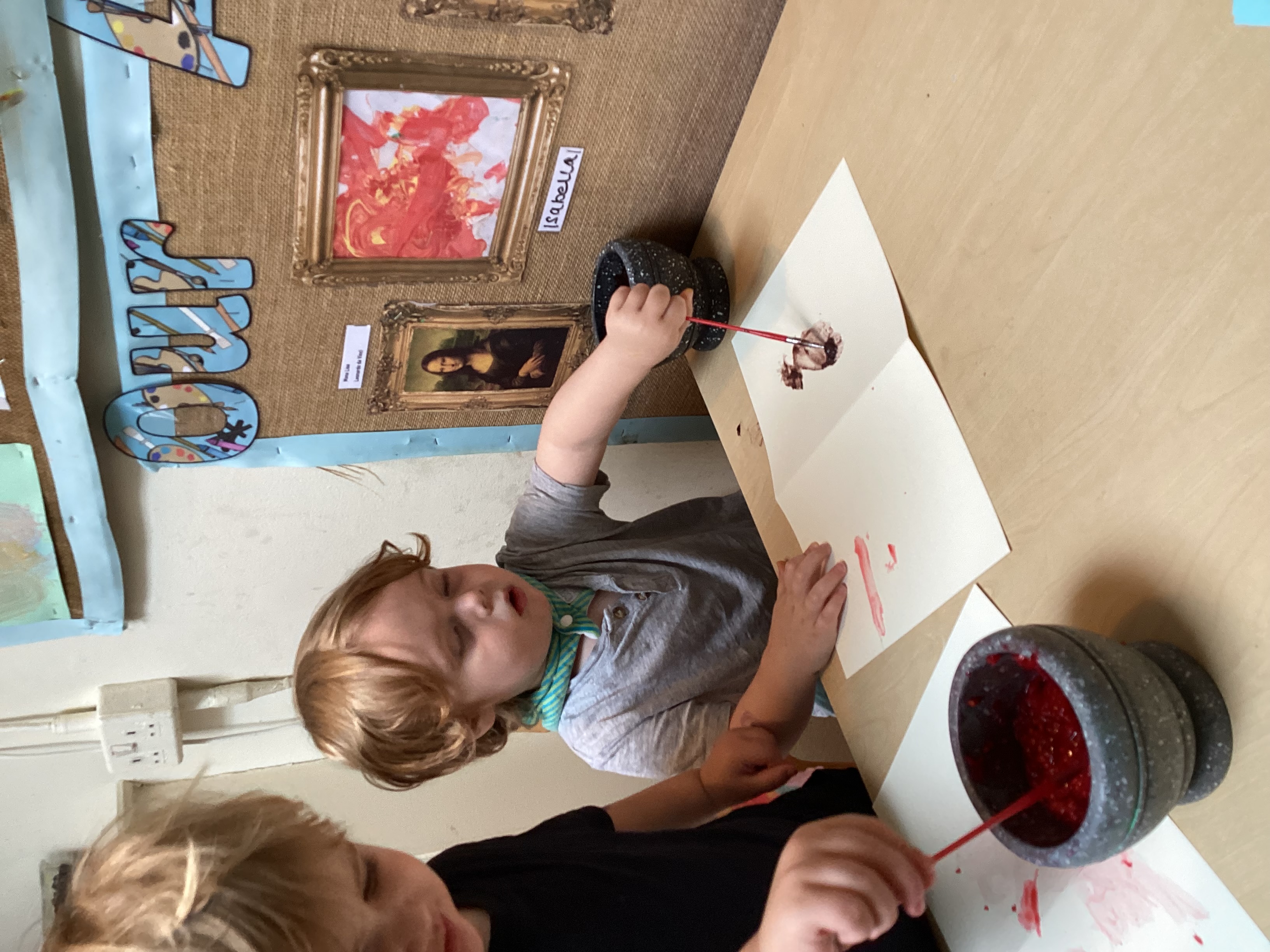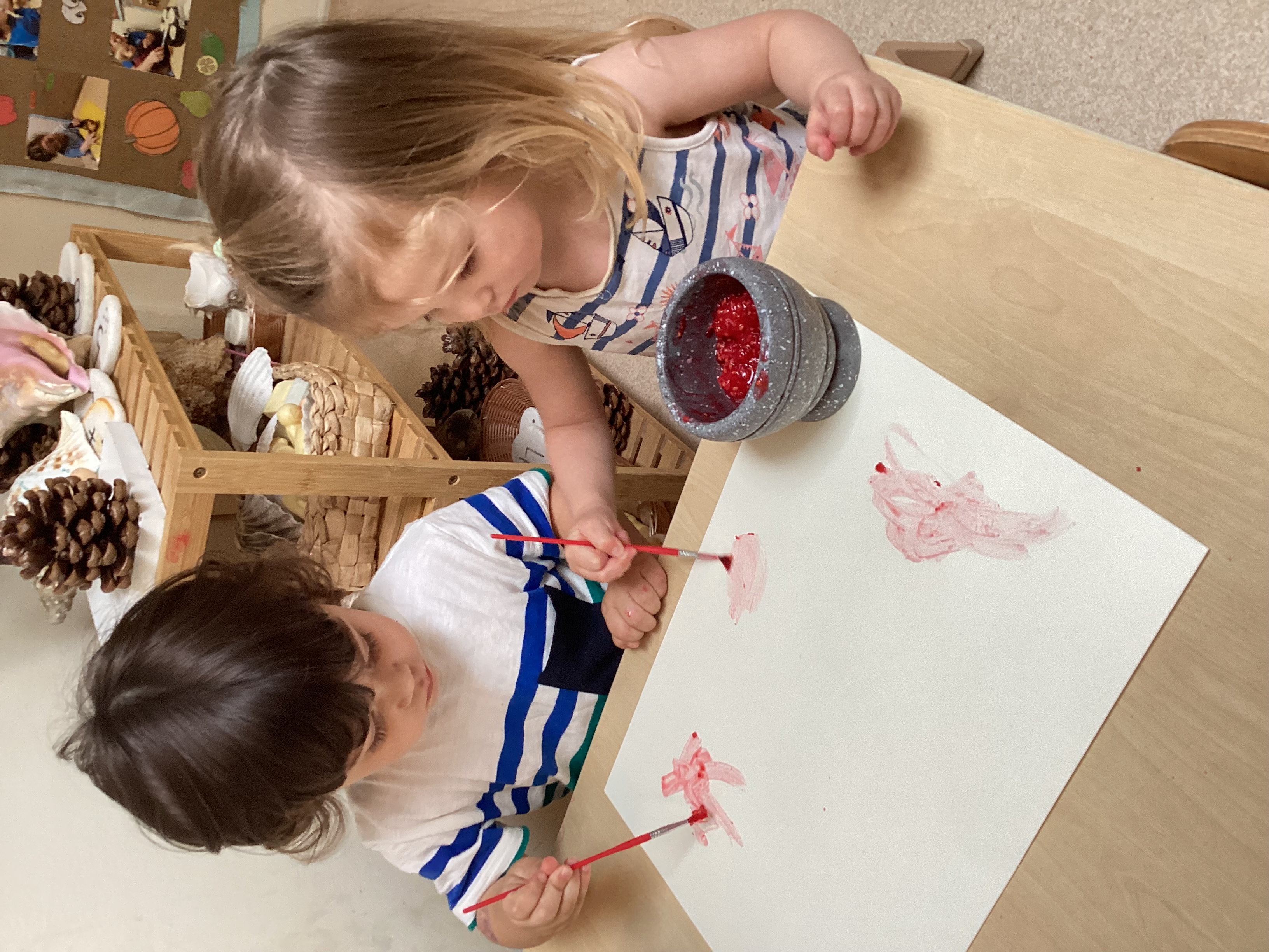 Once the berries had been mushed up the children used the juice to take part in berry painting. They used small paint brushes to dip into the juice and make marks on the paper. Discussing the marks the berry juice made and talking about what they were painting. Grasping the paint brush in palmer, tripod and pincer grasps.