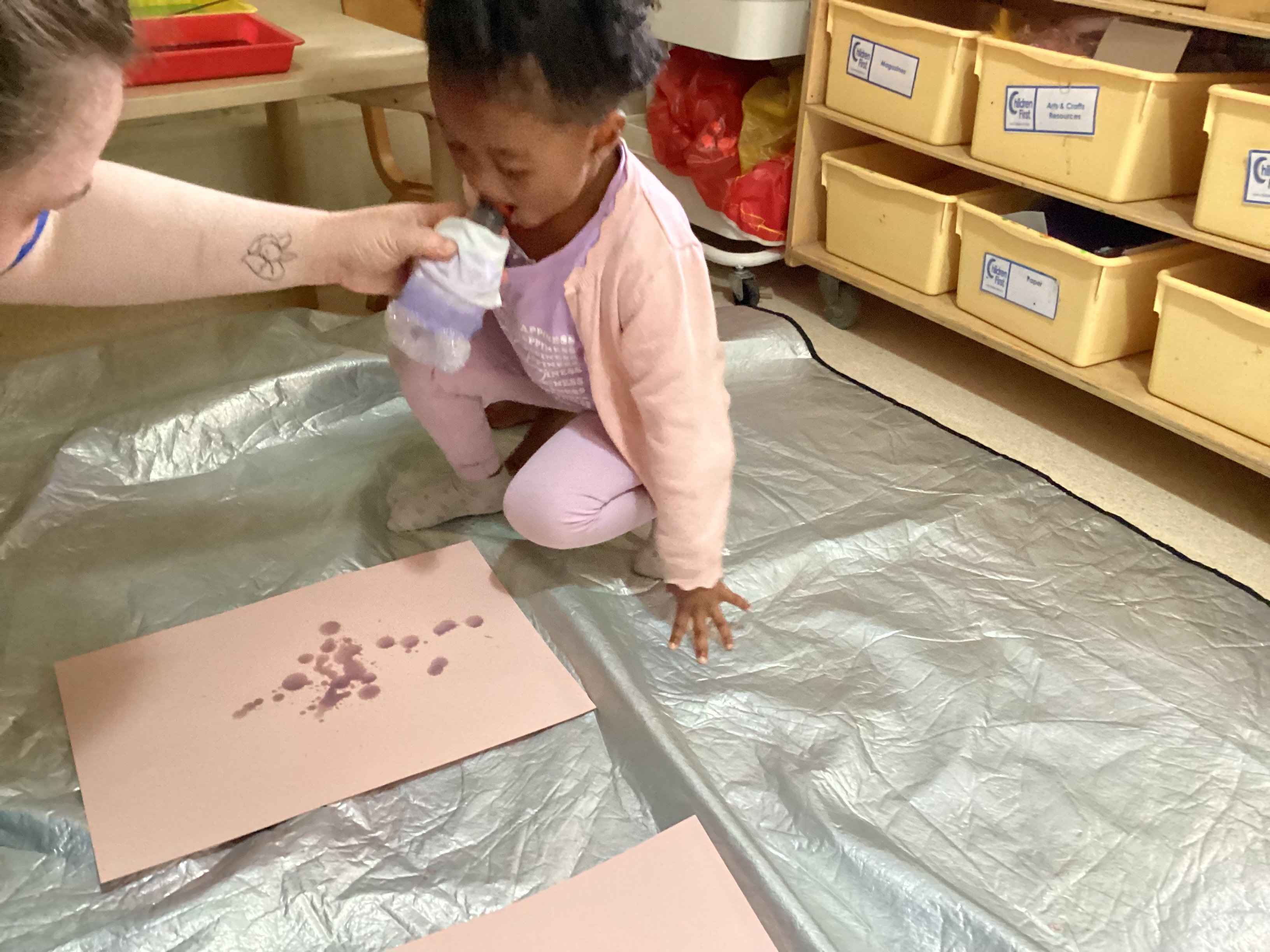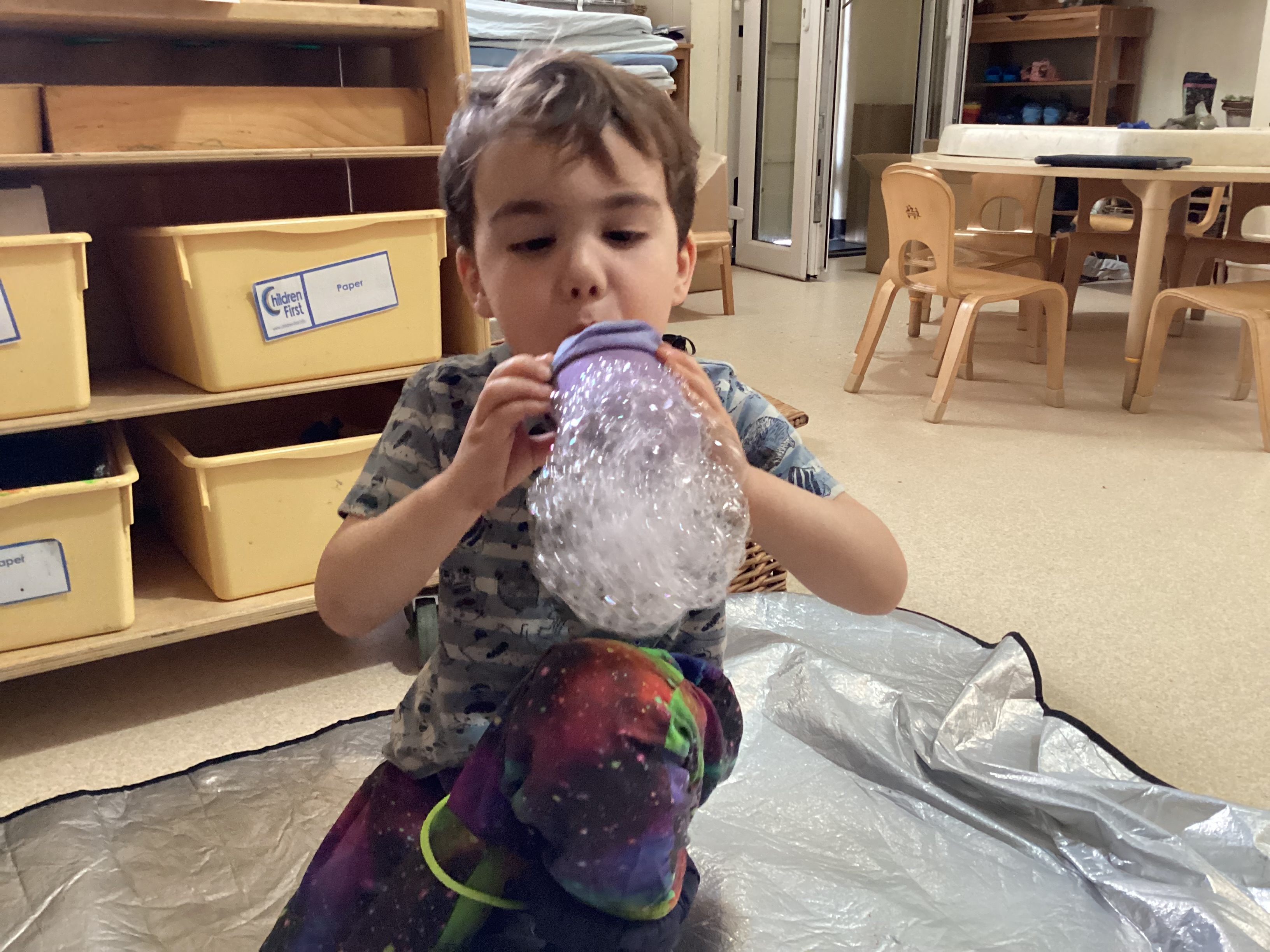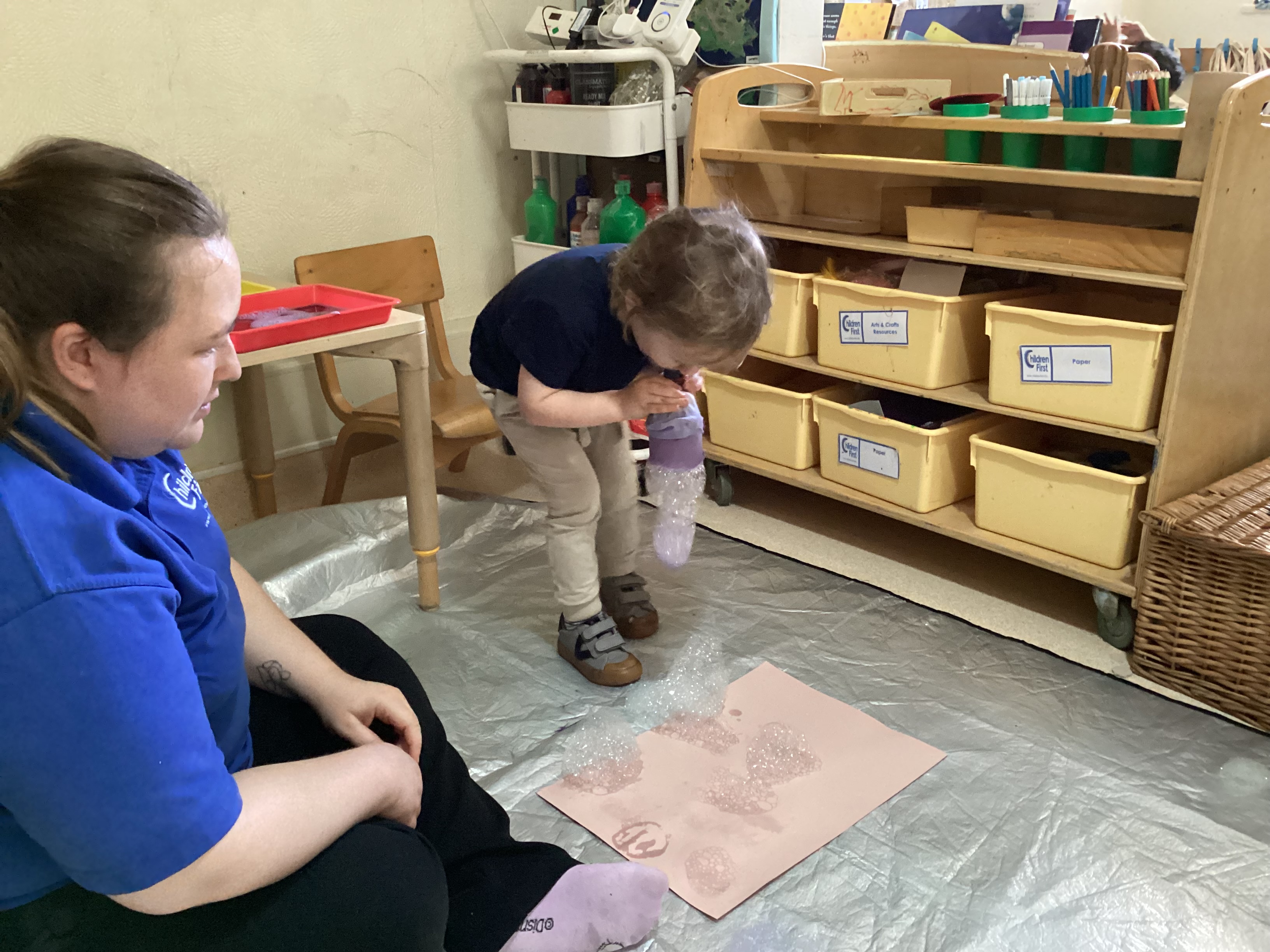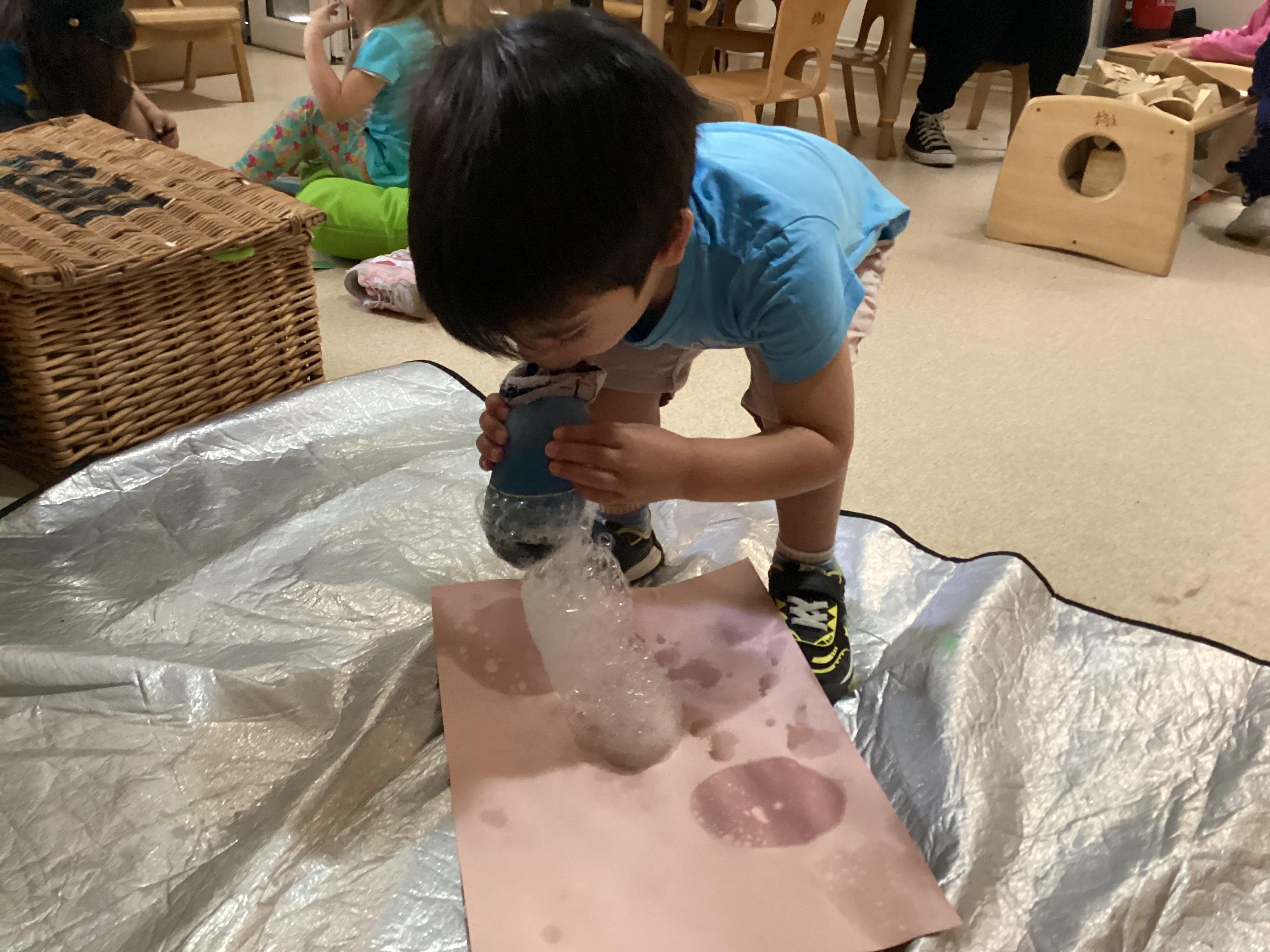 The Grasshoppers explored blowing bubbles through a bottle. They started by supporting Chelsea to cut the bottles open, carefully managing the scissors to manipulate them to cut the bottle. Once this was done the children dipped the bottles into bubbles solution and had the opportunity to blow through the bottles and create bubbles. Children tried hard continuing to practice when difficulties occurred. Children used the muscles in their face and mouth to blow hard and create the bubbles. Continuing to try and practice until larger and larger bubble trains were created The children were elated and excited with what they produced.