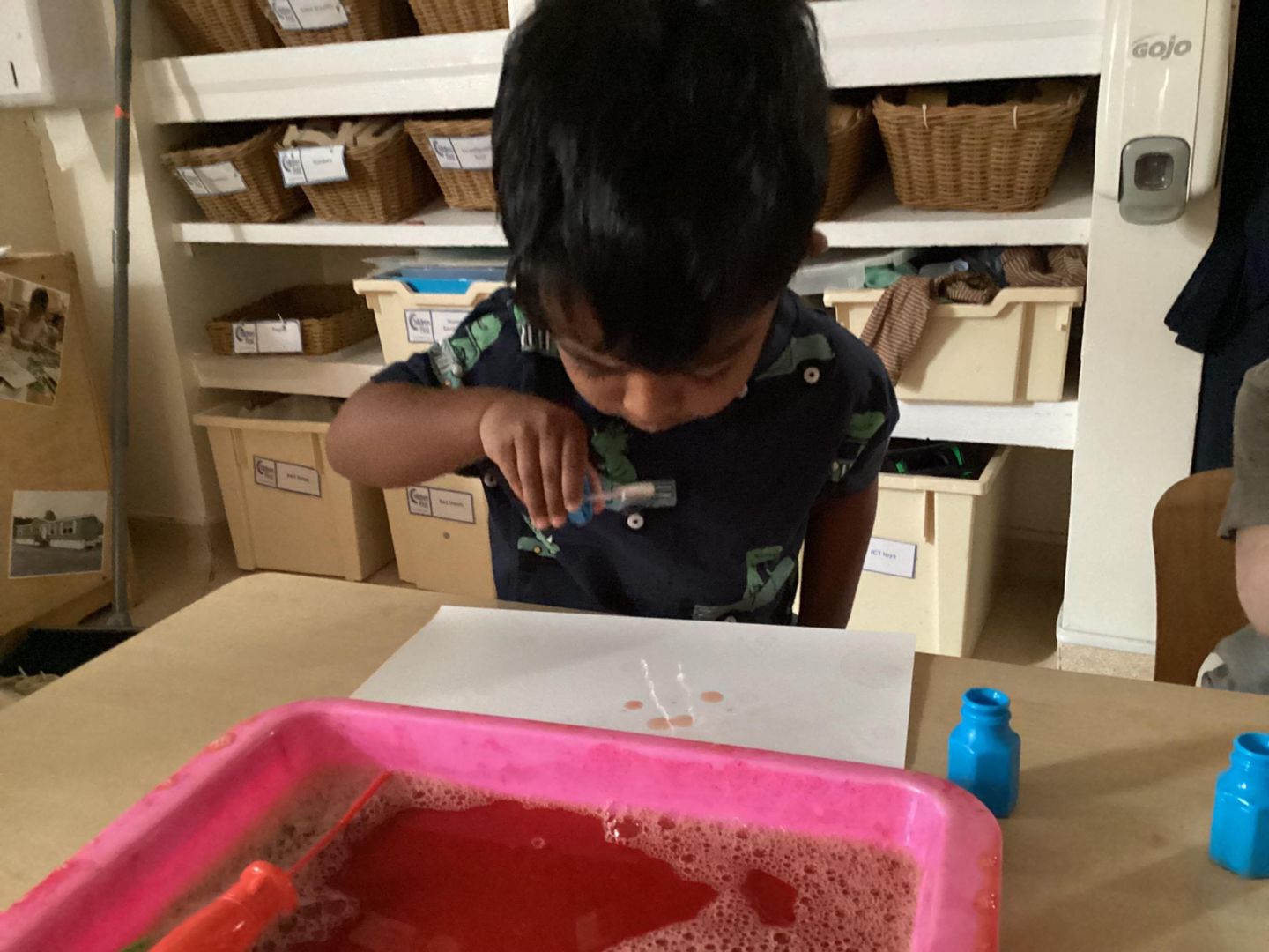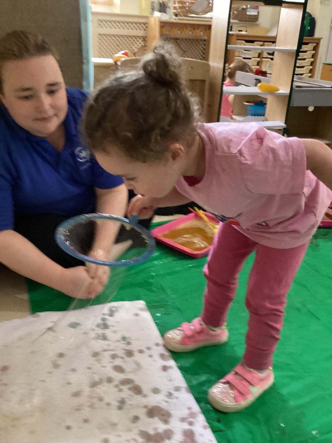 This week, the children had fun trying out bubble painting. We experimented with various bubble wands of different sizes and shapes to learn how bubbles are formed. After creating bubbles, we engaged in two painting activities using them. The first involved a collaborative effort to make a group artwork by blowing bubbles onto the wall or floor. Following this, we worked on individual pieces. The children had a great time blowing bubbles, observing them move and burst on the paper, and admiring the transfer of colours from the bubbles to the paper.