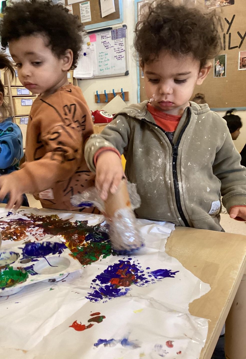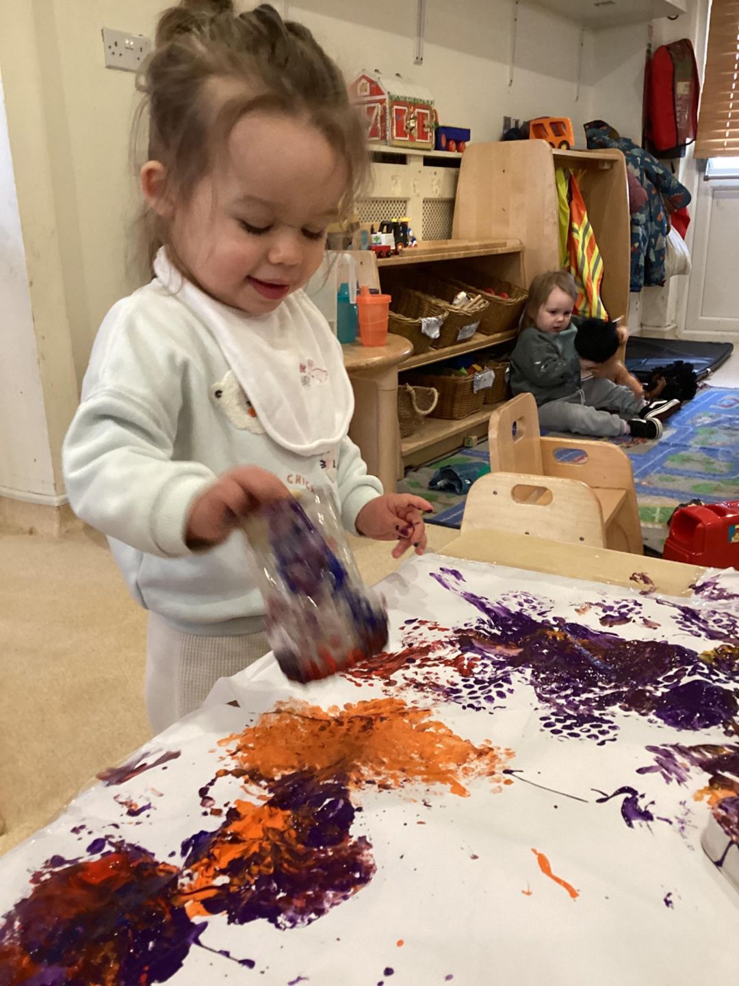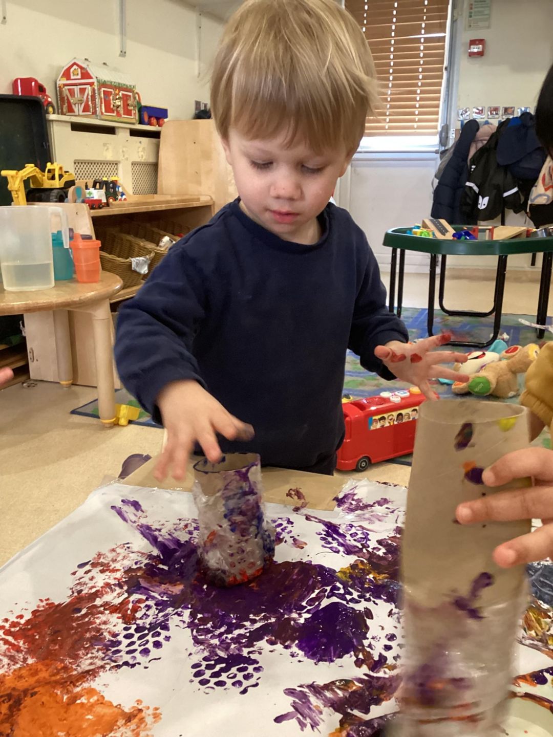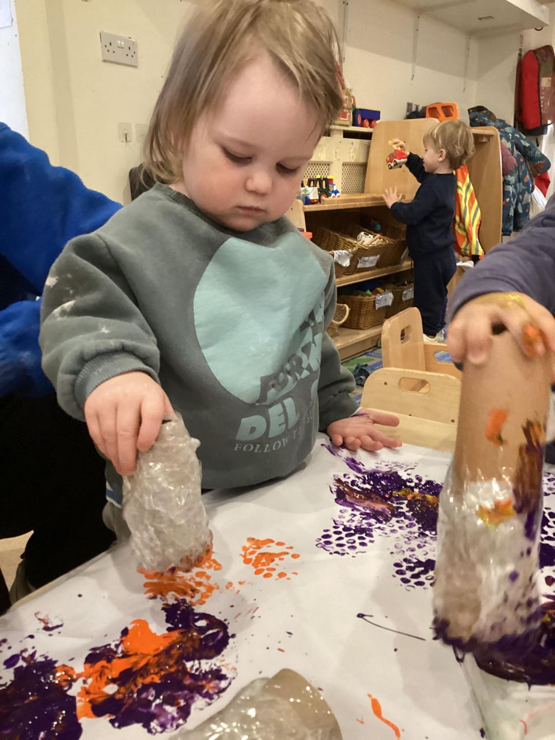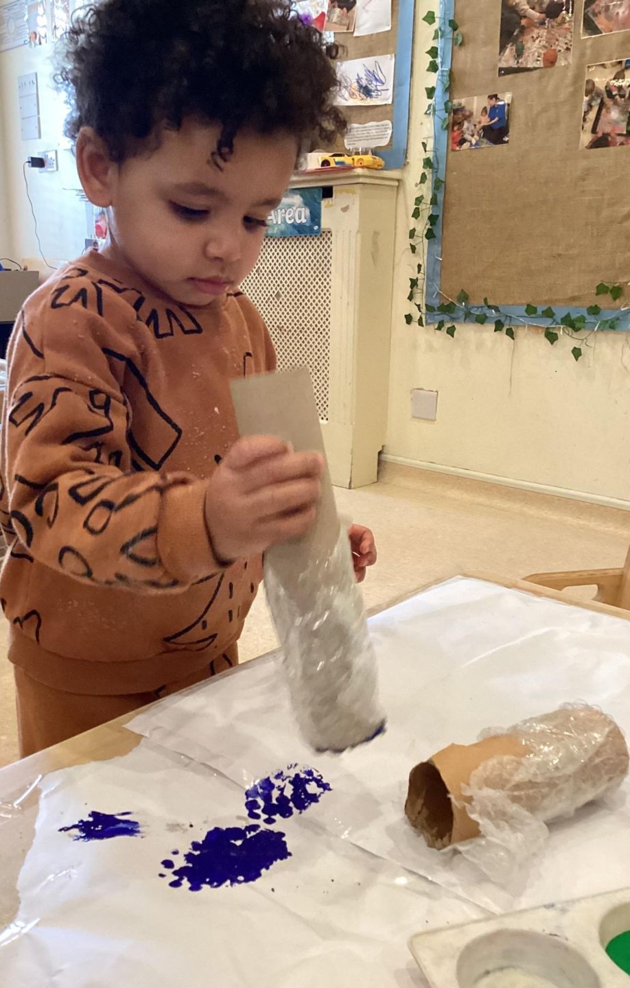 Today the ladybirds really enjoyed our bubble wrap painting using recycled tubes. They used different coloured paint to stamp the tubes covered in bubble wrap onto the paper. We spoke about the different colours they could see when they stamping and recognised the marks they made onto the paper. We used the words ‘bubble’, ‘pop’, ‘stamp’ etc.