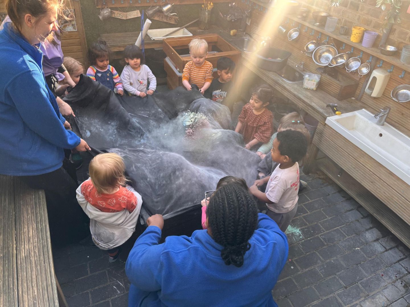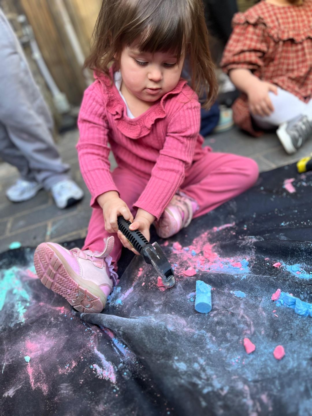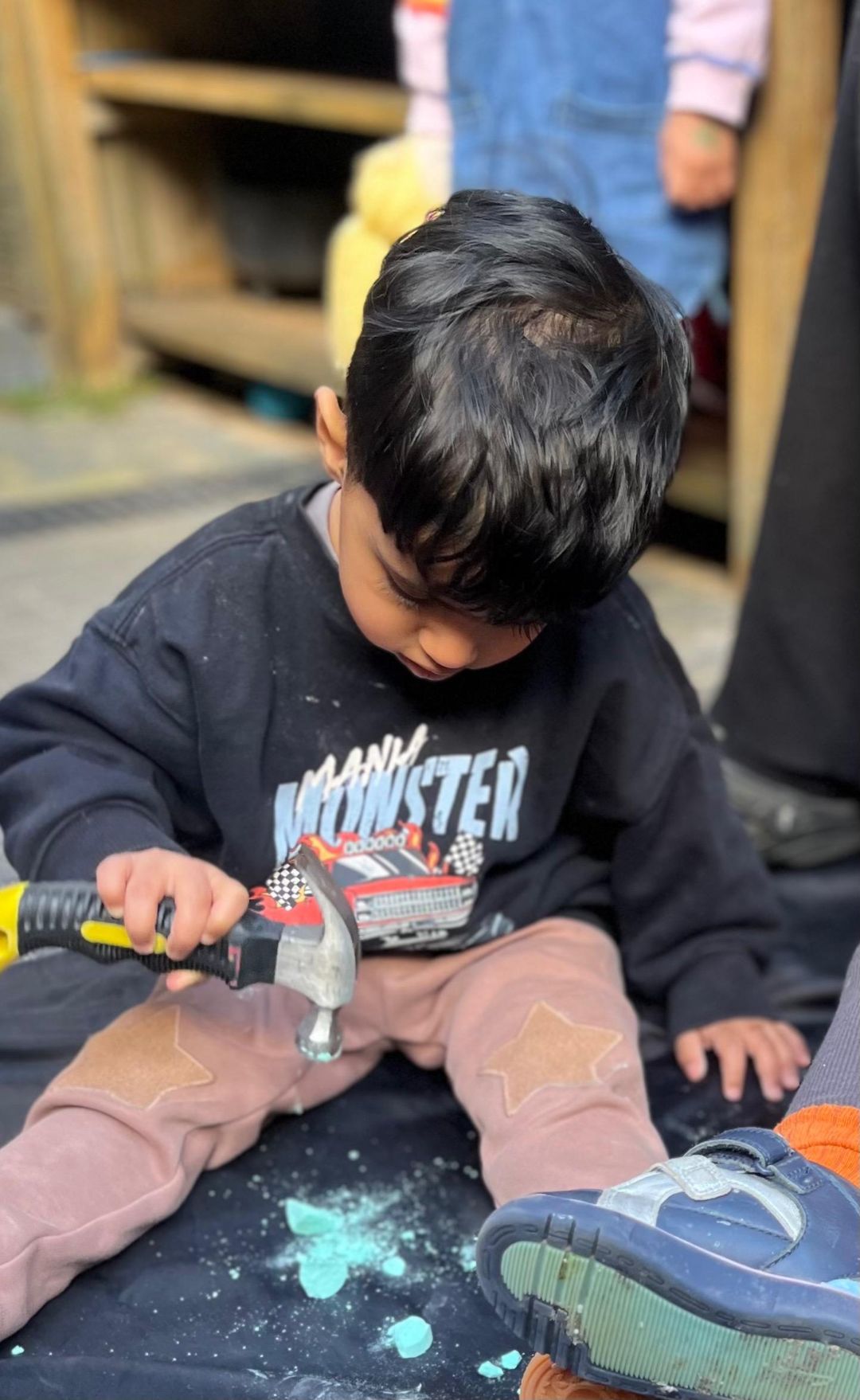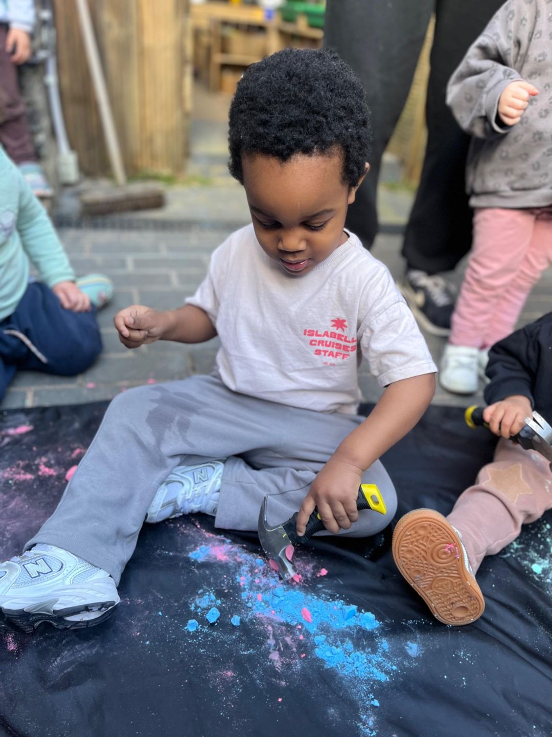 The butterflies had lots of fun in the sun with some risky play! The children carefully used the hammer to crush their chalk pieces to create marks on the black material sheet. The practitioners spoke to the children first about being very careful with the hammers and not running near the activity. The children excitedly took the hammers with practitioners support and showed enjoyment at being trusted to use the adult resource. The children manipulated the hammers in a palmer grasp using both one and two hands to move the hammer up and down to crush the chalk. Hand eye co-ordination was explored as some children held the chalk in place with one hand and used the hammer in the other to smash the chalk. The children demonstrated lovely turn taking with their peers during this activity. After breaking the chalk, the butterflies enjoyed making more marks with their hands/feet and also enjoyed shaking the material to see the colour all their chalk made. Well done Butterflies!