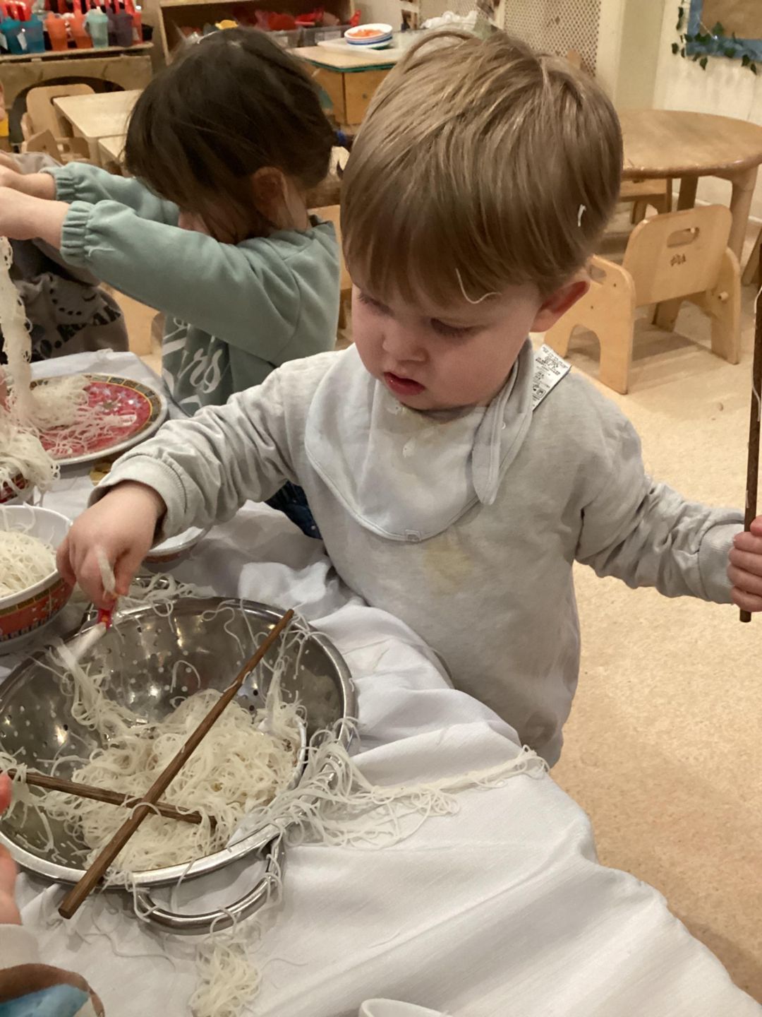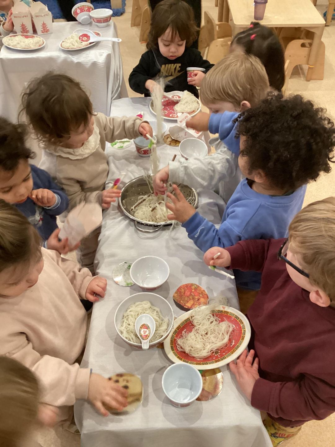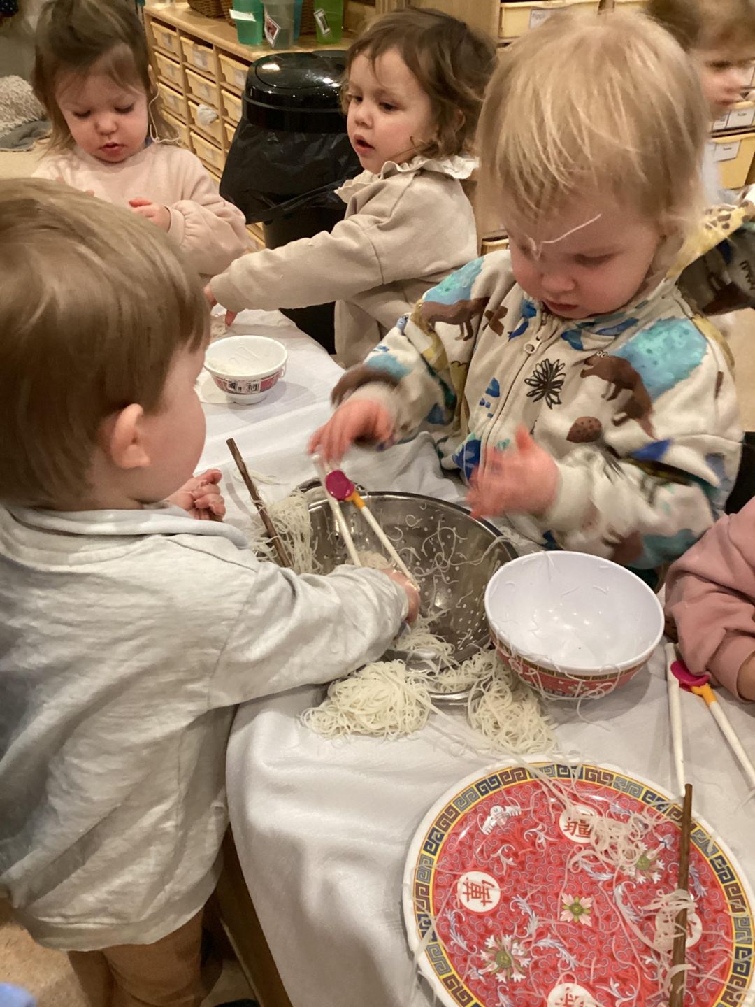The Ladybirds have been busy celebrating Chinese new Year this week! They had lots of fun exploring Chinese-inspired home and restaurant by using different bowls, chopsticks and even real rice noodles. The children were really interested in the noodles and enjoyed having a go at picking them up with the chopsticks. There was lots of pretending to cook, serve food and a little bit of tasting the rice noodles. The ladybirds really concentrated as they practiced using some smaller child friendly chopsticks and challenged themselves by using adult chopsticks also. We did lots of picking up and seeing how long some of the noodles where as we lifted them up into the air. Well done Ladybirds!