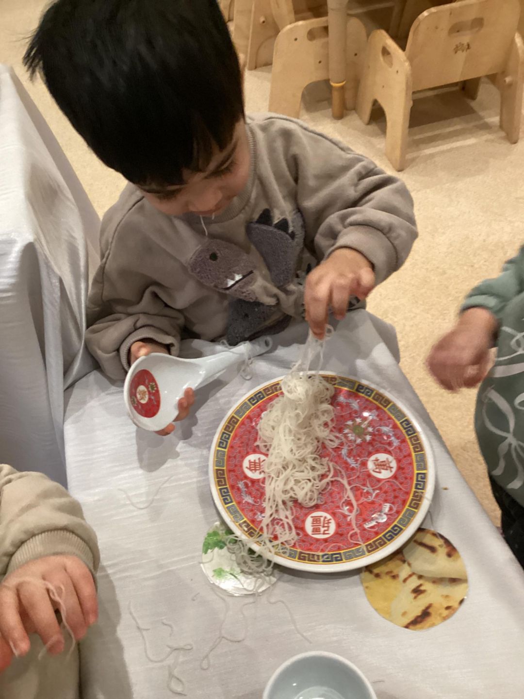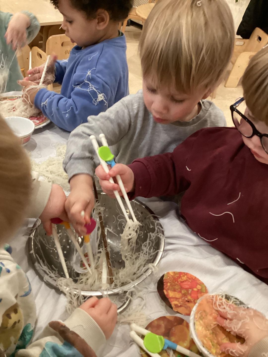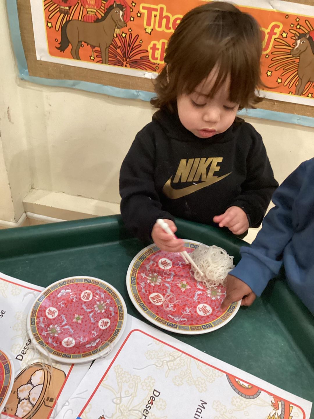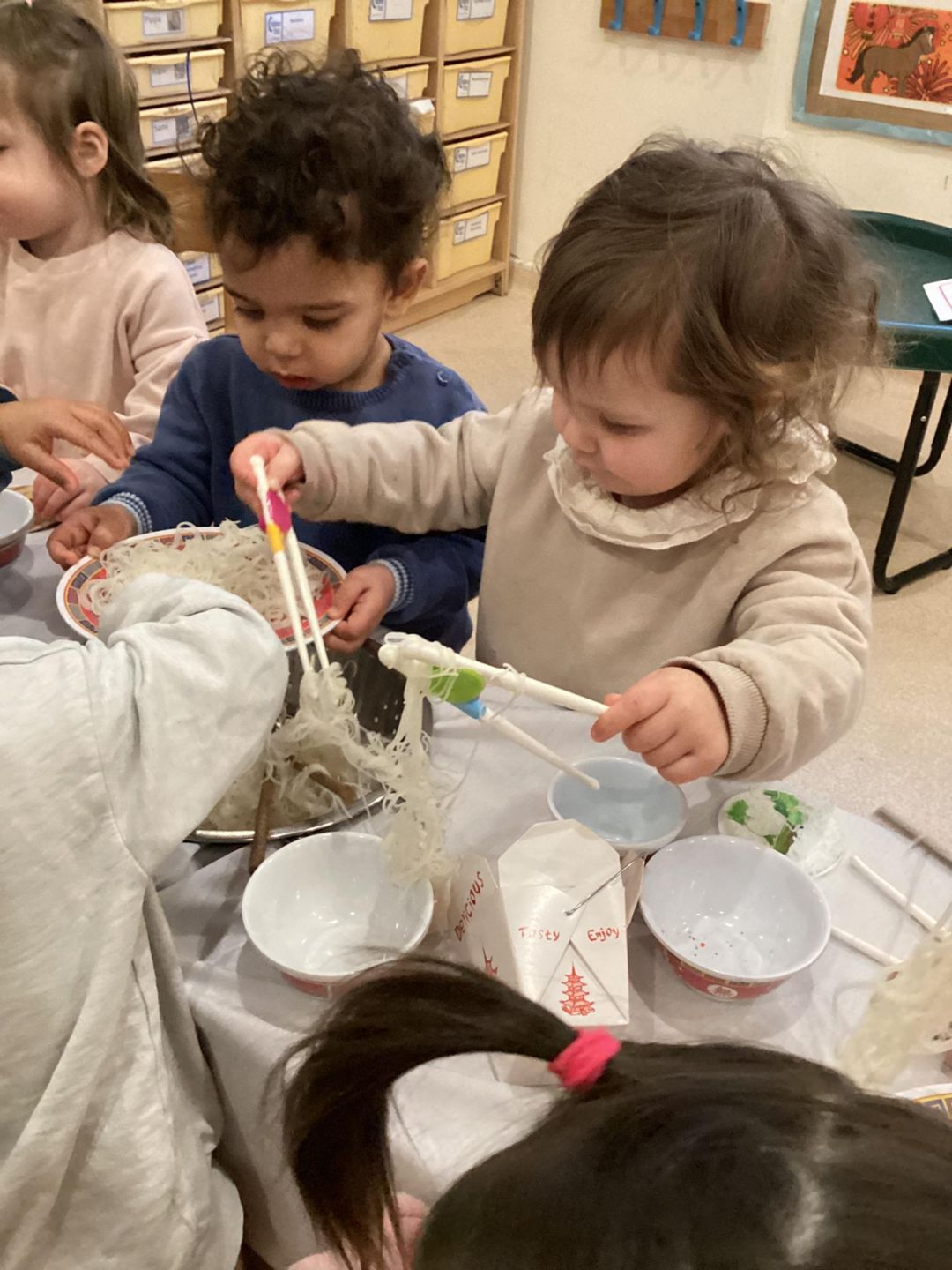 The Ladybirds have been busy celebrating Chinese new Year this week! They had lots of fun exploring Chinese-inspired home and restaurant by using different bowls, chopsticks and even real rice noodles. The children were really interested in the noodles and enjoyed having a go at picking them up with the chopsticks. There was lots of pretending to cook, serve food and a little bit of tasting the rice noodles. The ladybirds really concentrated as they practiced using some smaller child friendly chopsticks and challenged themselves by using adult chopsticks also. We did lots of picking up and seeing how long some of the noodles where as we lifted them up into the air. Well done Ladybirds!