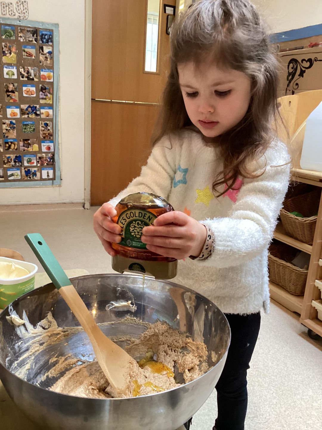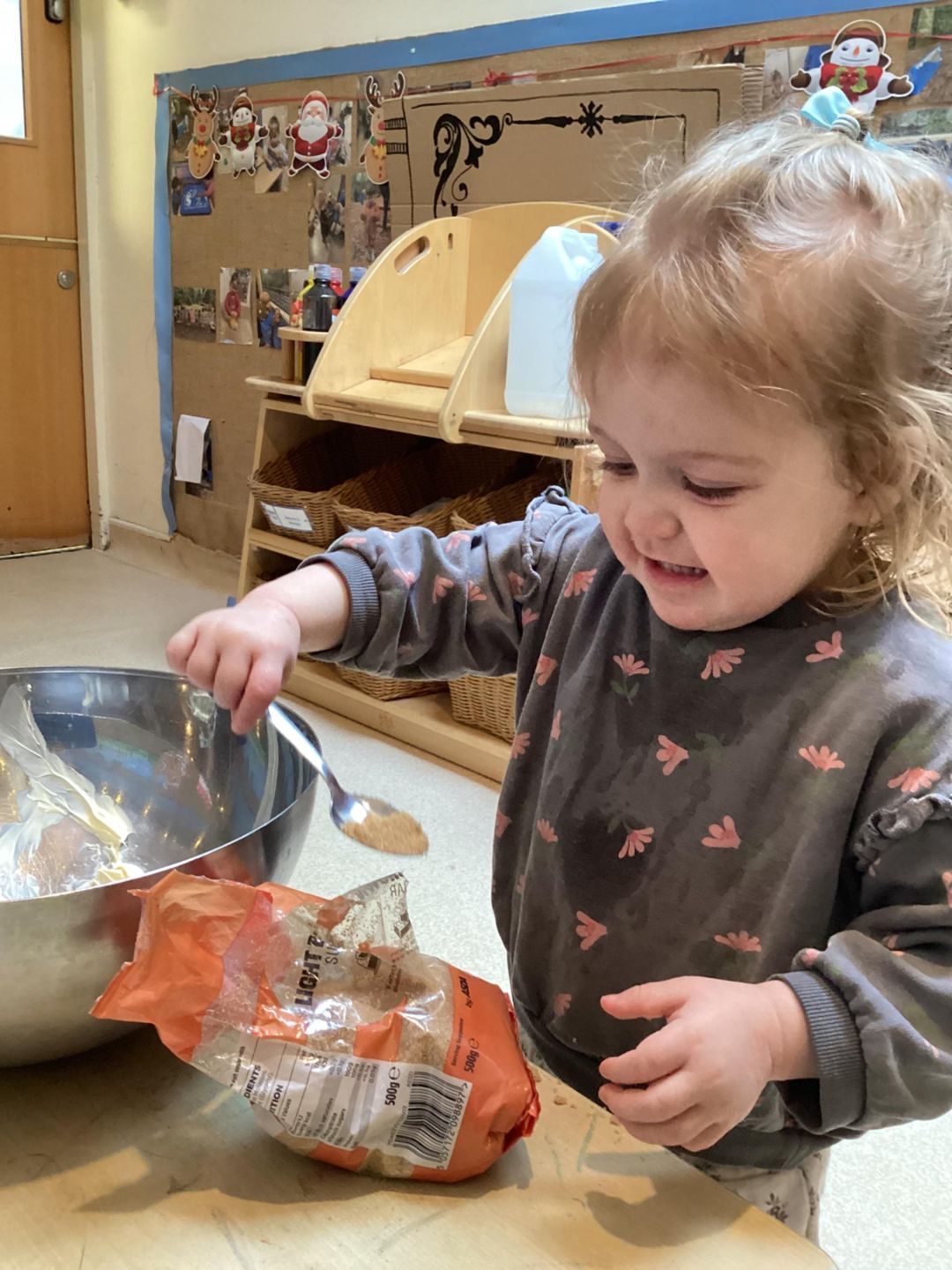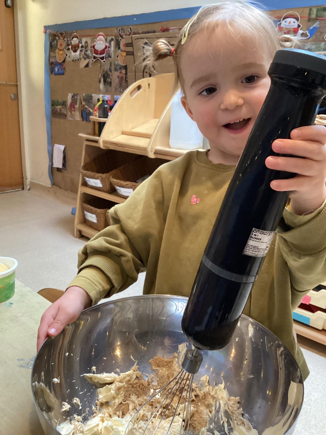 The butterflies had lots of fun assisting Eddie the elf in making some tasty gingerbread Christmas cookies! The butterflies enjoyed mixing the different ingredients together and using resources to make their dough. They used language such as more, less, squash, mix and roll. The children listened brilliantly to the instructions and were able to complete small tasks with little help from the adults! They took turns using the whisk to mix the ingredients and make their own dough.