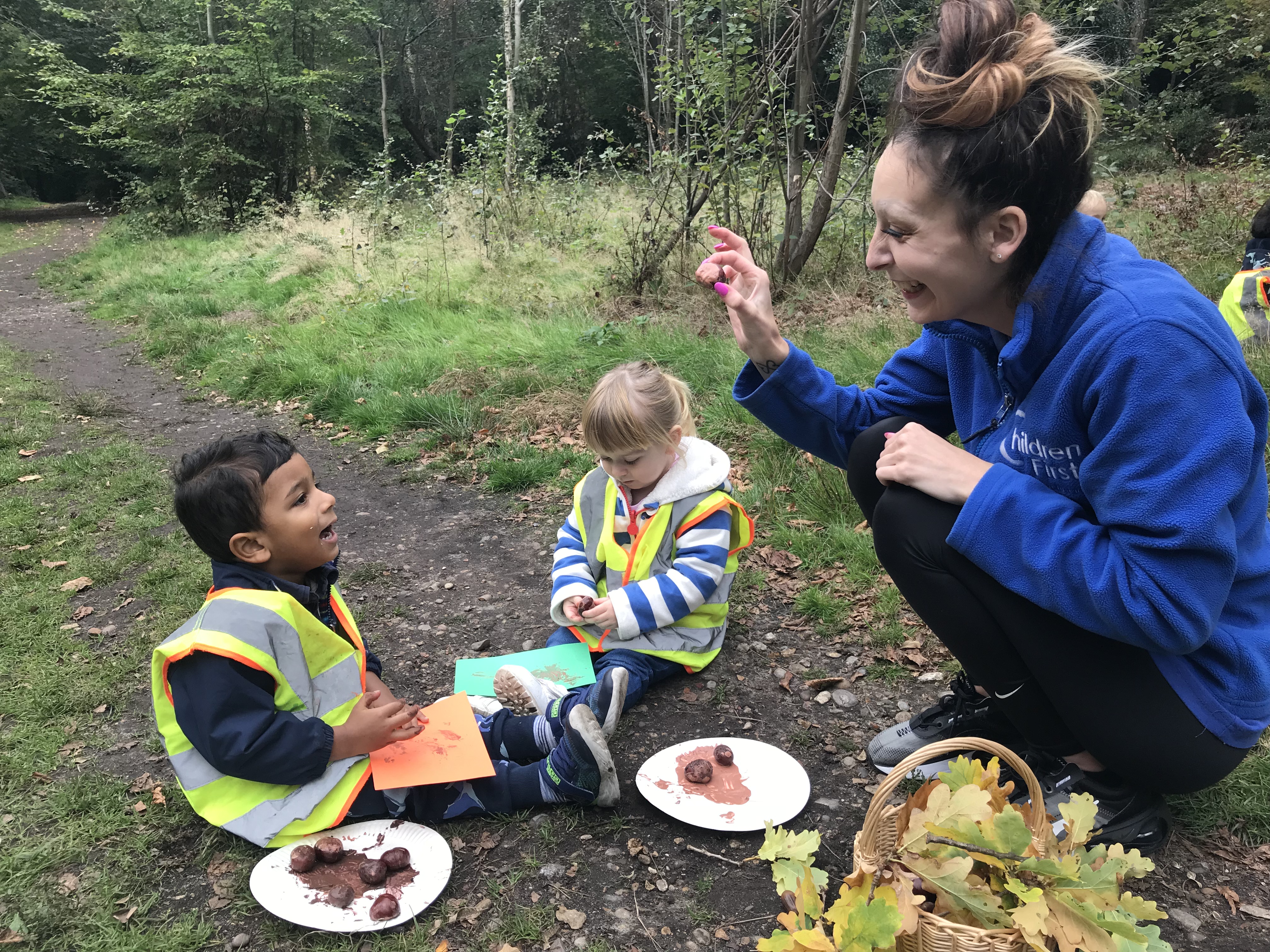 On return to nursery the children used the guttering slops to roll conkers down the slope.