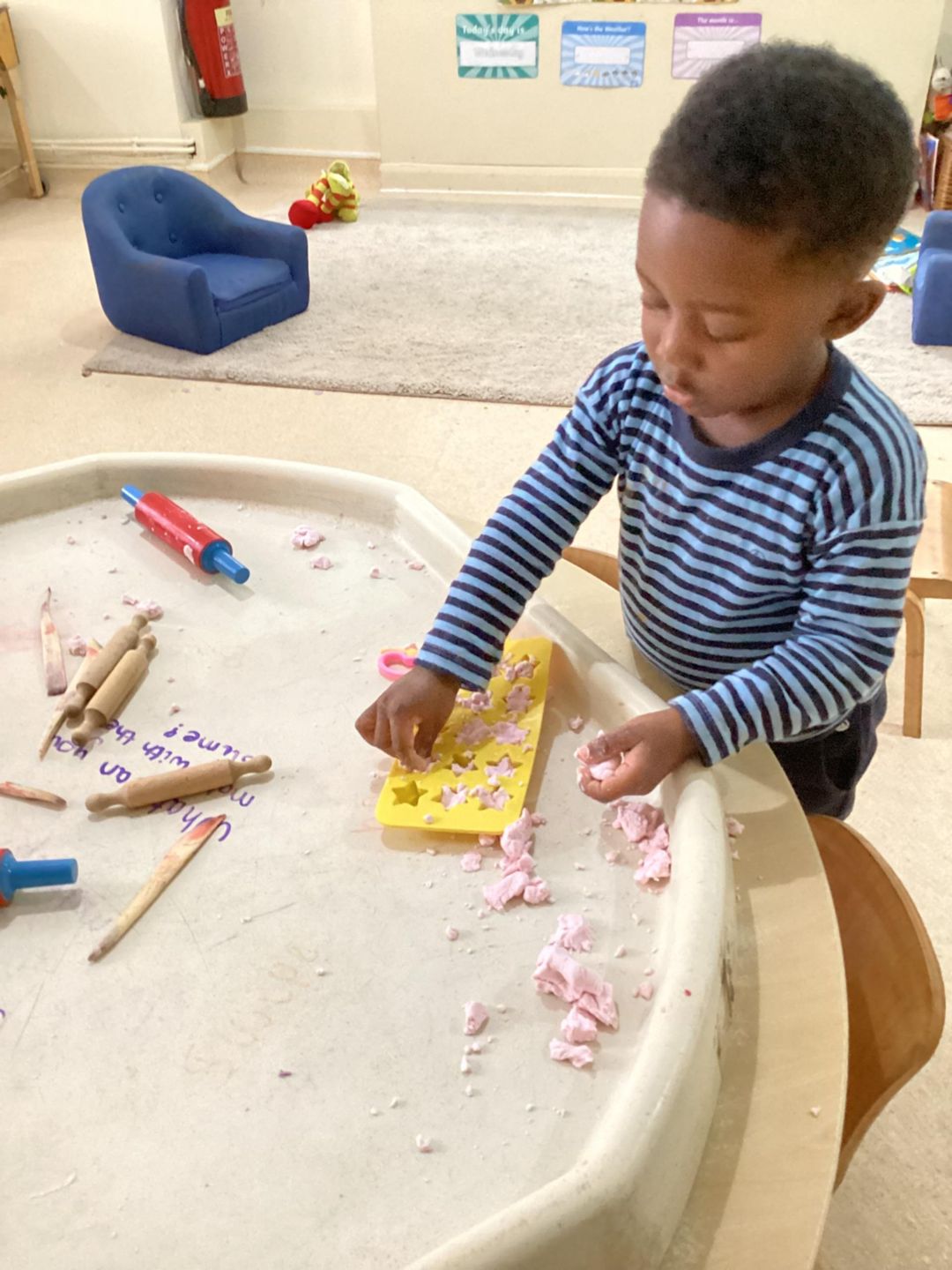 The grasshoppers had a great time making puffy slime with just two ingredients. They each took a turn scooping cornflour and squeezing soap into a large mixing bowl. Passing the bowl around, all the children helped to mix the ingredients until they reached a sticky consistency. When the slime was ready, the children had a blast playing with it. They loved exploring its texture and how it stuck to their hands but could also be moulded, allowing them to shape and stretch it.