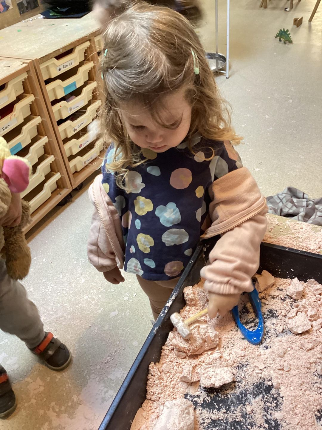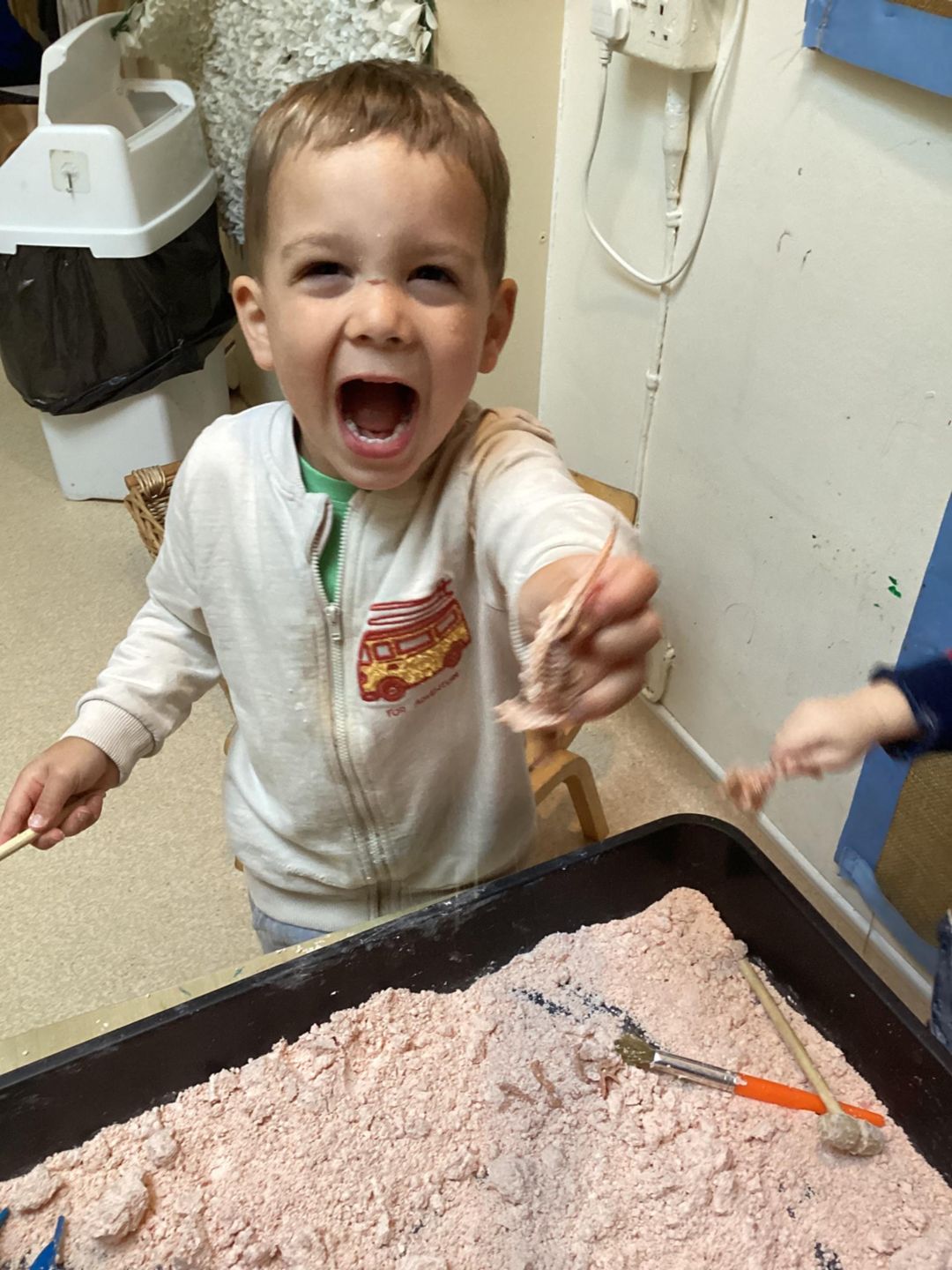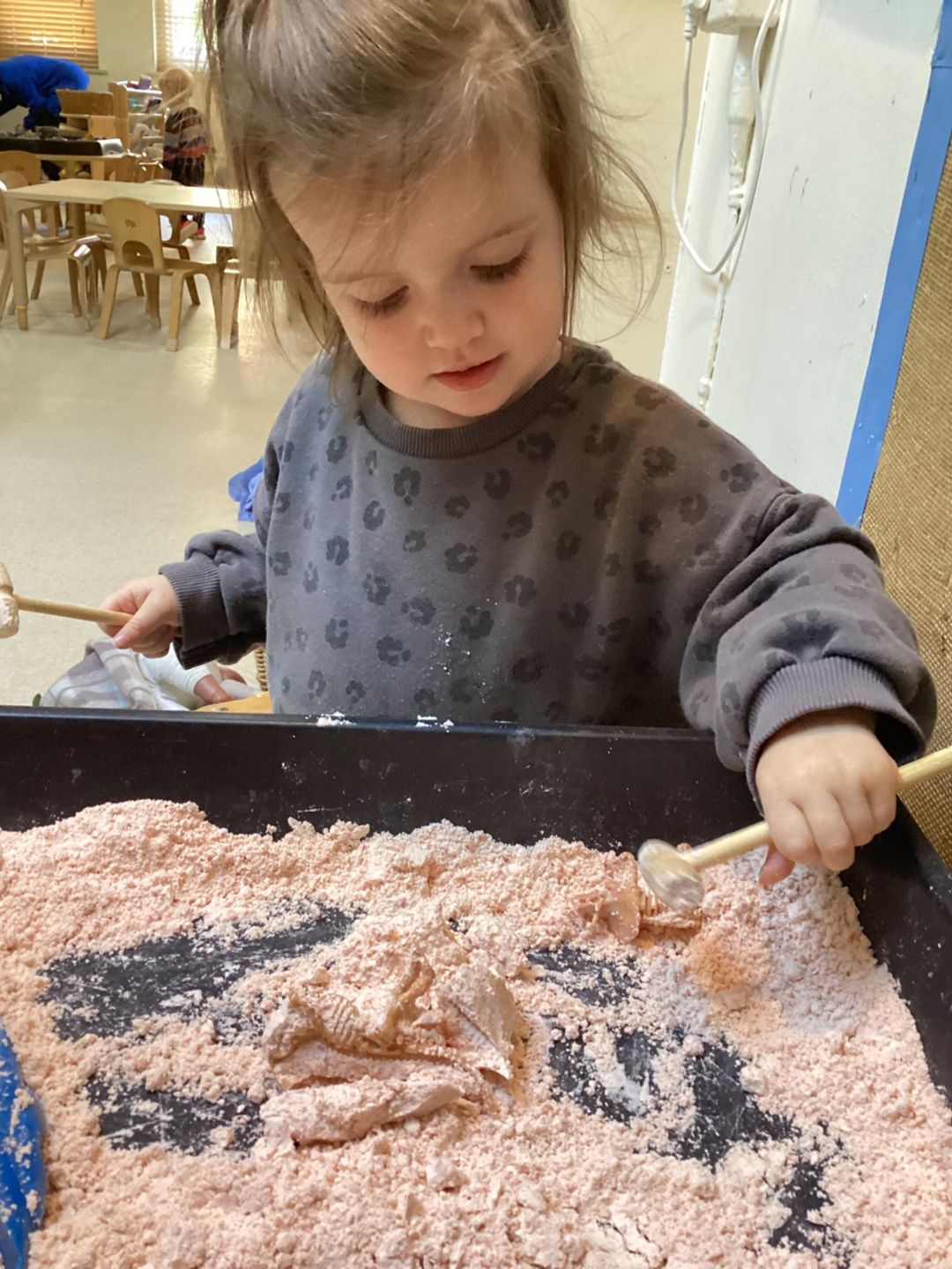 The Butterflies had lots of fun discovering some dinosaur fossils. Using the tweezers, hammers and brushes, the children used this gross and fine motor skills to locate and explore the dinosaurs. Throughout this activity, the children talked about the structure of the fossils like the tails and the different shaped heads. Well done Butterflies!