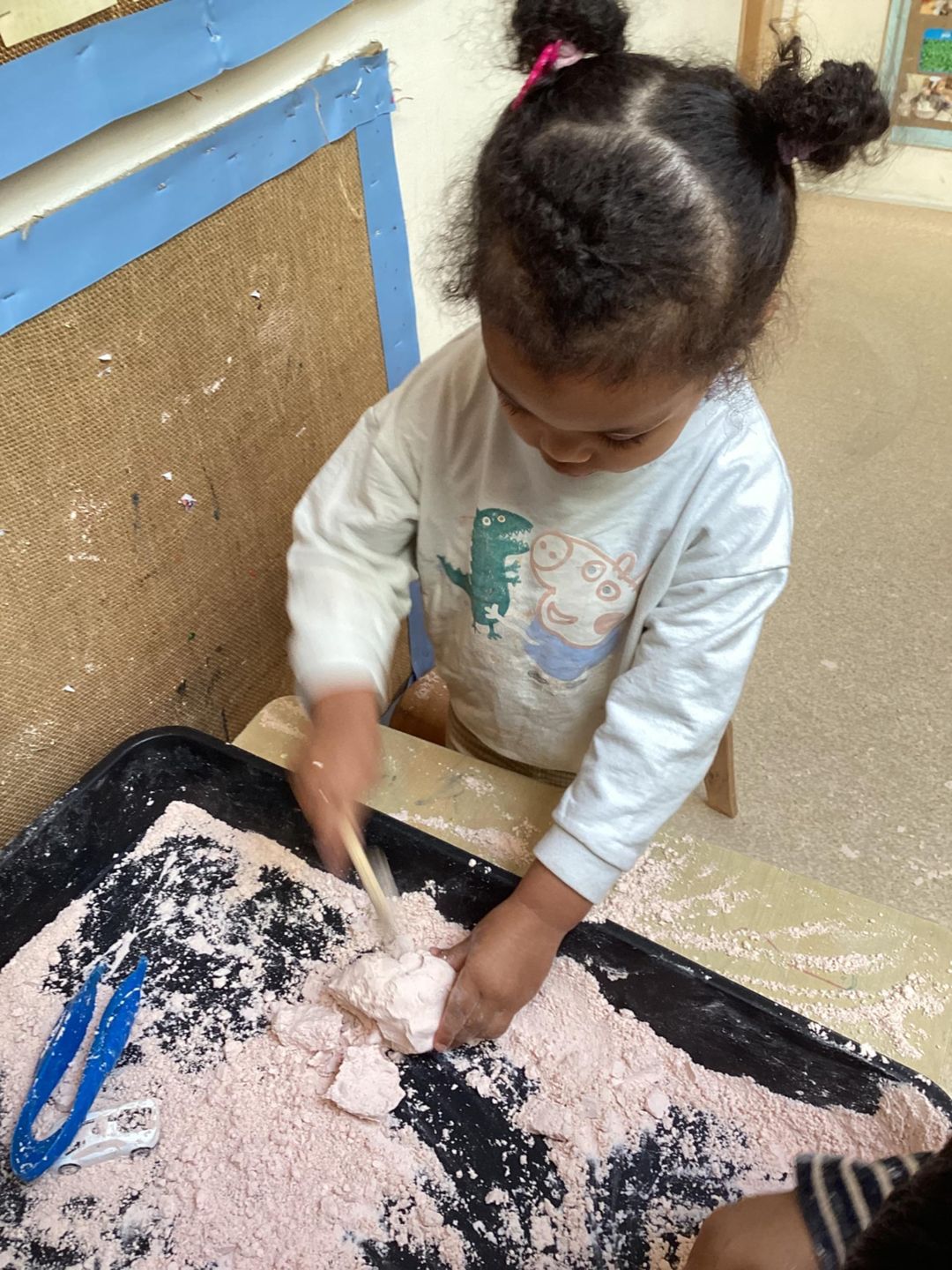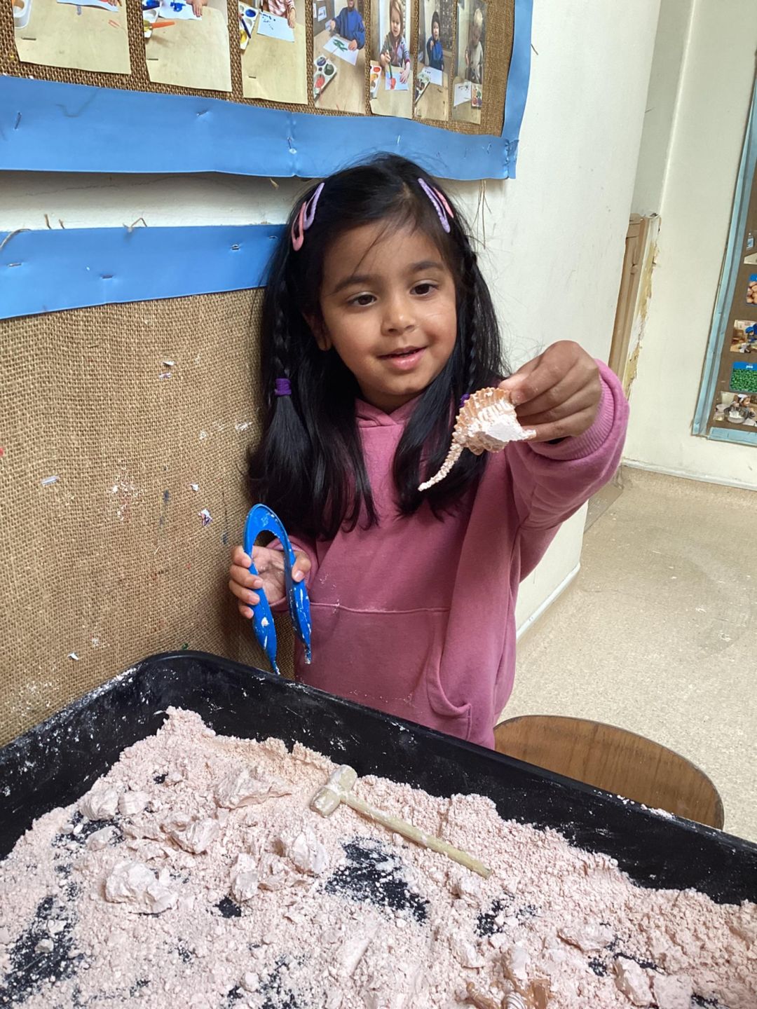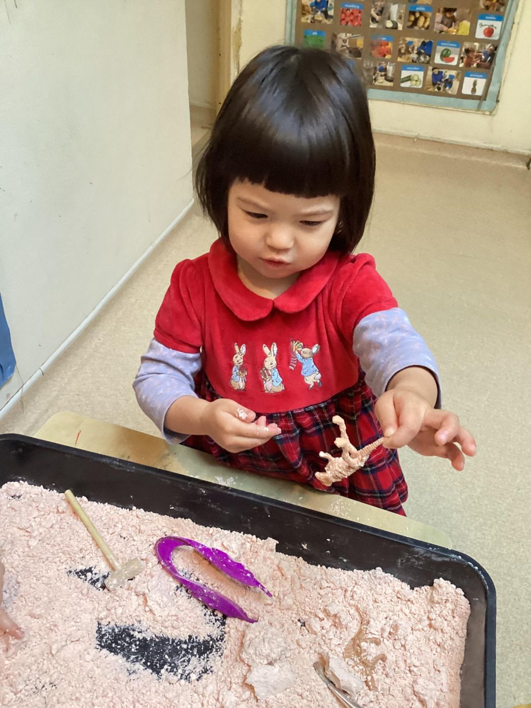 The Butterflies had lots of fun discovering some dinosaur fossils. Using the tweezers, hammers and brushes, the children used this gross and fine motor skills to locate and explore the dinosaurs. Throughout this activity, the children talked about the structure of the fossils like the tails and the different shaped heads. Well done Butterflies!