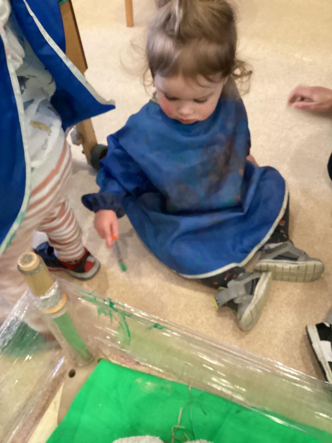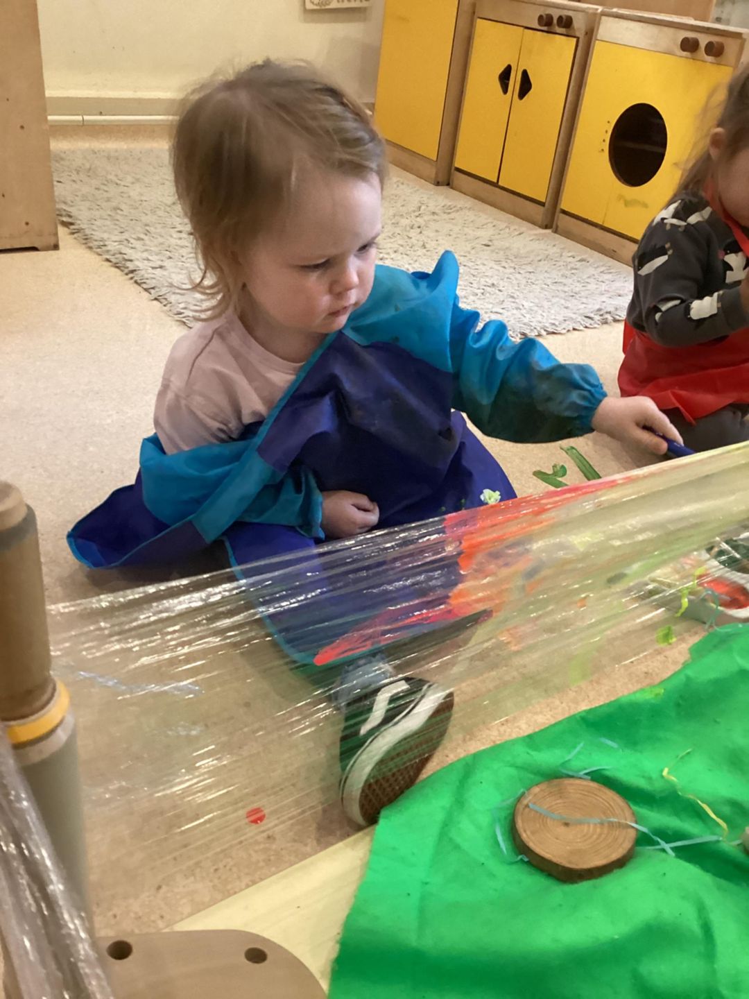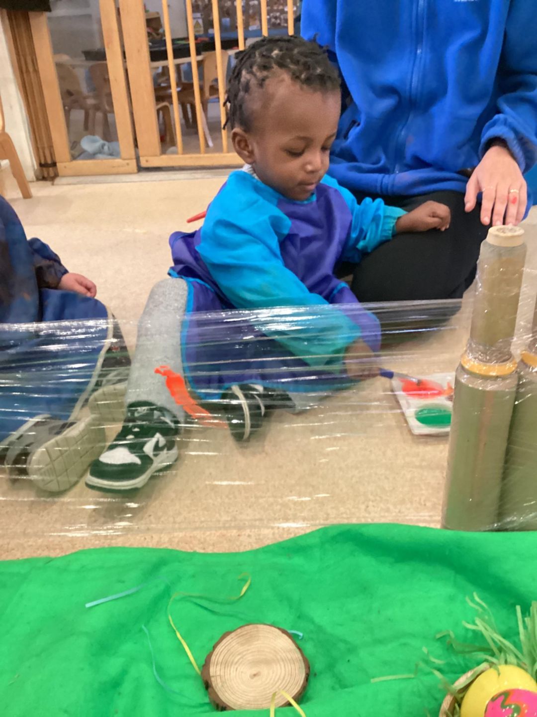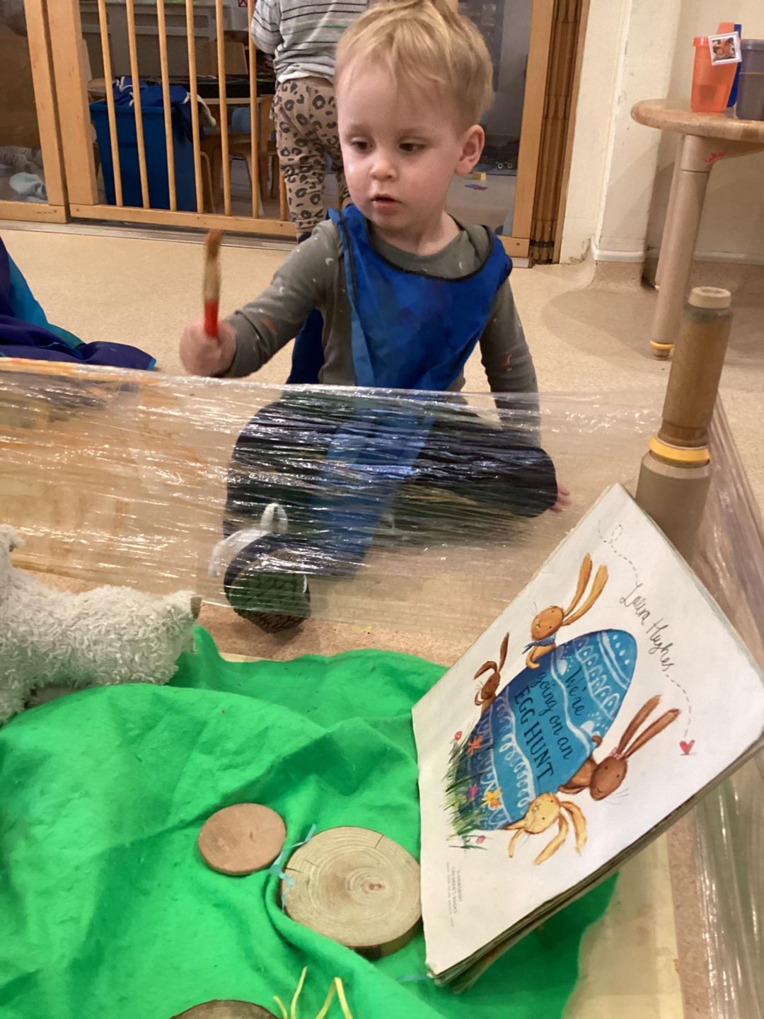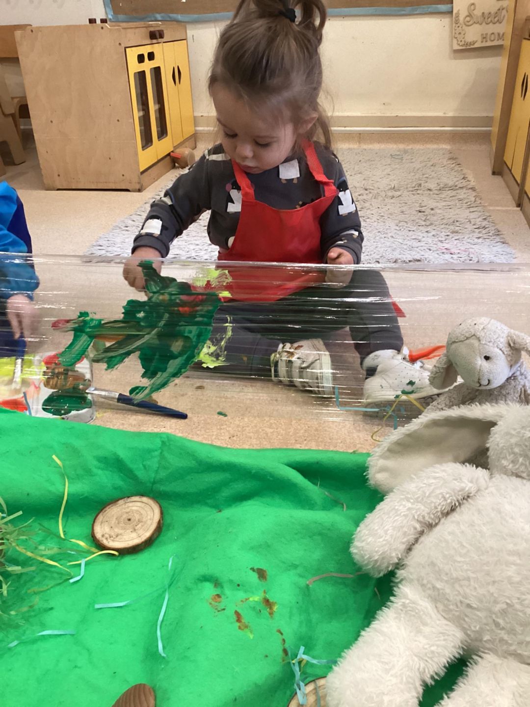 The Ladybird children took part in a creative Easter art activity using cling film as their canvas. They painted bunnies and eggs, carefully recreating an Easter scene from what they could see beyond the cling film.