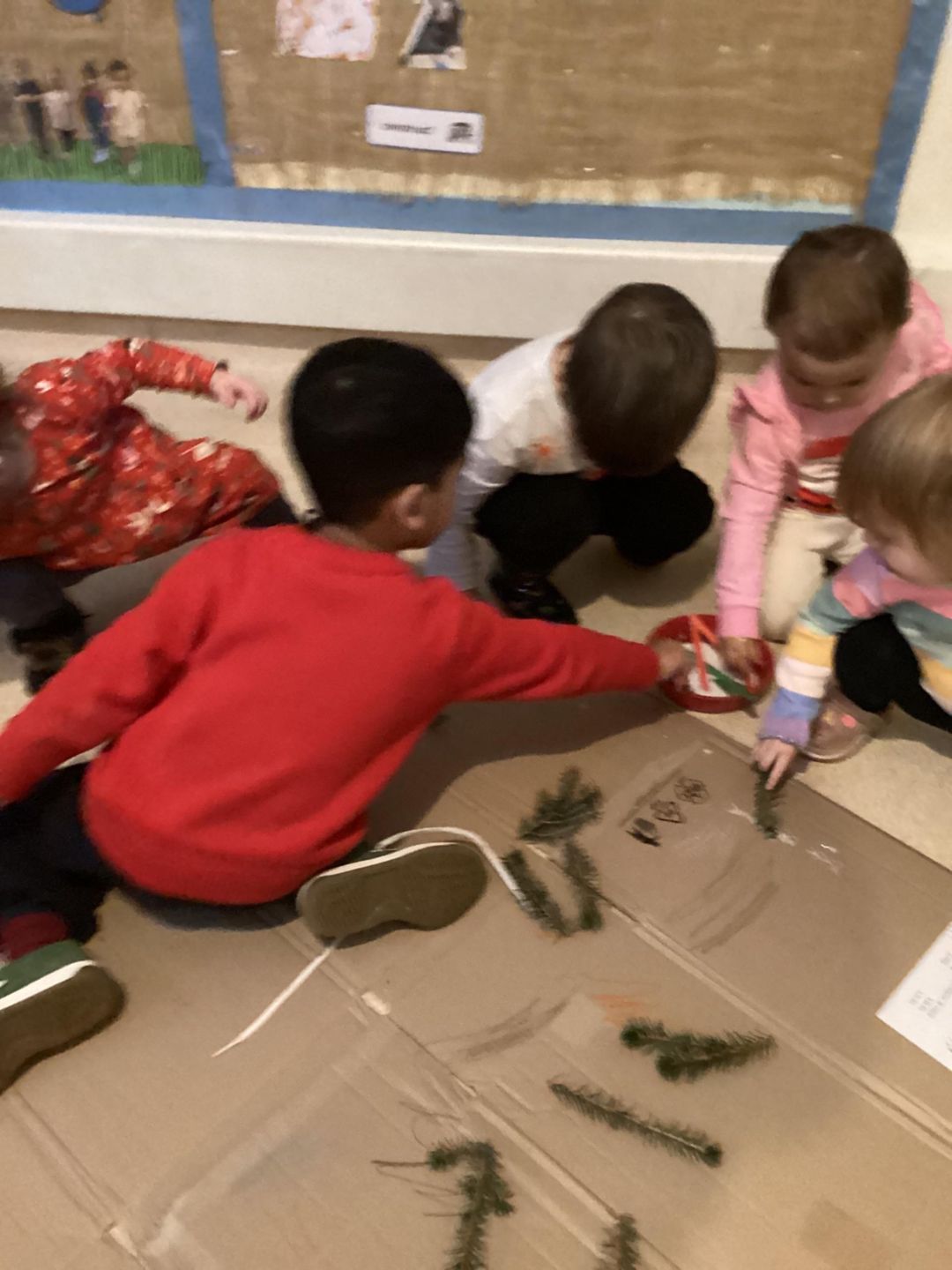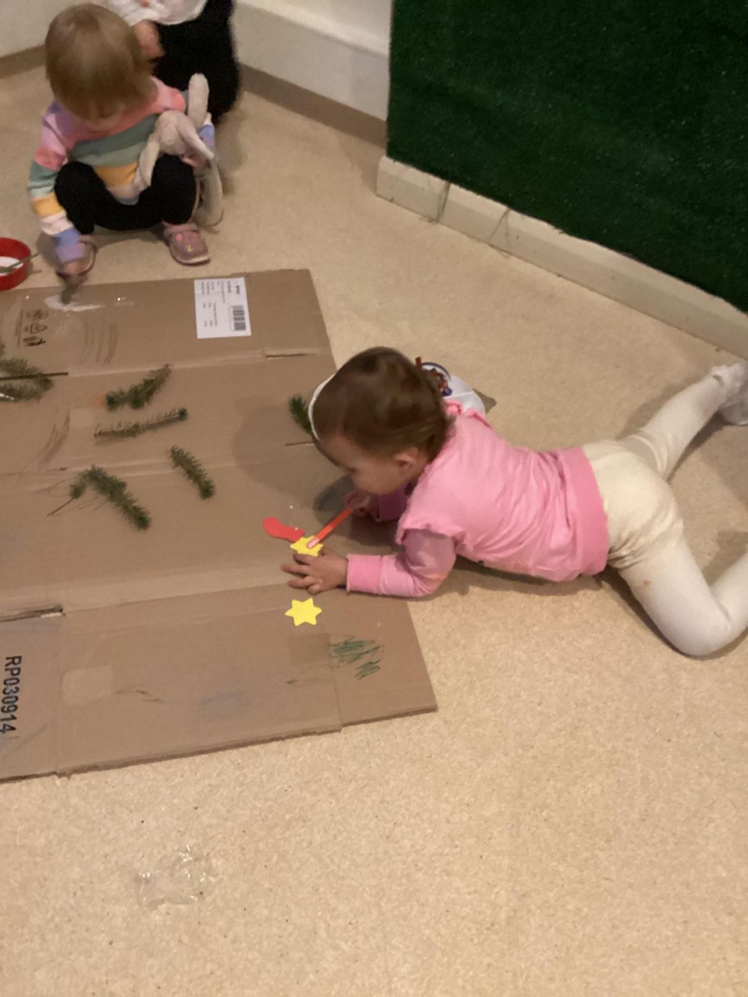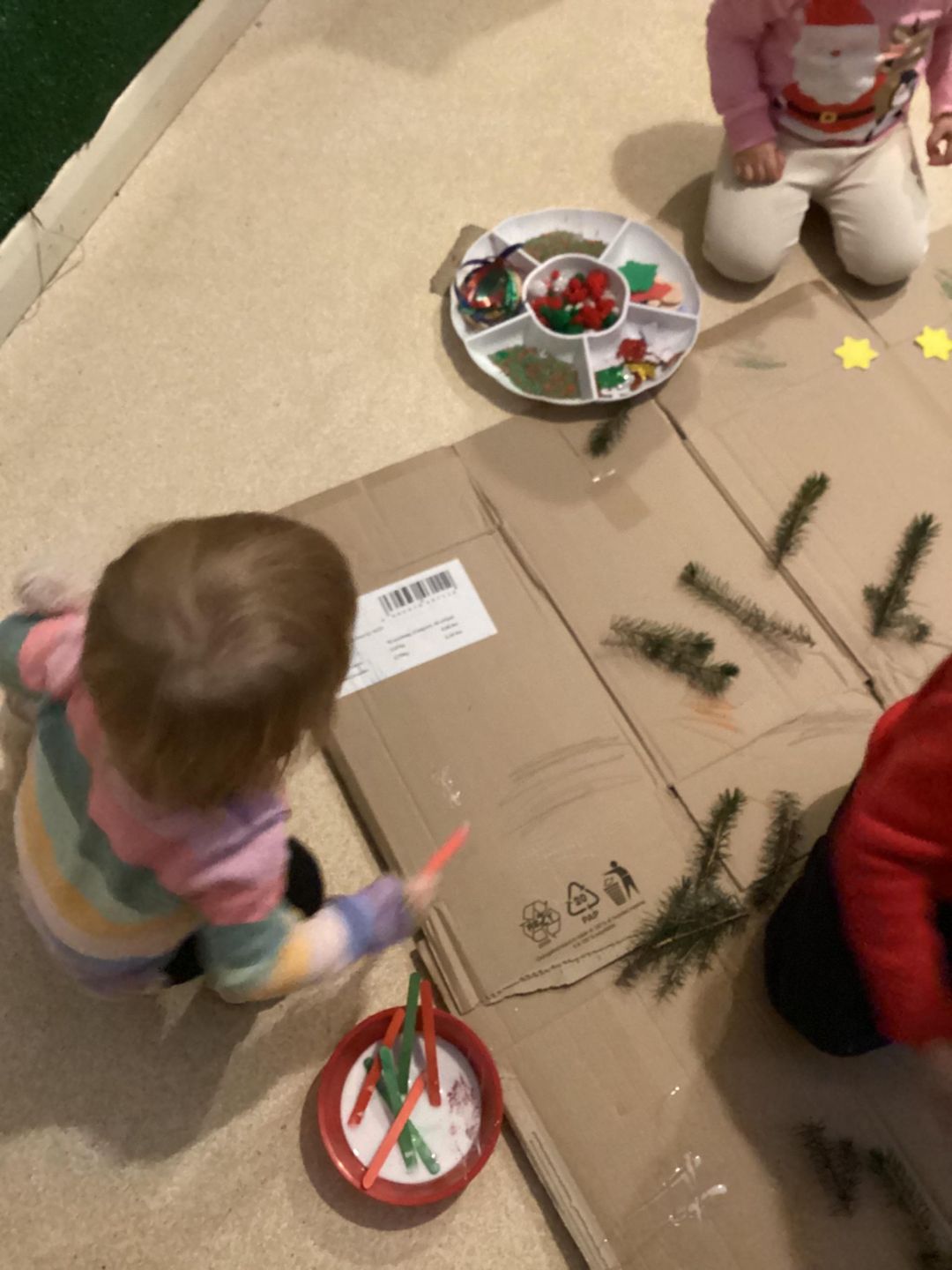 Today the Grasshoppers enjoyed some large-scale festive sticking activities! The children explored a wonderful range of Christmas-themed resources, including glitter, pom poms, colourful ribbons, foam shapes, Christmas-coloured rice and even real Christmas tree branches. They had lots of fun getting stuck in together, working as a team to glue and decorate the large cardboard pieces. This activity supported their creativity, fine motor skills and cooperation, while giving them the chance to express their own festive ideas.