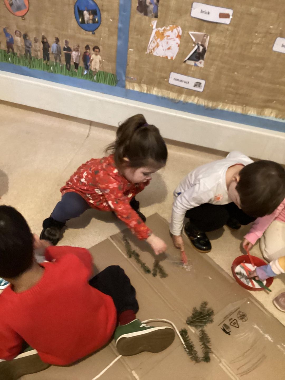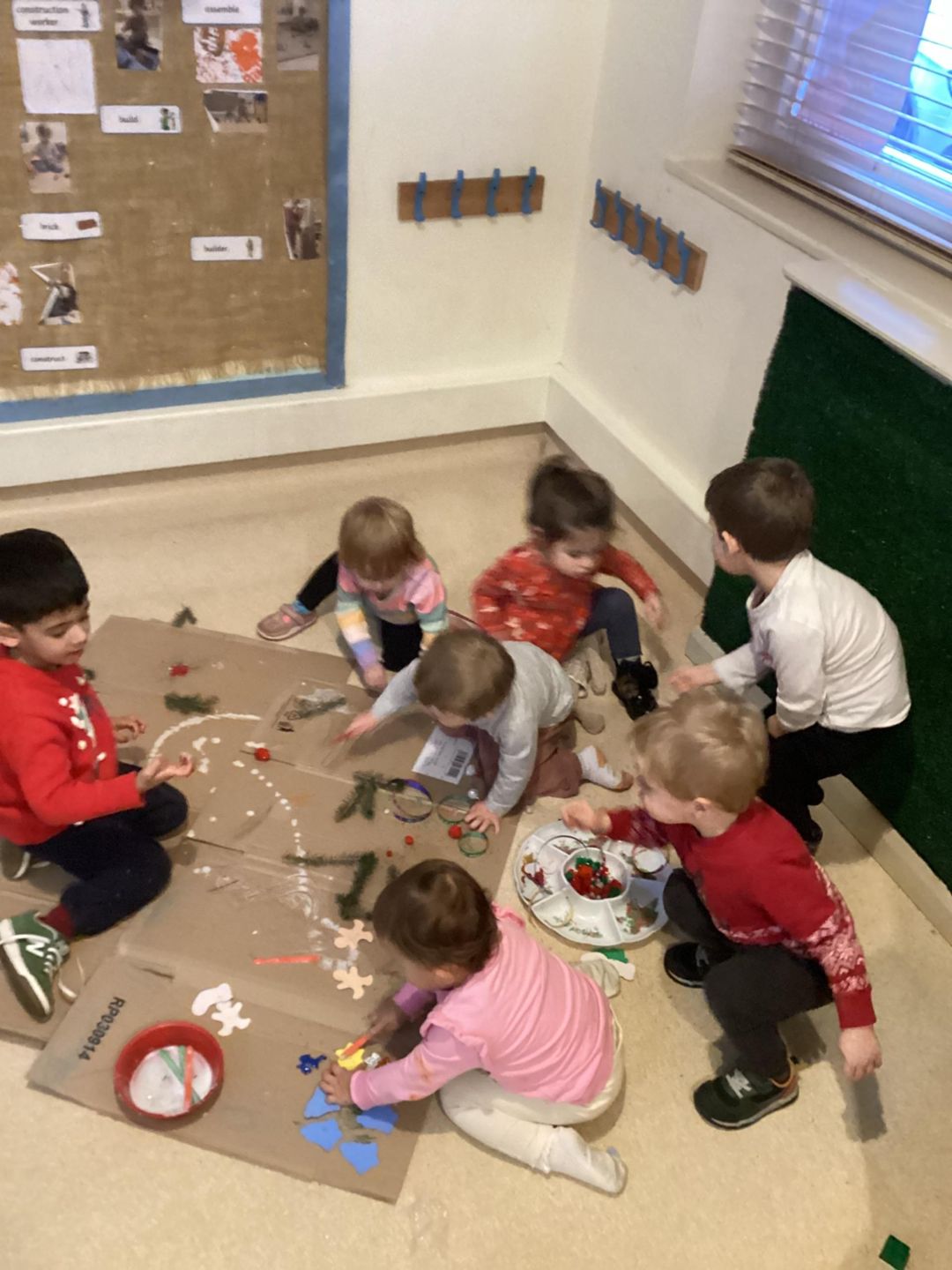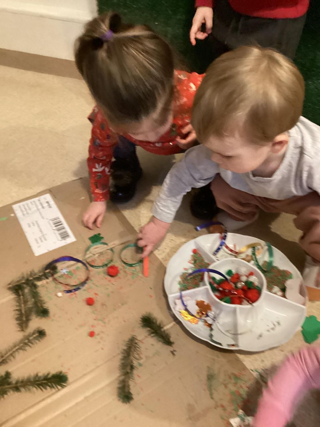 Today the Grasshoppers enjoyed some large-scale festive sticking activities! The children explored a wonderful range of Christmas-themed resources, including glitter, pom poms, colourful ribbons, foam shapes, Christmas-coloured rice and even real Christmas tree branches. They had lots of fun getting stuck in together, working as a team to glue and decorate the large cardboard pieces. This activity supported their creativity, fine motor skills and cooperation, while giving them the chance to express their own festive ideas.