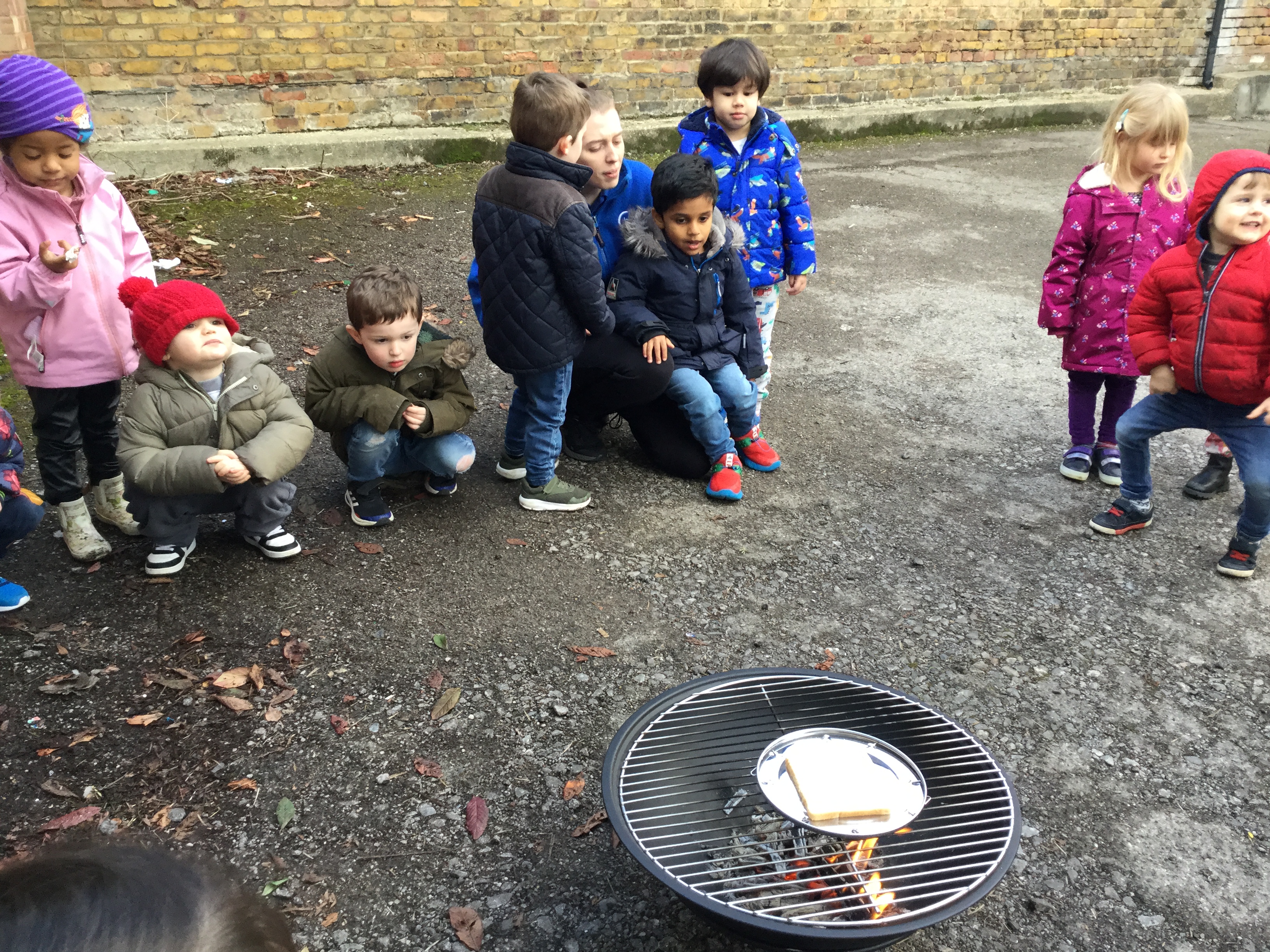 Bread was added to the fire toaster and the children watched as the bread changed colour as it cooked.