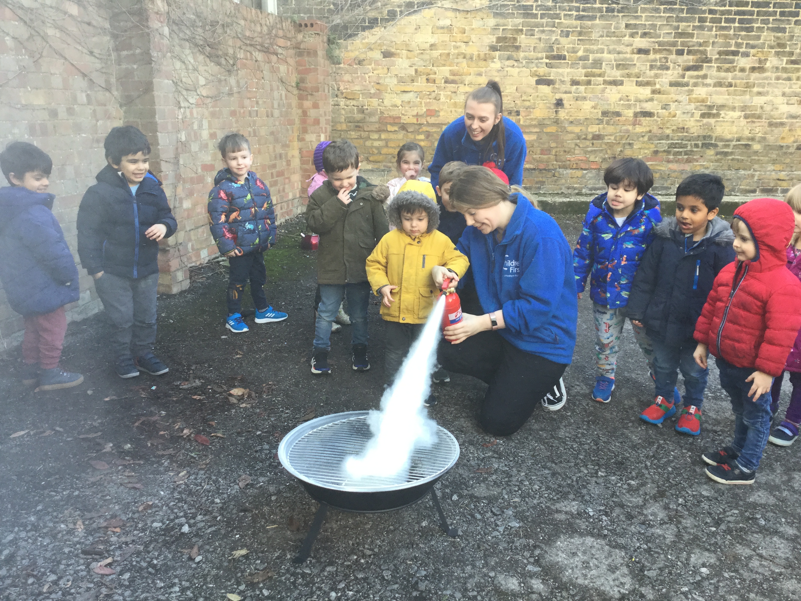 When they went outside the children talked about fire safety and looked at the fire safety equipment.