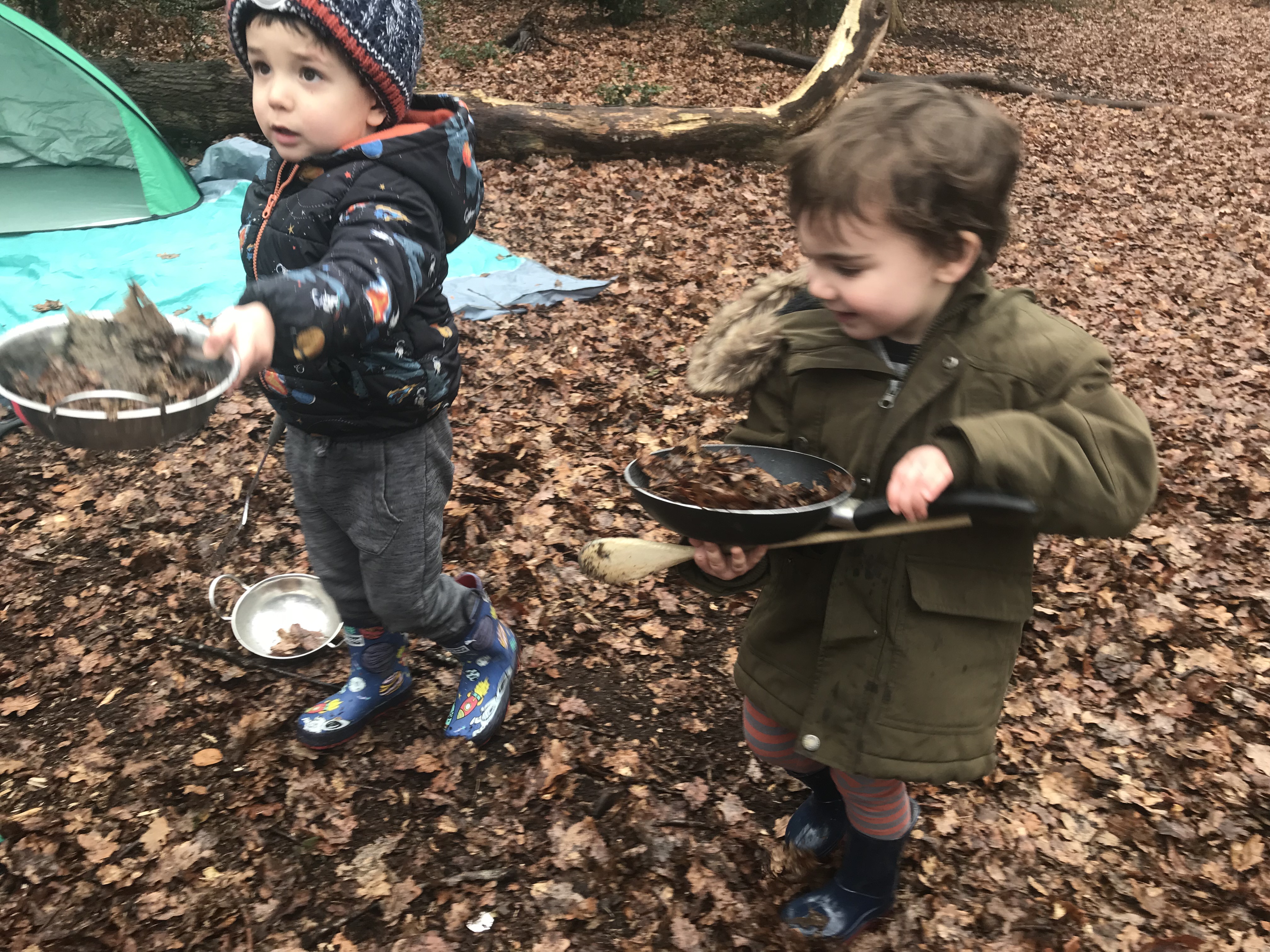 The Grasshoppers were excited about Pancake Day. Once they had made their pancakes they went on a trip to the local forest. They took a variety of mud kitchen resources. The children used the resources in a free play mud kitchen activity. When the children were playing the practitioners observed their narrative and watched on as they made 'mud pancakes' drawing from their real life experience of making their own pancakes the day before. The children mixed natural ingredients such as mud, stones and leaves to create their concoctions. The children thoroughly enjoyed the activity using mathematical language to say when the pan was fill and physical skill to practice mixing and flipping the mud pancakes.