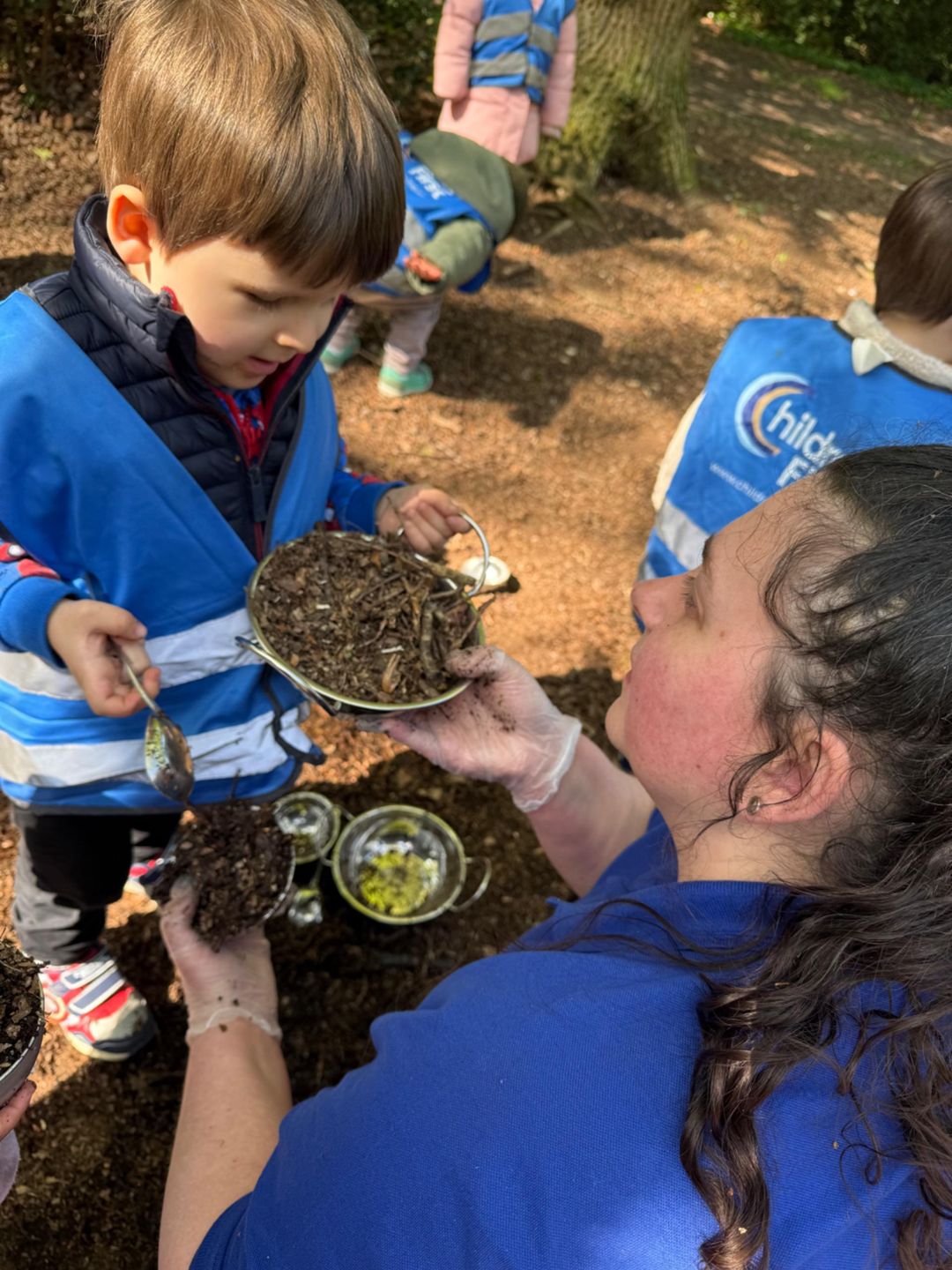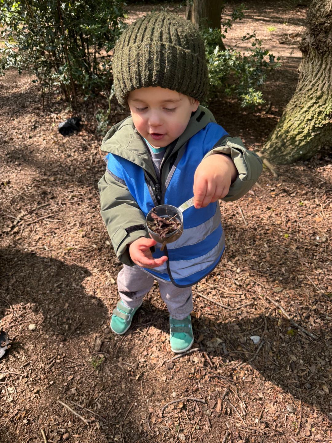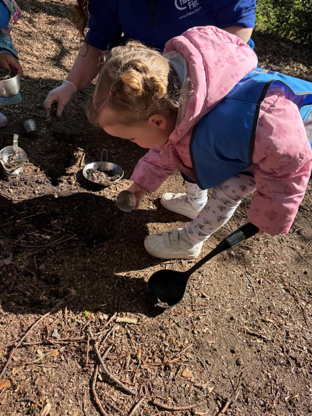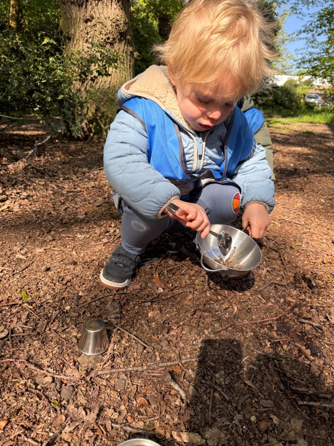 The Grasshoppers took part in a highly engaging outdoor learning experience during their visit to the local forest. The session began with a picnic-style snack, where the children enjoyed crackers and warm hot chocolate. The children then immersed themselves in exploratory, sensory-rich play using natural materials. Equipped with metal utensils, they demonstrated curiosity and creativity as they scooped, dug, and mixed mud, filling a variety of containers such as bowls, pots, and pans. This activity supported the development of fine motor skills, hand-eye coordination, and early problem-solving abilities. The children further enhanced their imaginative play by incorporating leaves, sticks, and acorns into their creations, engaging in role play as they “cooked” and created a variety of cakes, pies and potions!