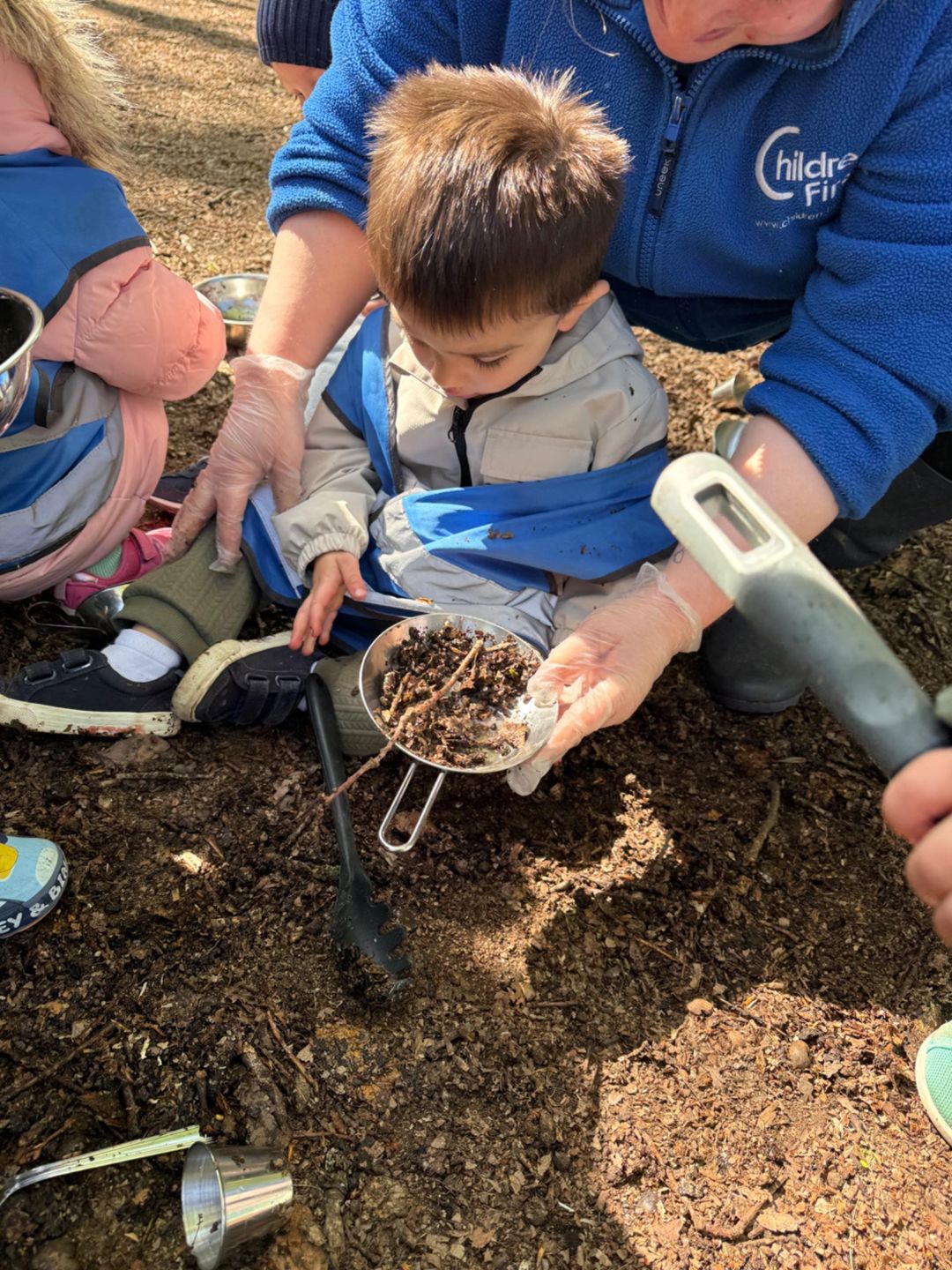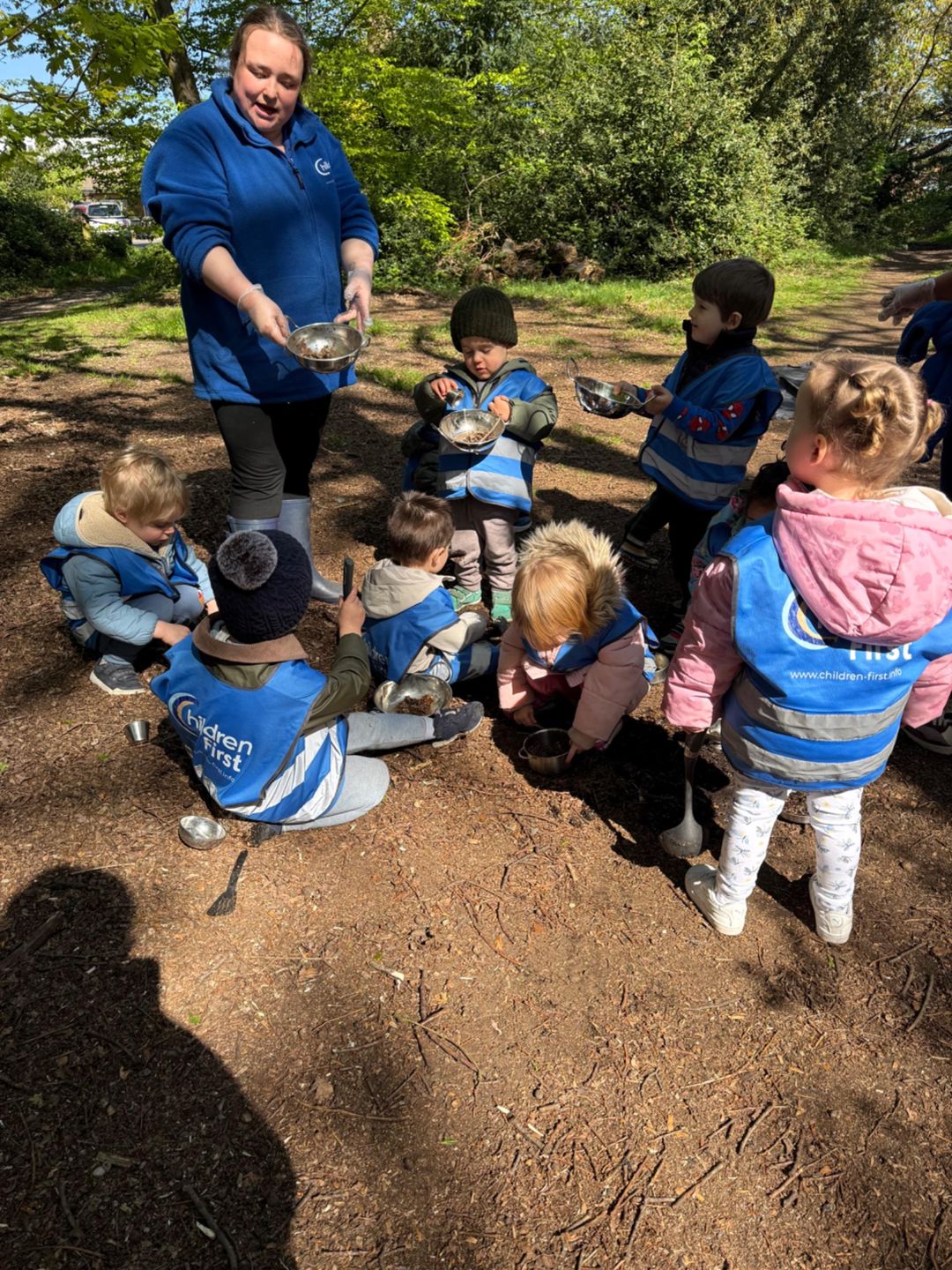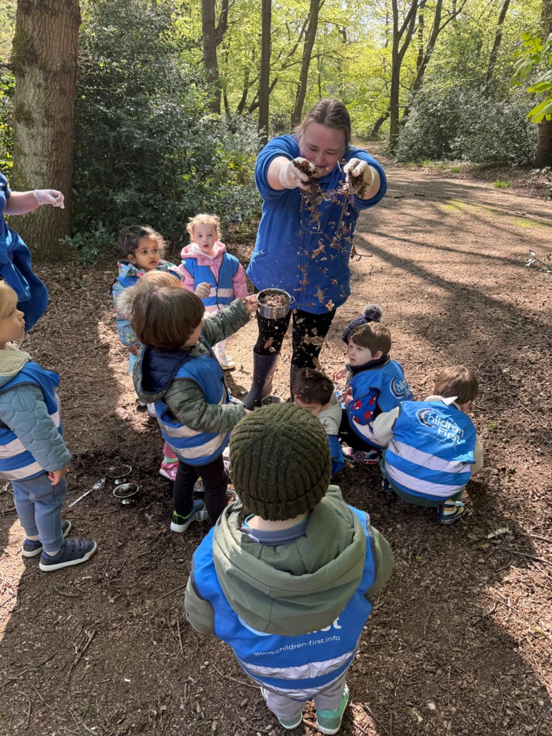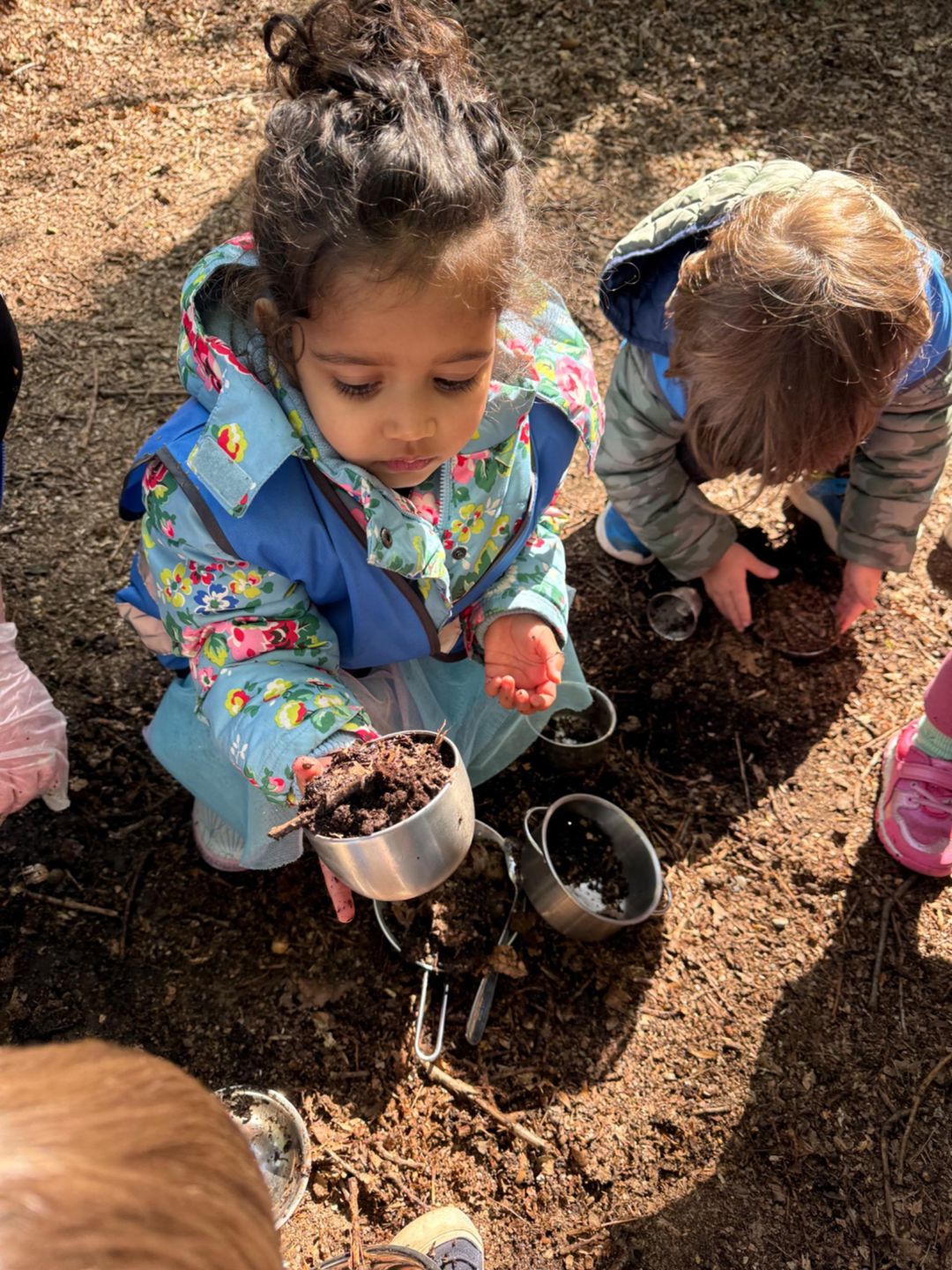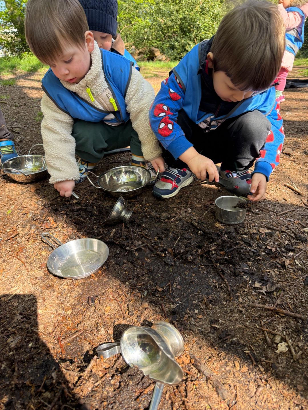 The Grasshoppers took part in a highly engaging outdoor learning experience during their visit to the local forest. The session began with a picnic-style snack, where the children enjoyed crackers and warm hot chocolate. The children then immersed themselves in exploratory, sensory-rich play using natural materials. Equipped with metal utensils, they demonstrated curiosity and creativity as they scooped, dug, and mixed mud, filling a variety of containers such as bowls, pots, and pans. This activity supported the development of fine motor skills, hand-eye coordination, and early problem-solving abilities. The children further enhanced their imaginative play by incorporating leaves, sticks, and acorns into their creations, engaging in role play as they “cooked” and created a variety of cakes, pies and potions!