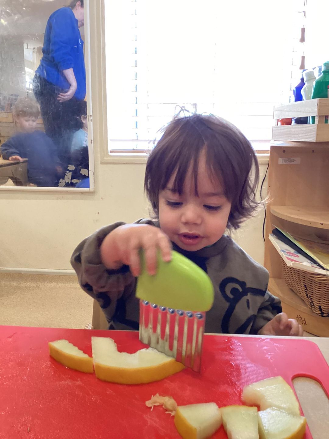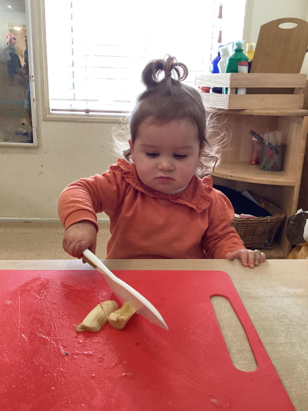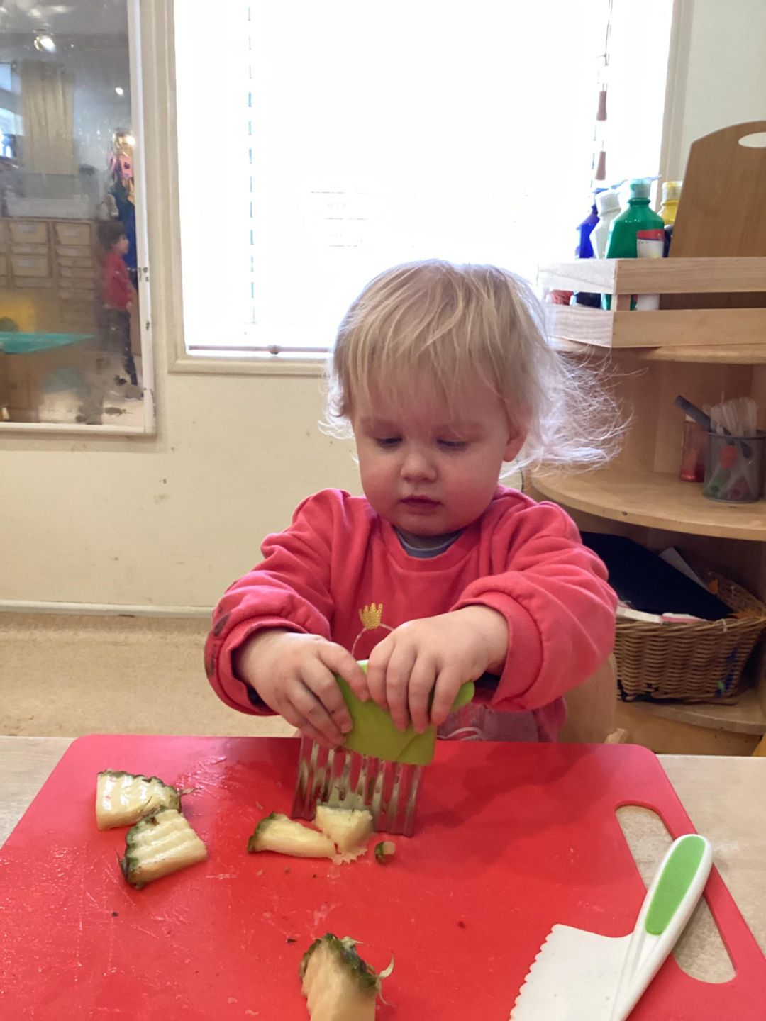 The Ladybirds have been busy this week learning new independence building skills! The children used a variety of tools and child safety knives to cut and prepare their own snack. The children used a range of new words to widen their vocabulary such as pointy, rough and smooth when cutting and describing the texture and colour of the fruit. Excellent listening skills Ladybirds!