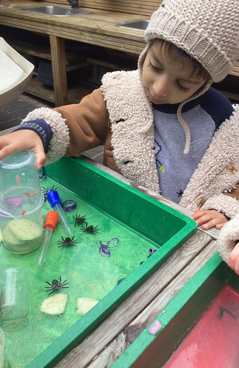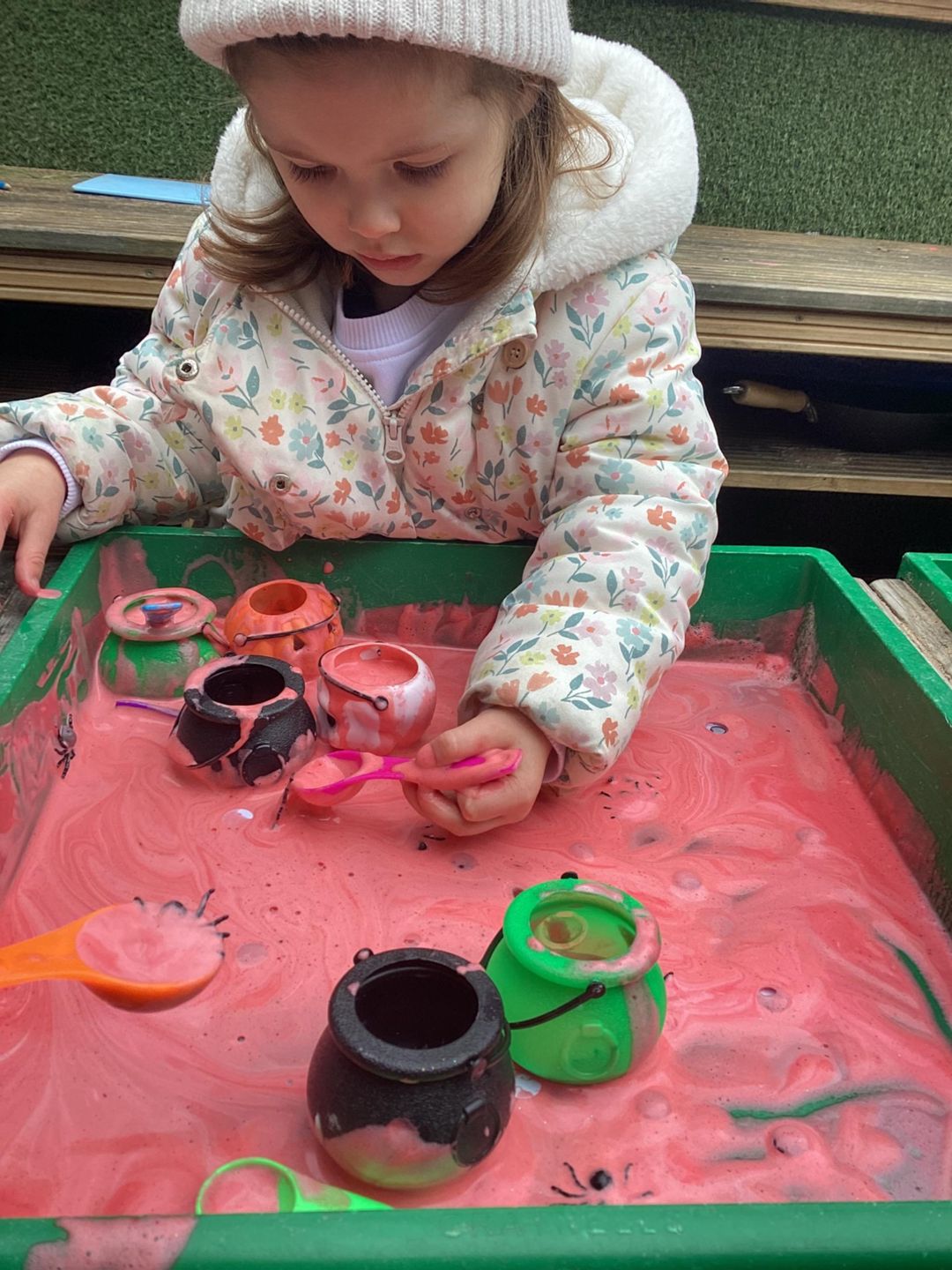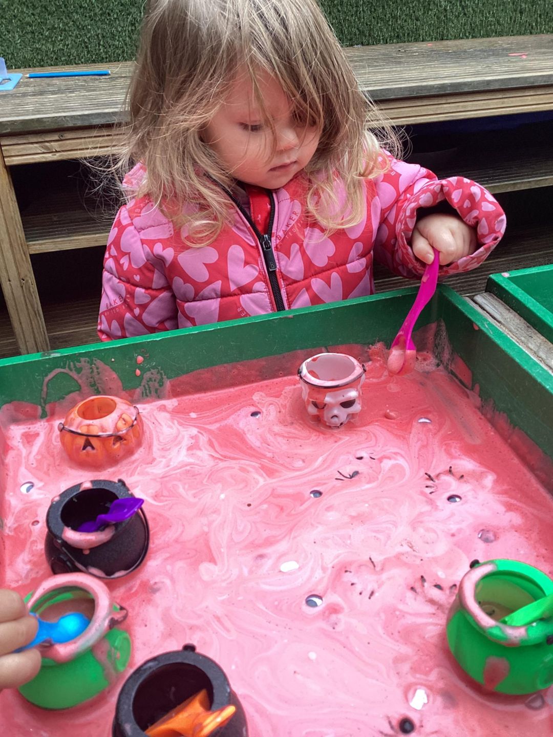 The Butterflies have been exploring a gloopy, slimy potion activity this week. On one side they had to scoop out spiders and googly eyeballs out of the tray filled with gloopy shaving foam and collect them for the special witchy potions. On the other side they had a sparkly green apple potion where they could make their own concoctions by pouring, squeezing and mixing. Well done Butterflies!