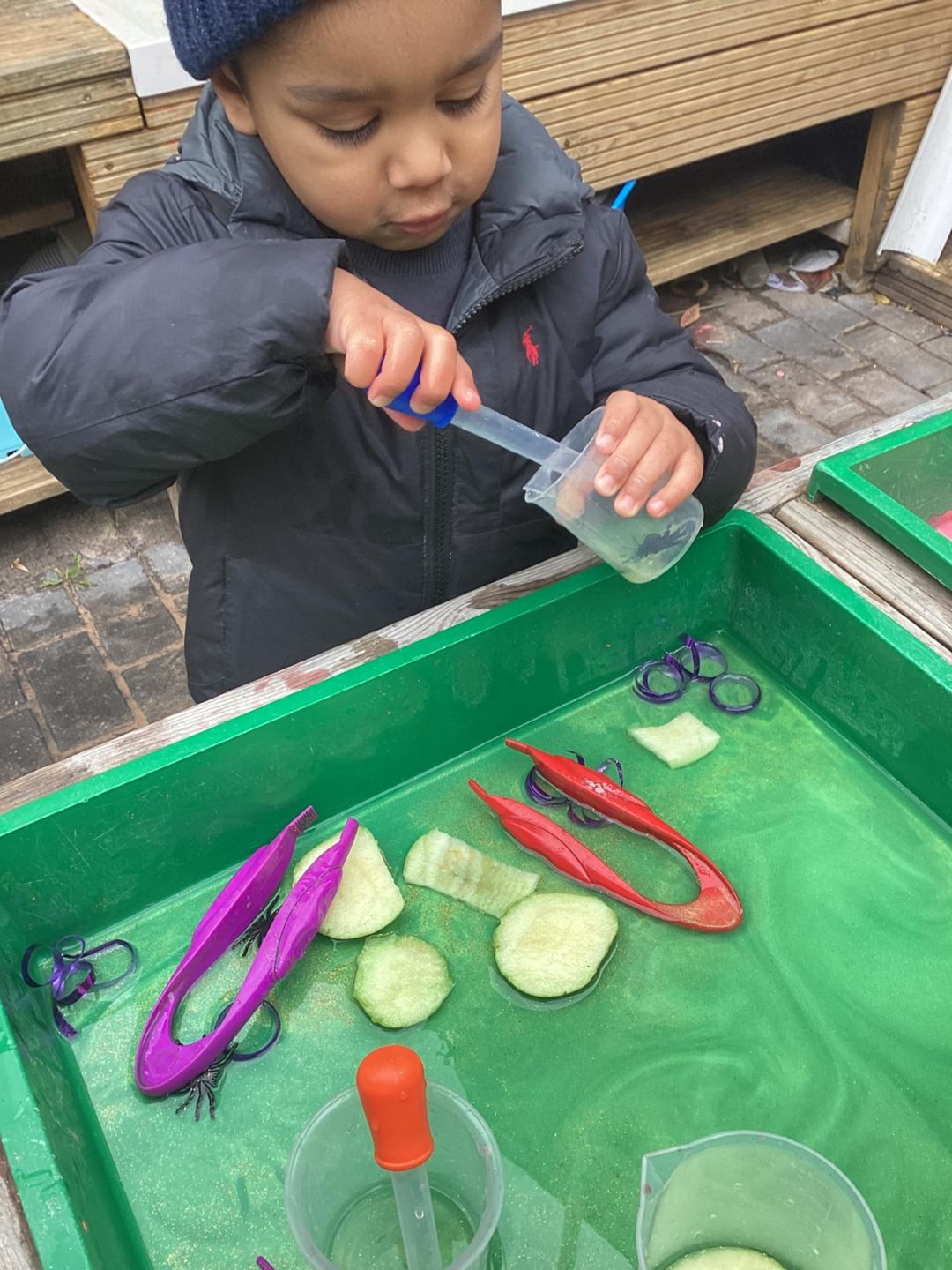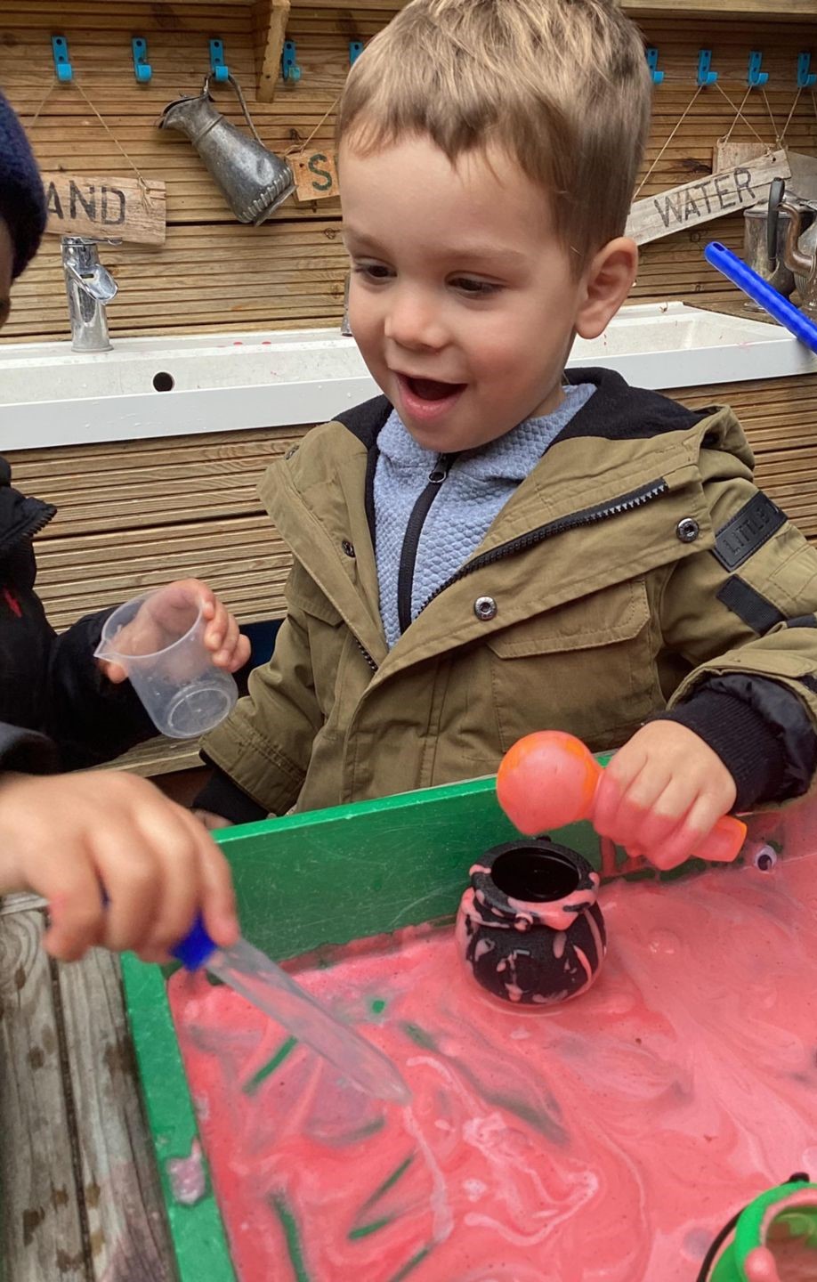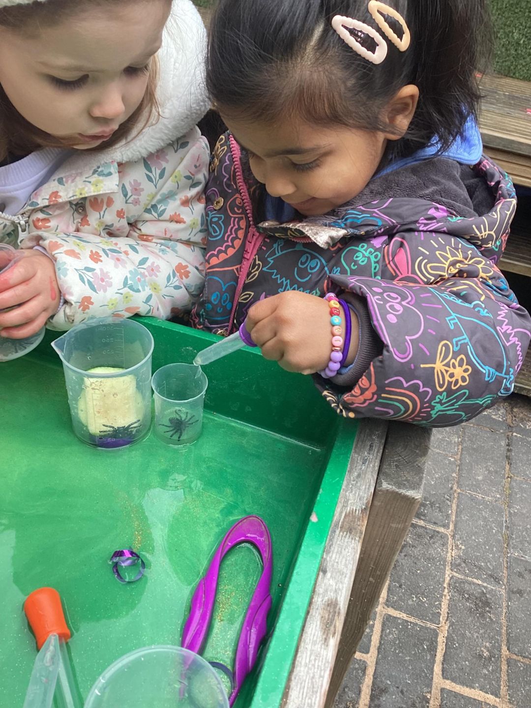 The Butterflies have been exploring a gloopy, slimy potion activity this week. On one side they had to scoop out spiders and googly eyeballs out of the tray filled with gloopy shaving foam and collect them for the special witchy potions. On the other side they had a sparkly green apple potion where they could make their own concoctions by pouring, squeezing and mixing. Well done Butterflies!