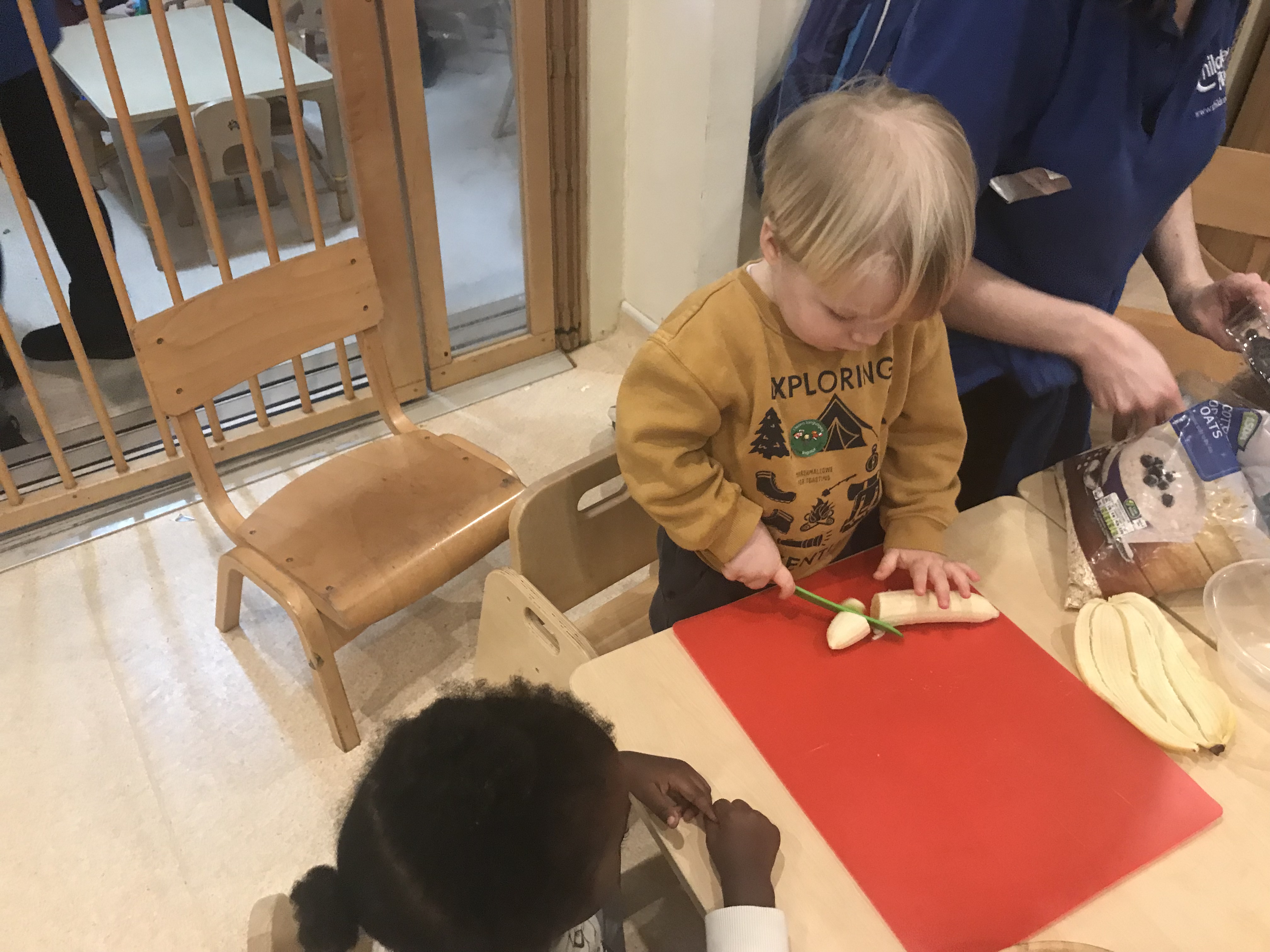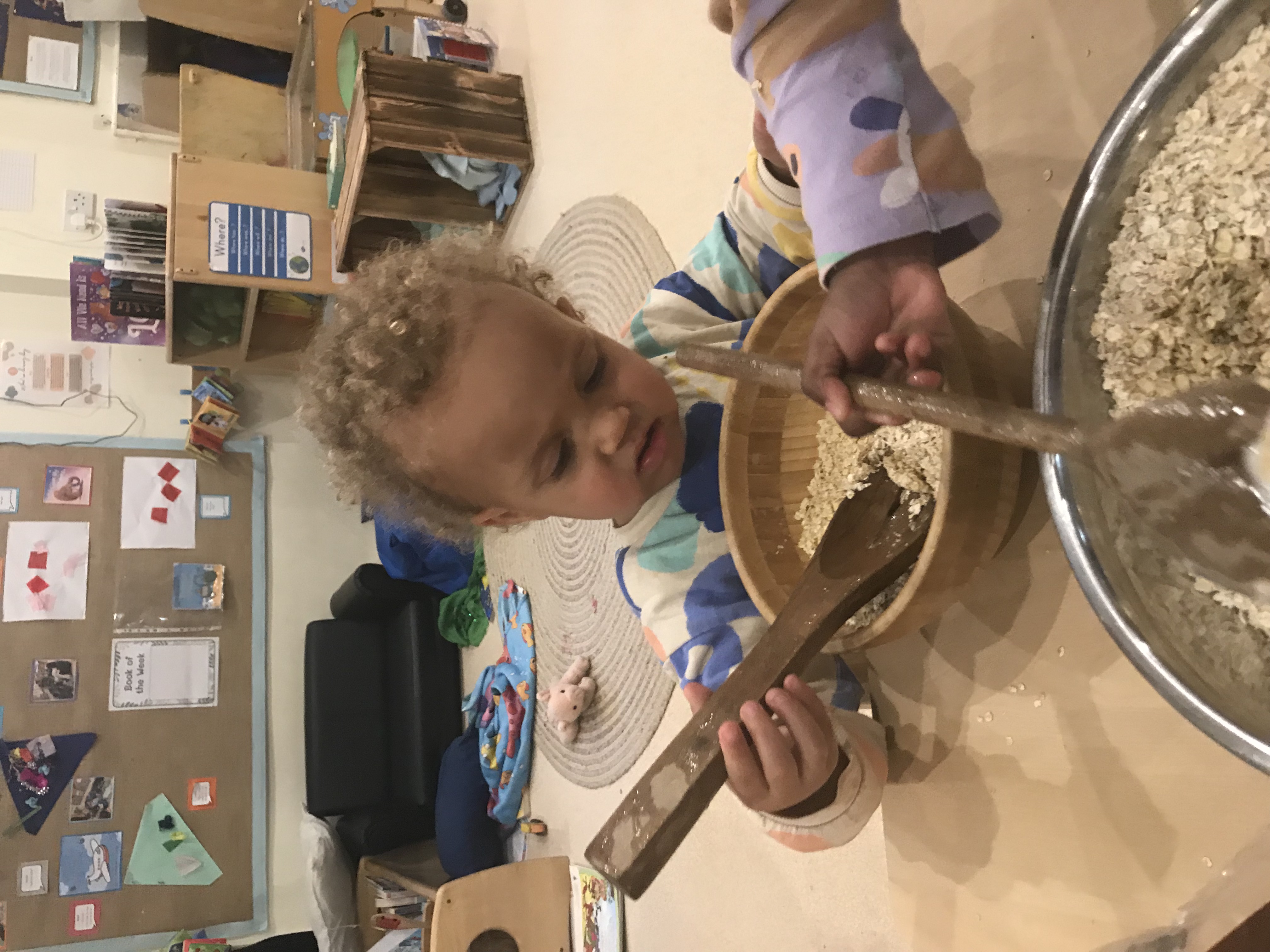 The Ladybirds have been reading the traditional story Goldilocks and the Three Bears. They have been following the story of Goldilocks eating the bears porridge so the ladybirds made the three bears some more porridge to eat. The children pored porridge oats into a bowl and carefully mixed in milk. They used spoons as tools to mix the two ingredients together. The children talked about the mixture being sticky and wet and practitioners introduced new language about the change in texture. Childrne carefully maniplaued knives to cut ip pieces of fruit to add to thei rporrige. Once it was eady the children fed it to the bears.