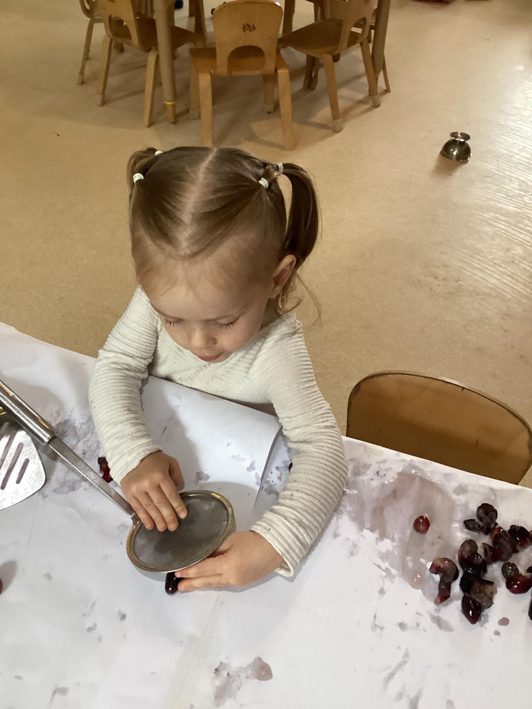 For National Grape Day the butterflies had lots of fun exploring the textures and the colour the grapes make on the paper. Throughout the activity, the children used their fine and gross motor skills to control the different items to squish the grapes. When they had squished the grapes, the children continues to use the different utensils to make marks on the paper. Well done Butterflies!