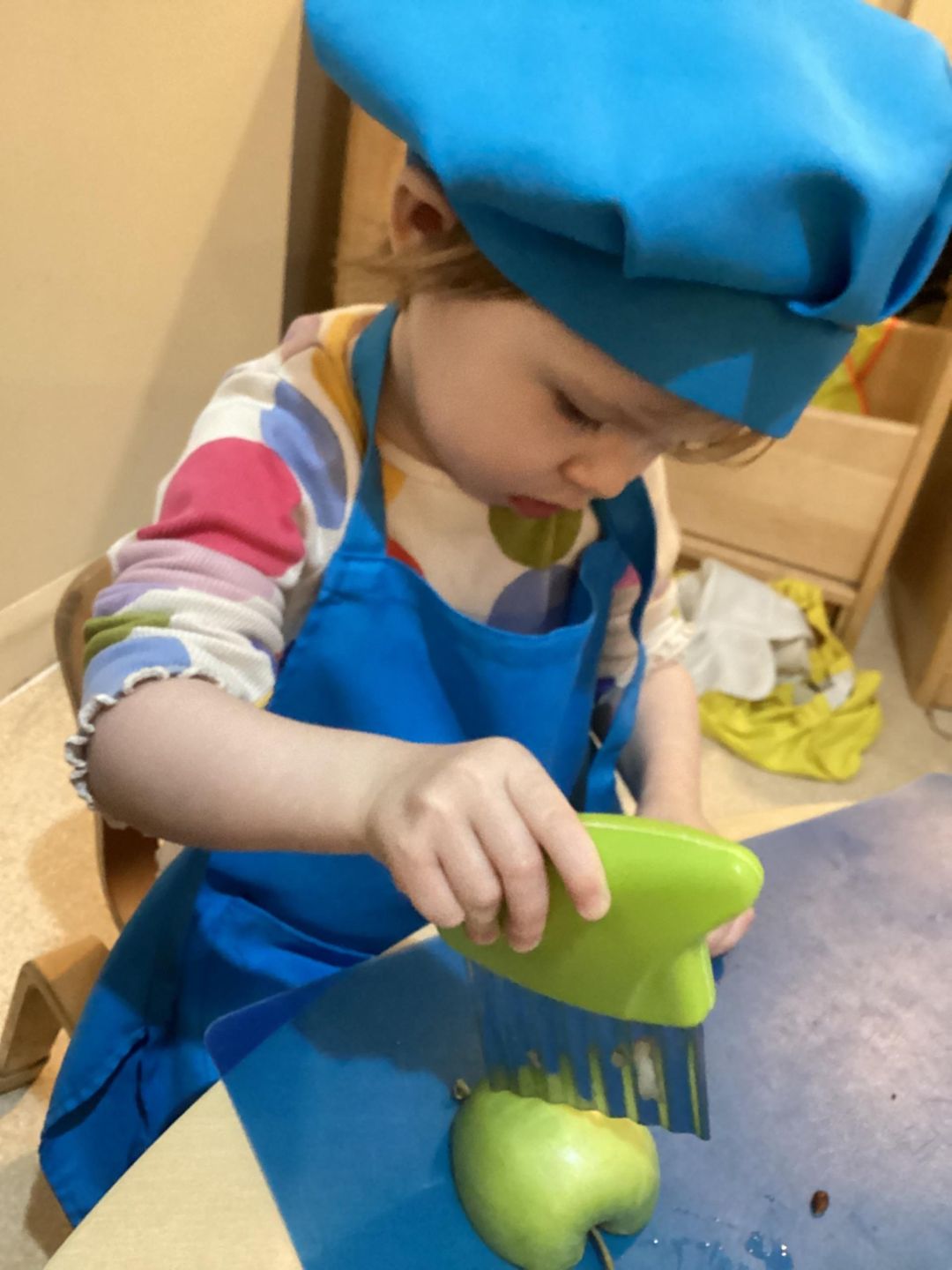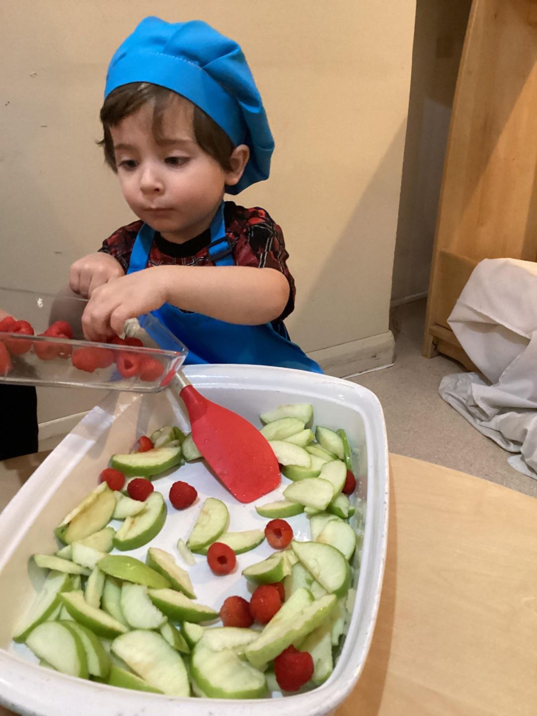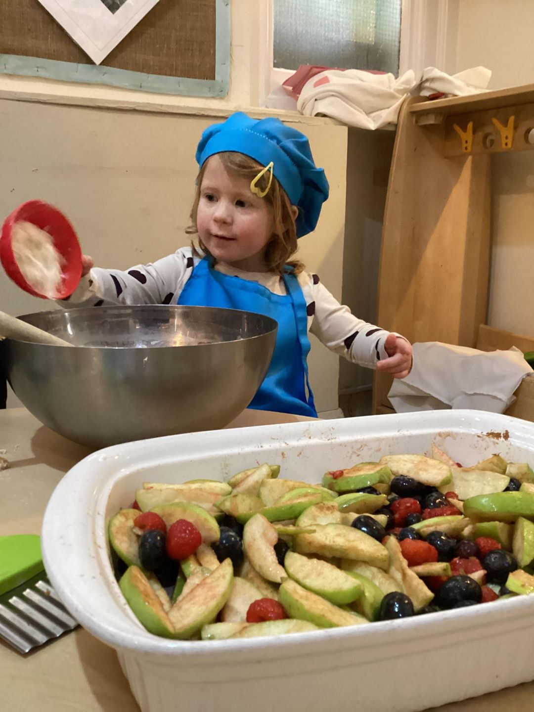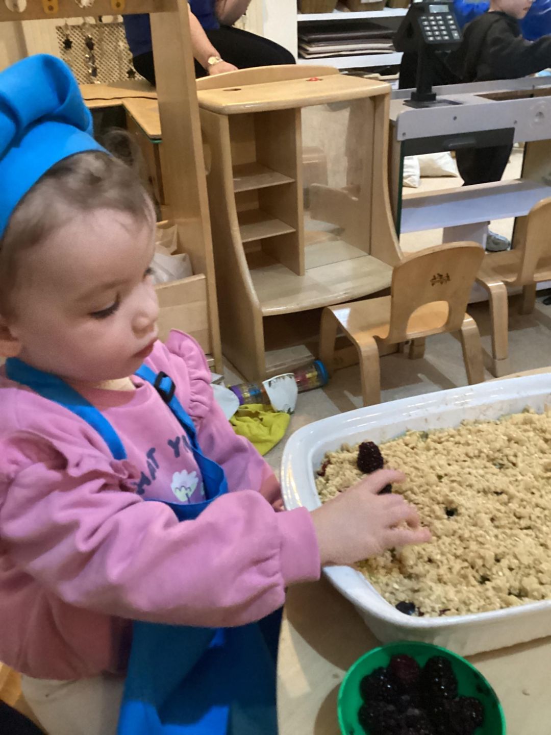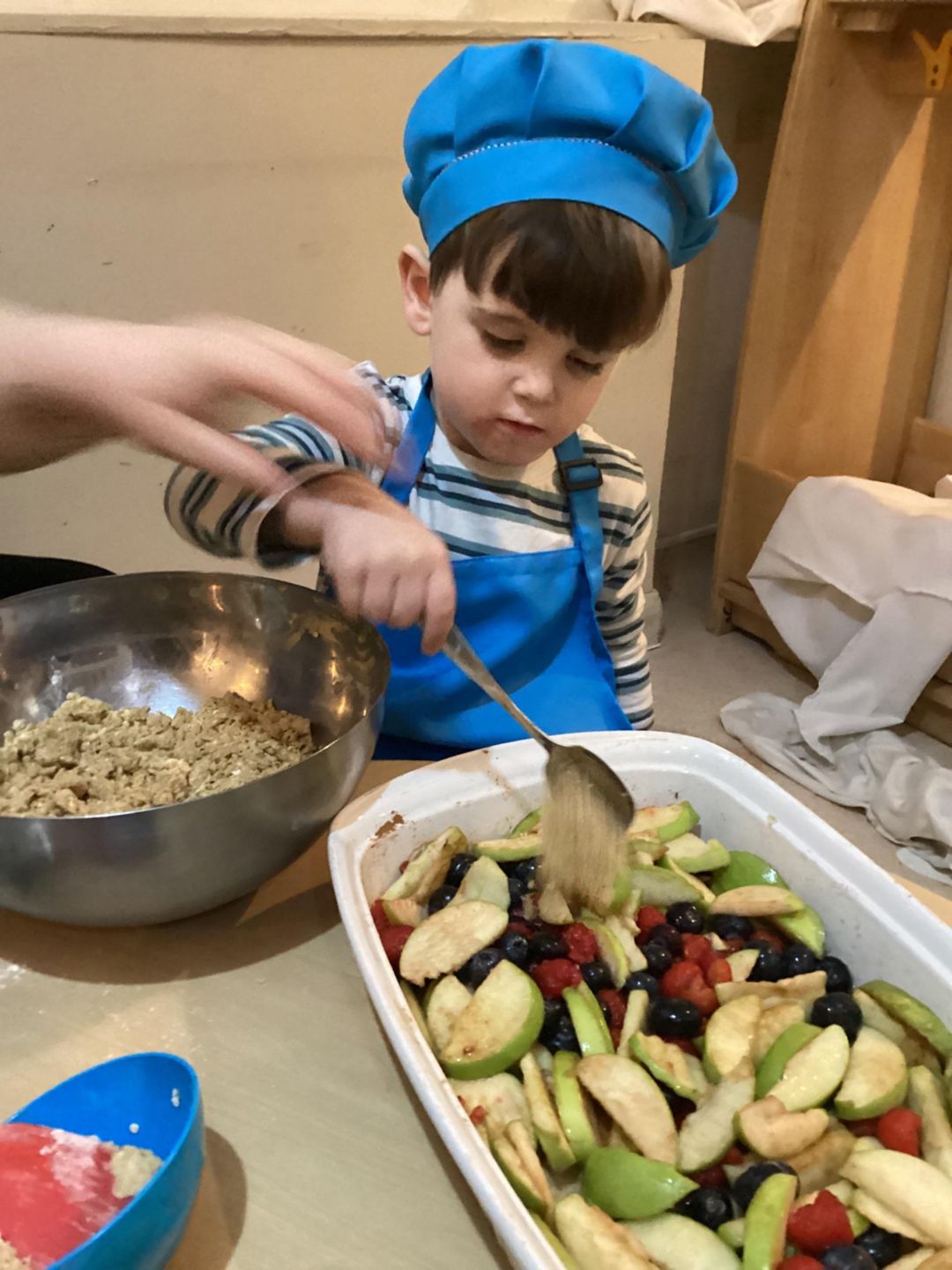 Each ingredient represented a different part of the Gruffalo: Green apples were his poisonous wart on the end of his nose. Blueberries were his black tongue. Raspberries were his orange eyes. Blackberries were his purple prickles all over his back. The golden-brown crumble topping was his thick brown fur. The children all took on important roles in the cooking process. They carefully used child-safe knives to slice the apples, showing great focus and developing their fine motor skills. Then they added the berries to the apples. Next, they worked together to make the crumble topping by mixing butter, flour, oats and cinnamon until it formed a crumbly texture. The children then helped to sprinkle the crumble mixture over the fruit before adding a few extra berries on top for decoration.