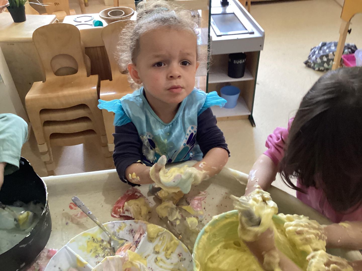 Today at the grasshoppers, the kids had a blast making pretend ice creams with soap foam. They took turns whisking up colourful foam with Ciara using an electric whisk. The children were fantastic at handling the new equipment. They got creative with real ice cream cones and glass bottles, decorating their foam cones with sprinkles and shaving foam. During playtime, we chatted about our favourite ice cream flavours and ingredients. It was a messy but enjoyable activity that sparked their imaginations and got them talking about their ice cream preferences.