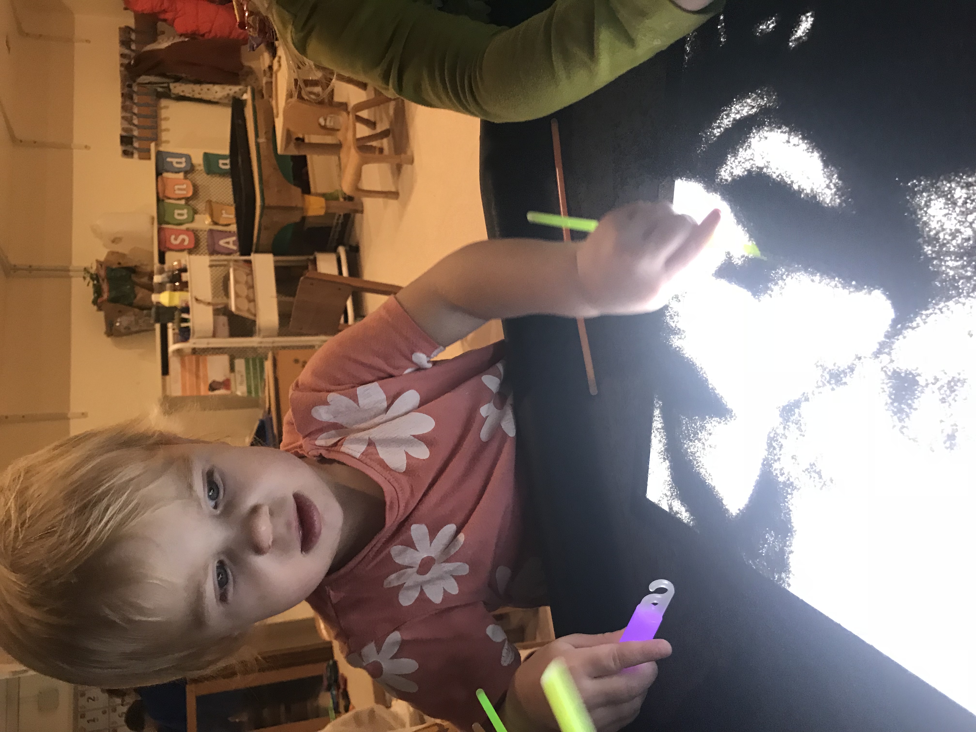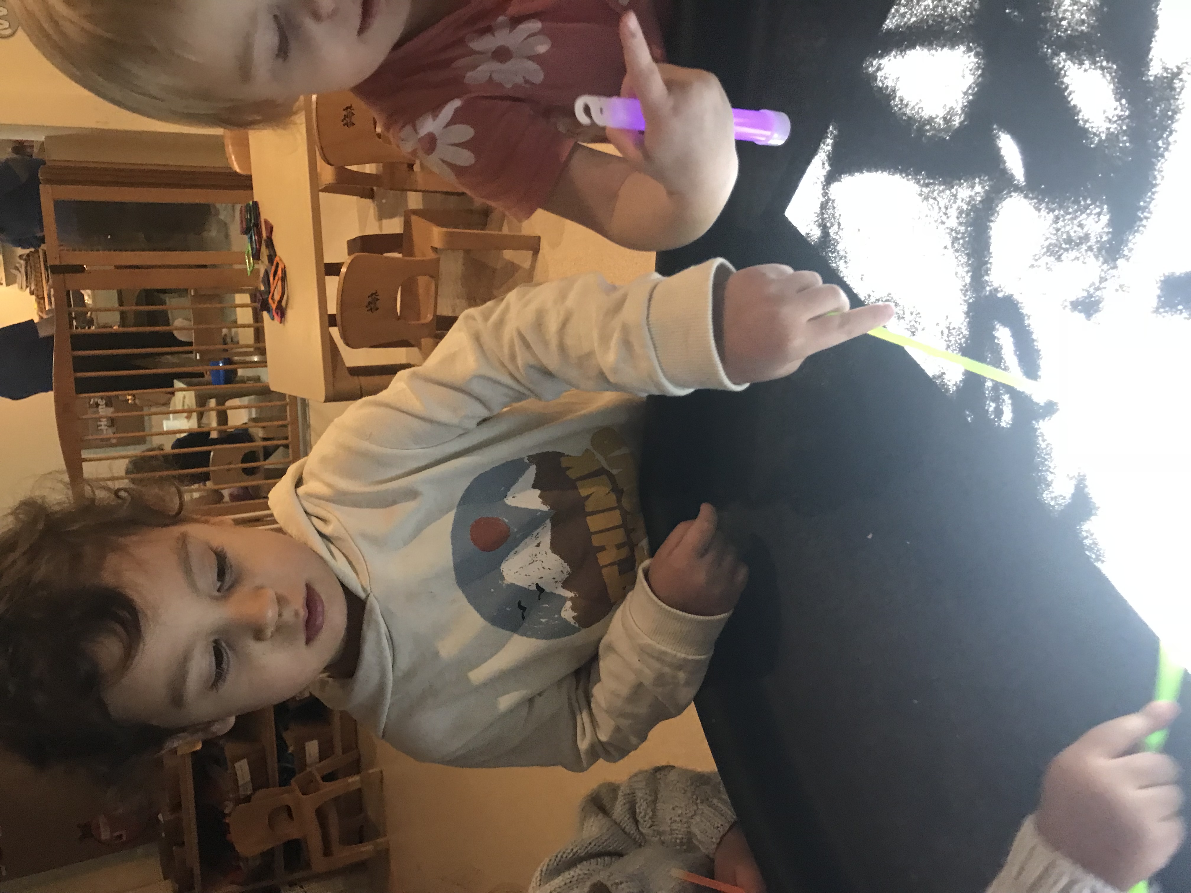 The glow sticks were grasped in palmer grasps and they were used to manipulate into making desired marks in the sand.