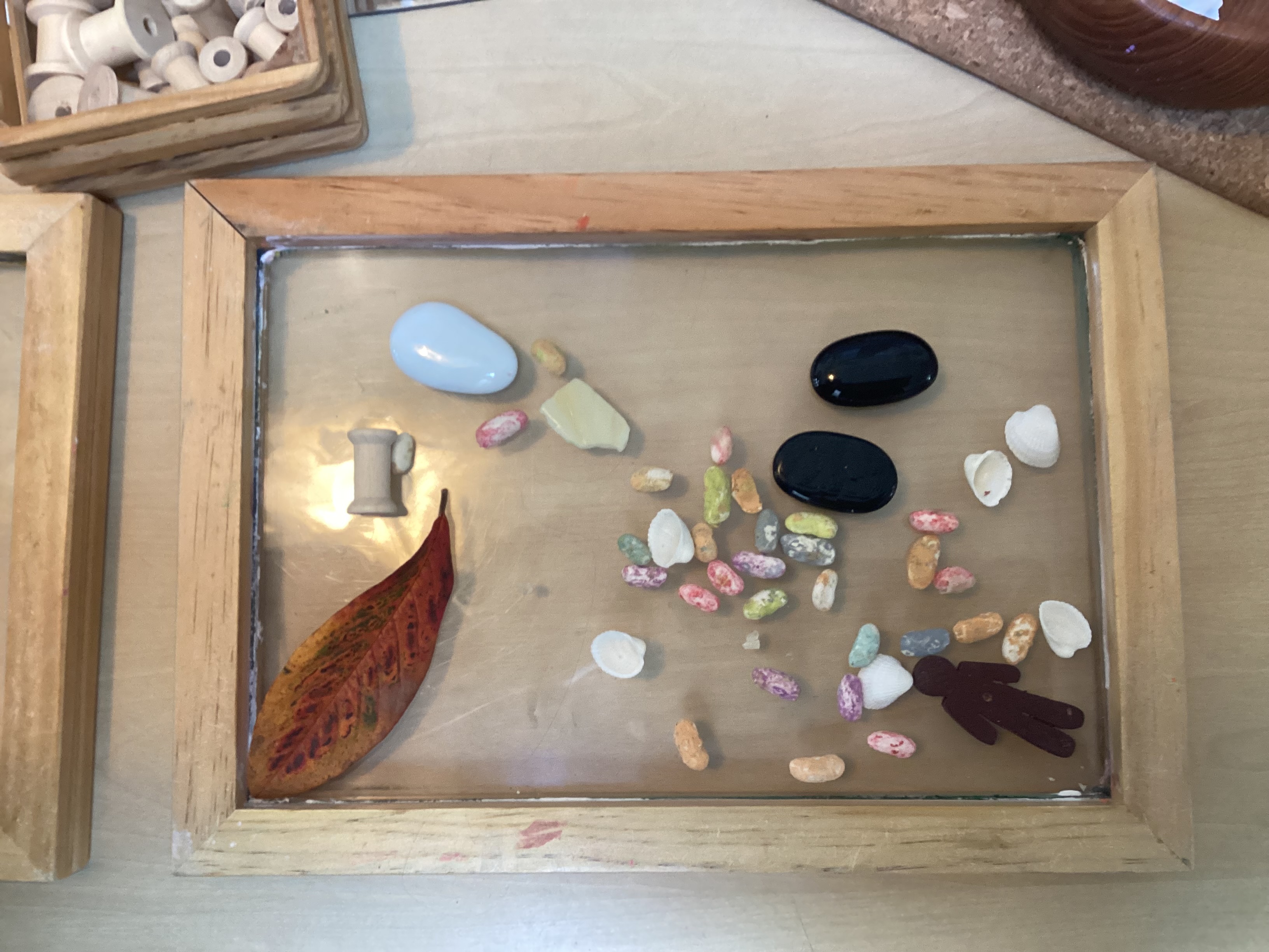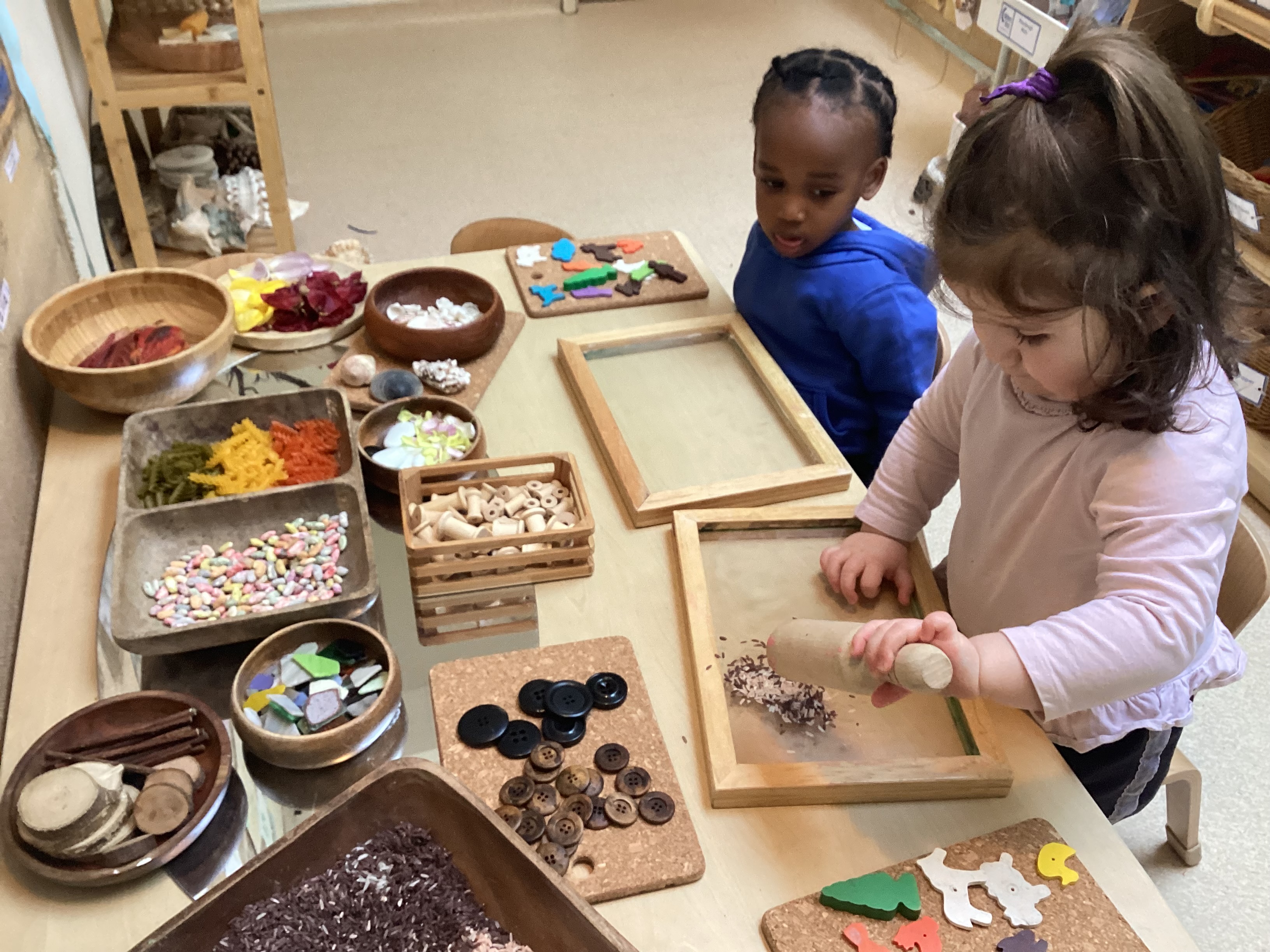 The Butterflies explored using loose parts to create their own art work. They used a frame to create a base for their art work and used a variety of media and materials to create on a large scale. Children picked up small items with pincer grasps and used palmer grips to use scoops to pour.