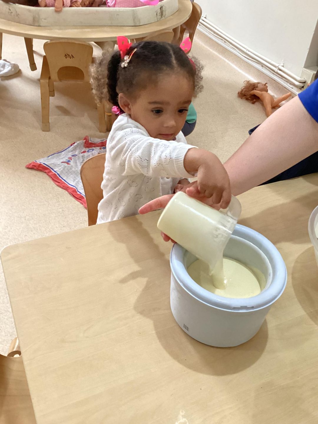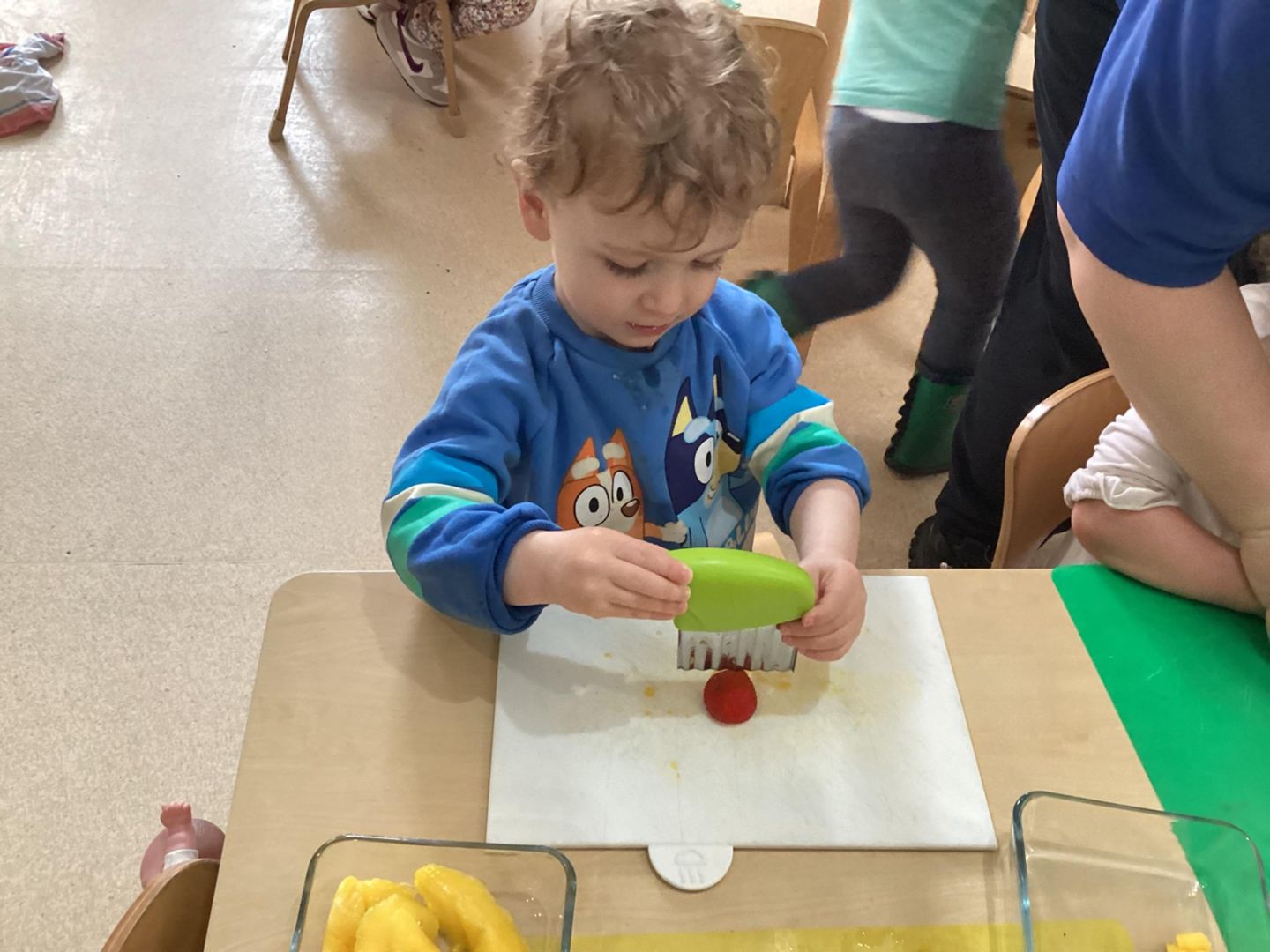 The Grasshoppers have had a lot of fun in the sun recently and have been enjoying ice cream with their families. So at nursery, we made our own ice cream. The children did really well using safety choppers and knives to cut up the fruit for their toppings, and they measured out the ice cream mix: custard and cream. They loved watching how the liquid slowly developed ice crystals and began to freeze up in the ice cream maker. Later in the week, the children then served the ice cream themselves as a delicious afternoon treat.