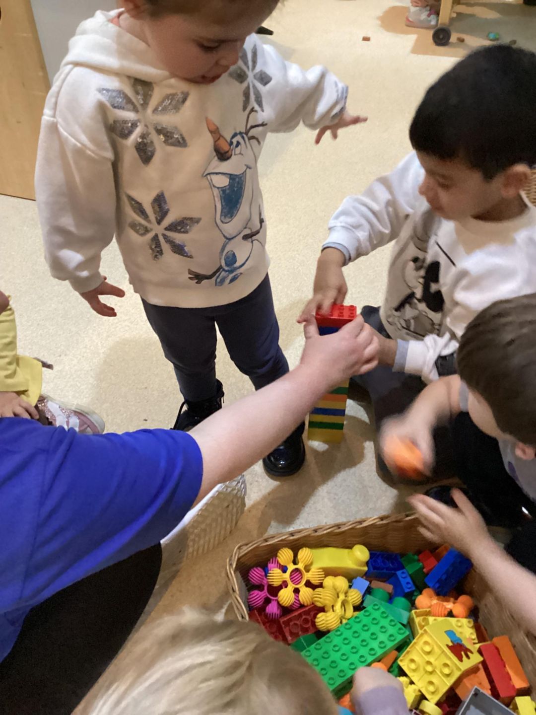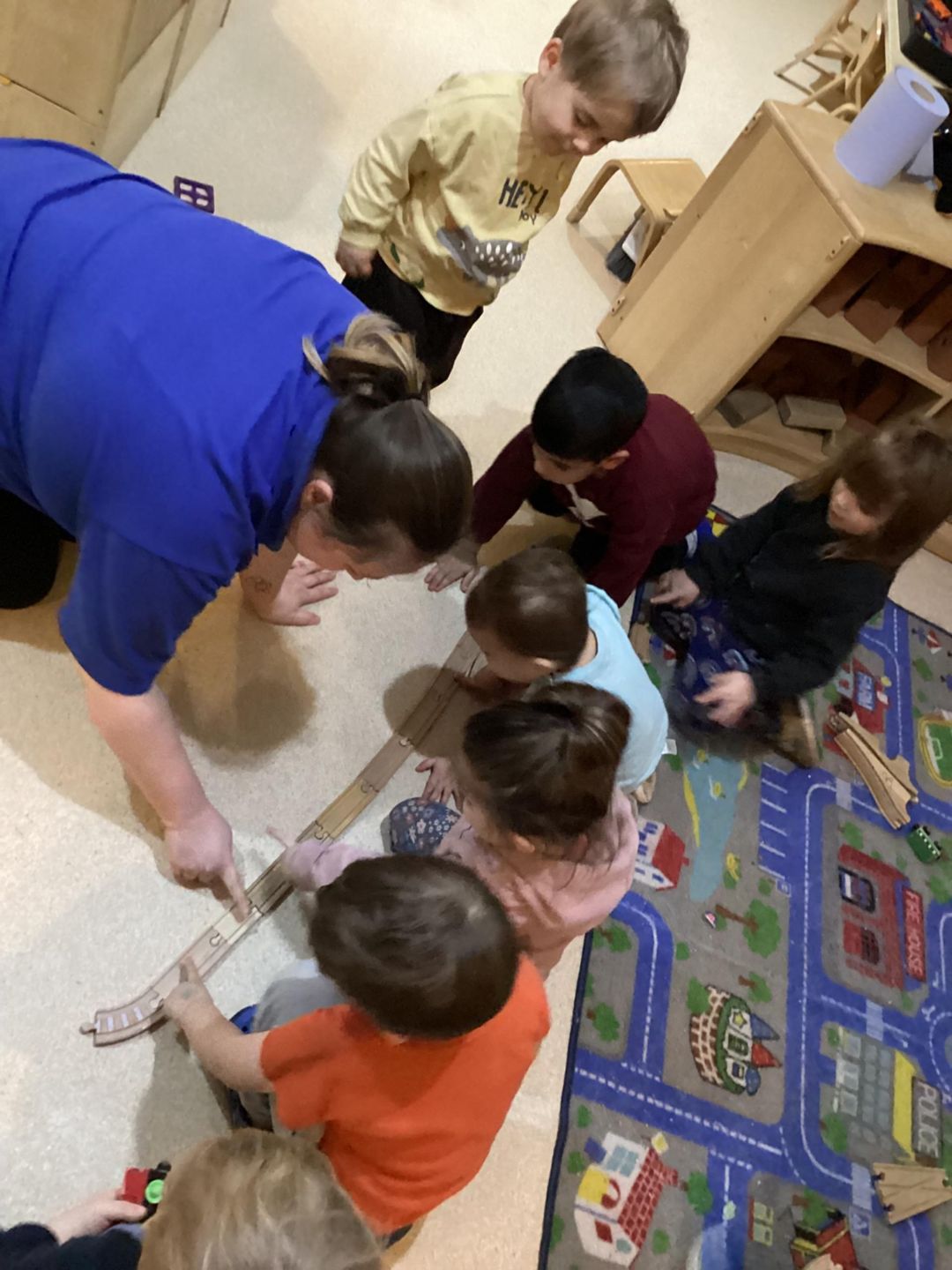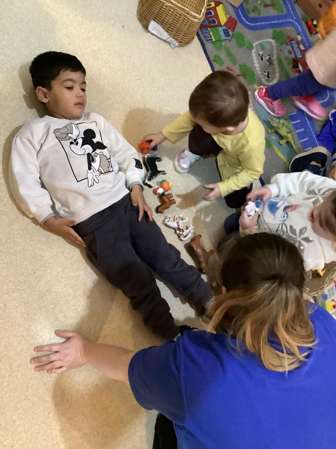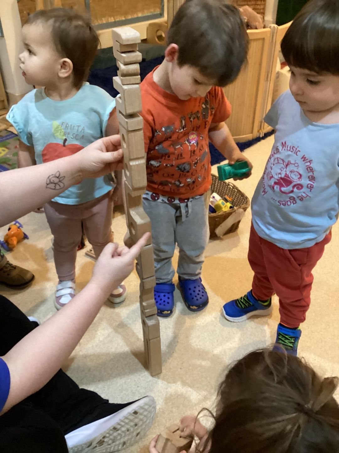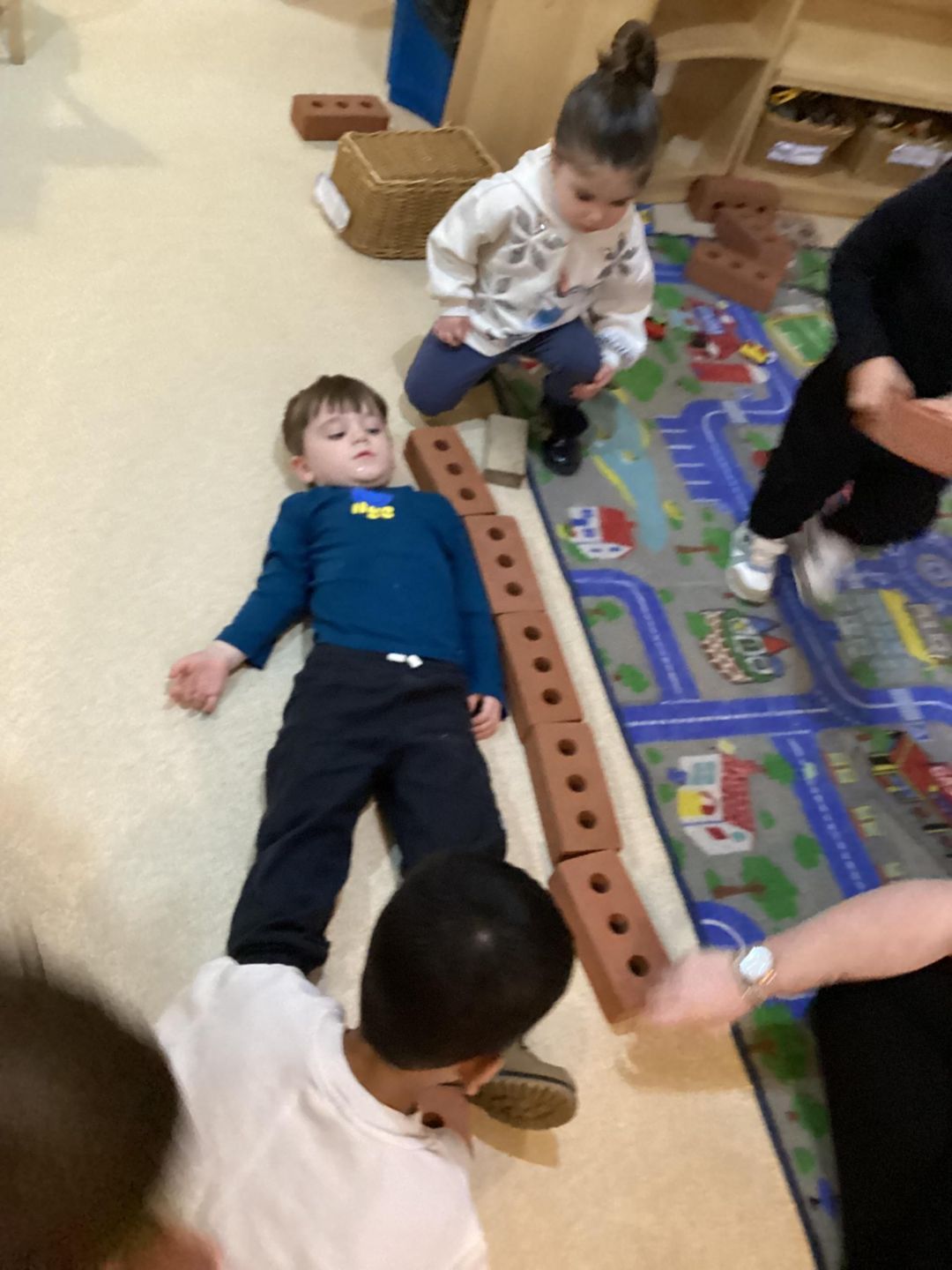 This week, the grasshoppers had a great time exploring concepts of length and height. At the beginning of the week, the children showed curiosity about the dimensions of their friends. To support their interest, we used toys for a fun measuring activity. The children gathered various toys, such as blocks, train tracks, and animals, to measure each other while standing or lying down. Once they built their lines or towers, they enjoyed stepping back to count how many objects they needed to measure their friends and teachers.