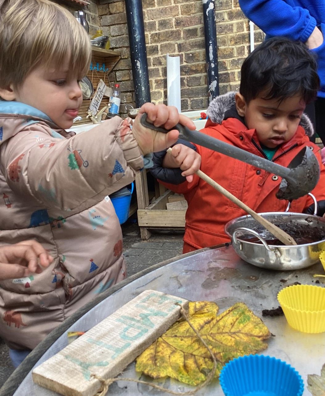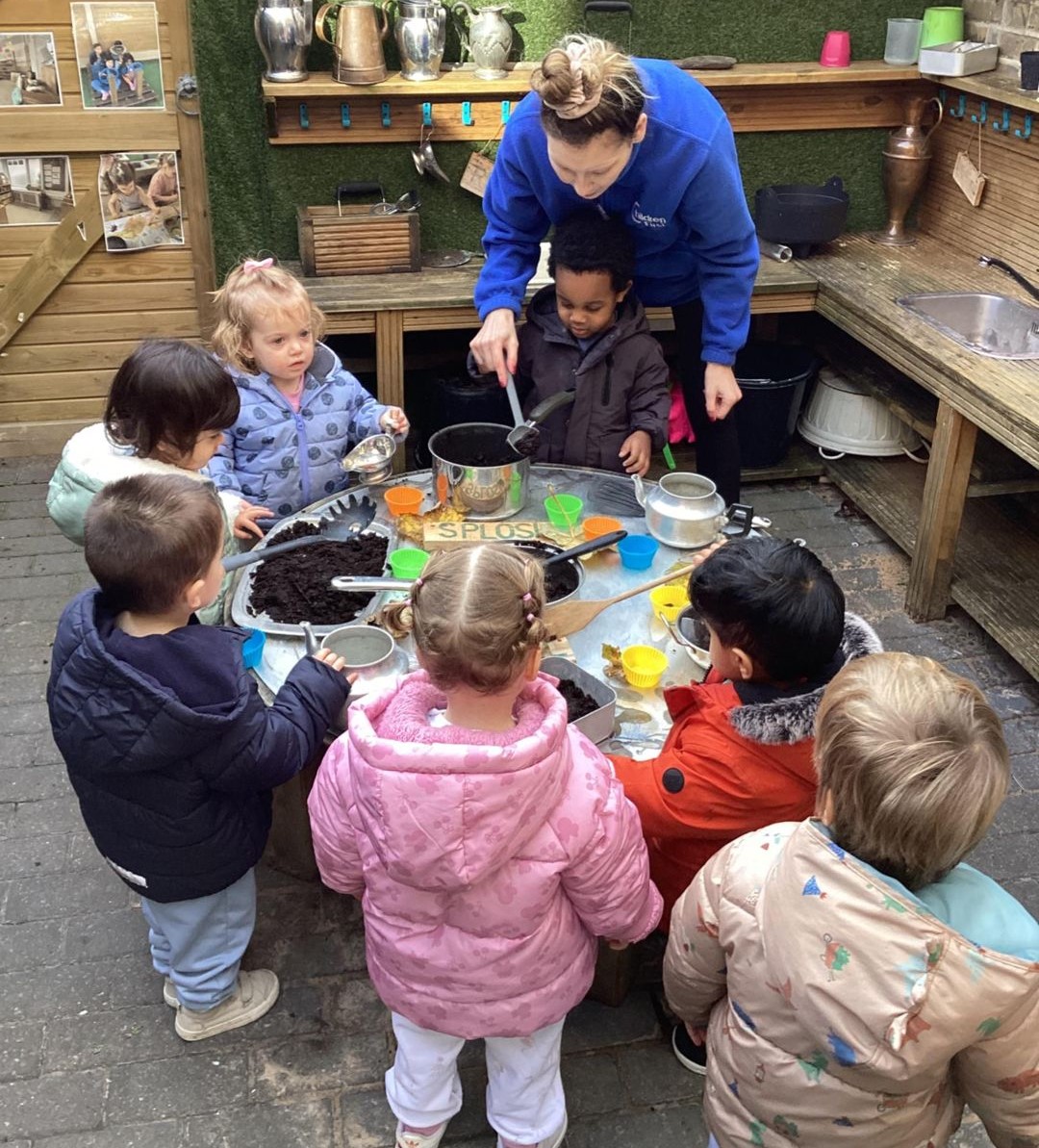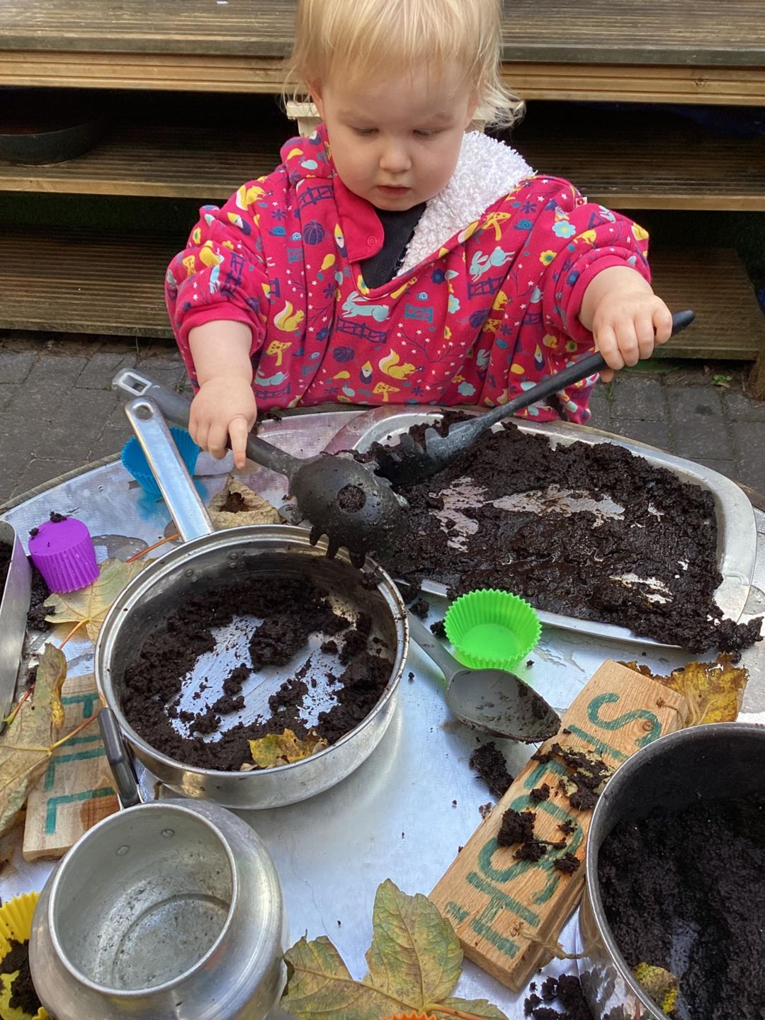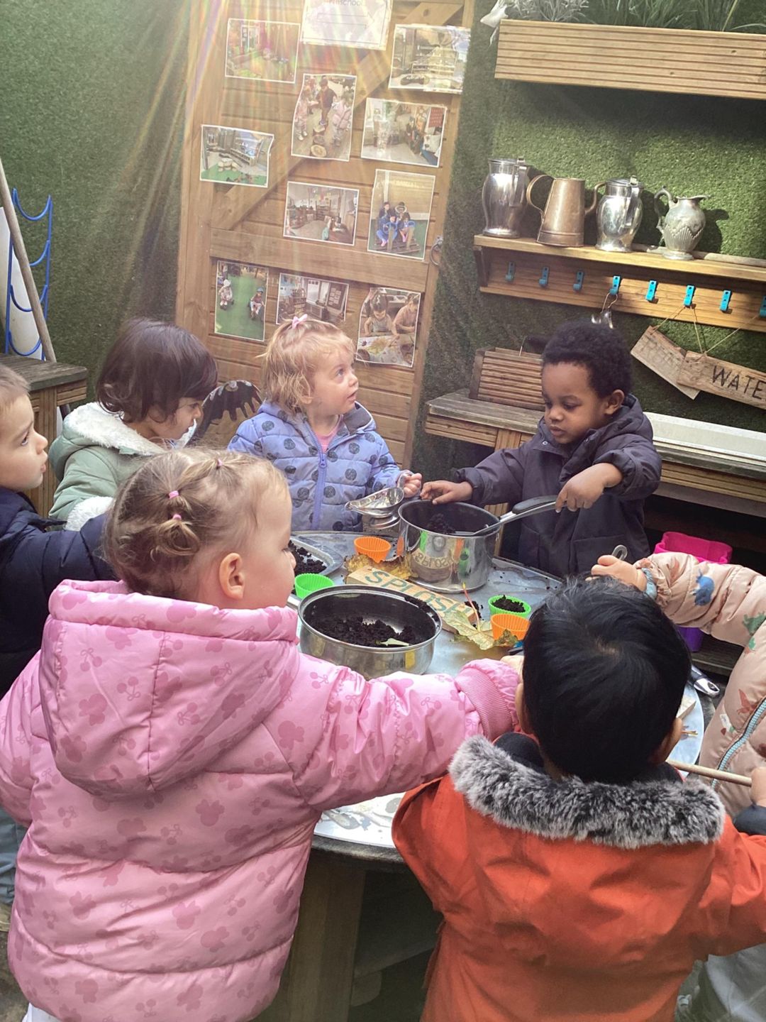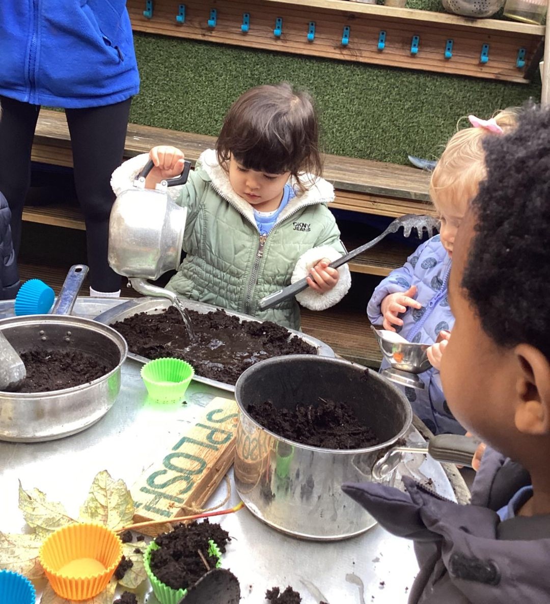 The Ladybirds have been exploring the Mud Kitchen in the garden. The children used real utensils to scoop, mix and pat their mud into the containers and cupcake cases. The children used language such as pat, squash, squeeze whilst manipulating the mud. The Ladybirds also used jugs and tea pots to pour water onto the mud to reach a different consistency.