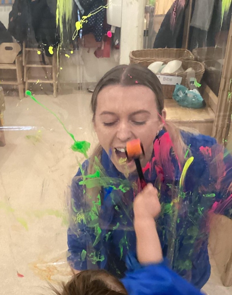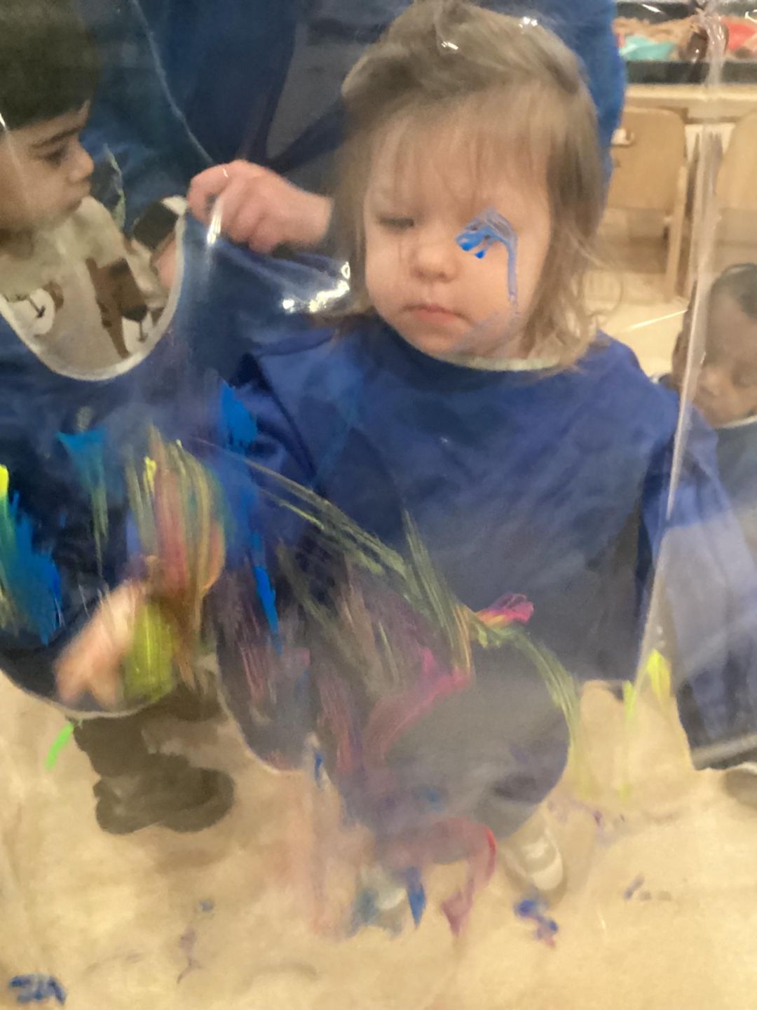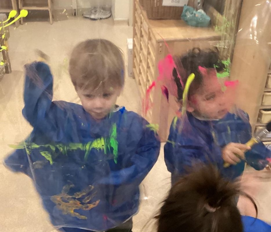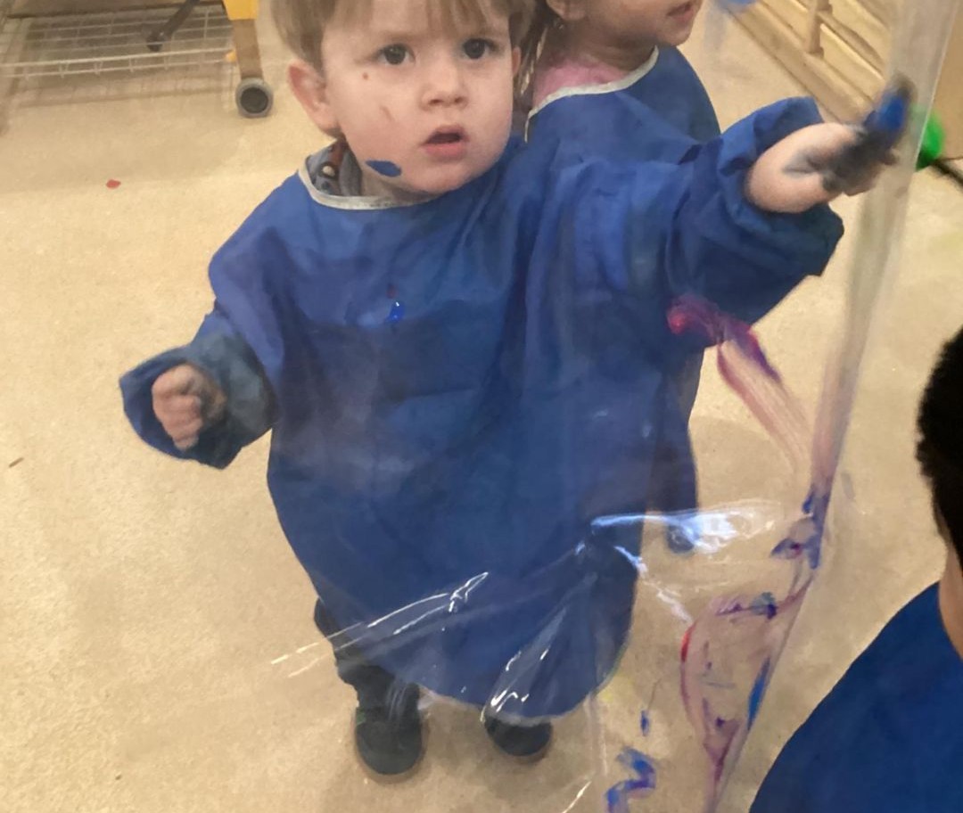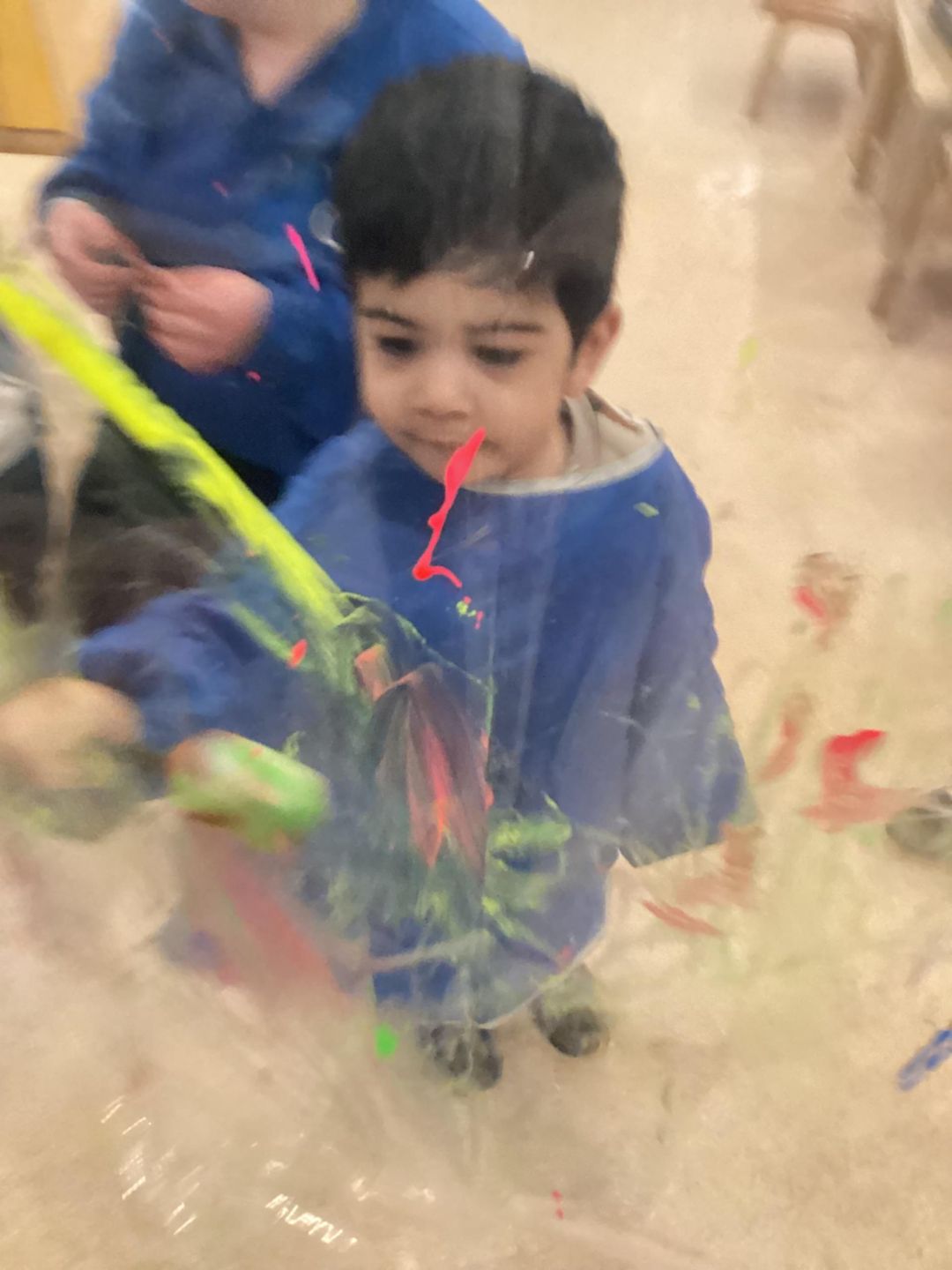 The ladybirds have had a great time engaging in a shower curtain painting activity. We explored a variety of vibrant colours while splattering and painting our shower curtain, and we had lots of fun seeing each other through it. Some of us were brave to step in the paint, enjoying the texture and sensation on their toes!