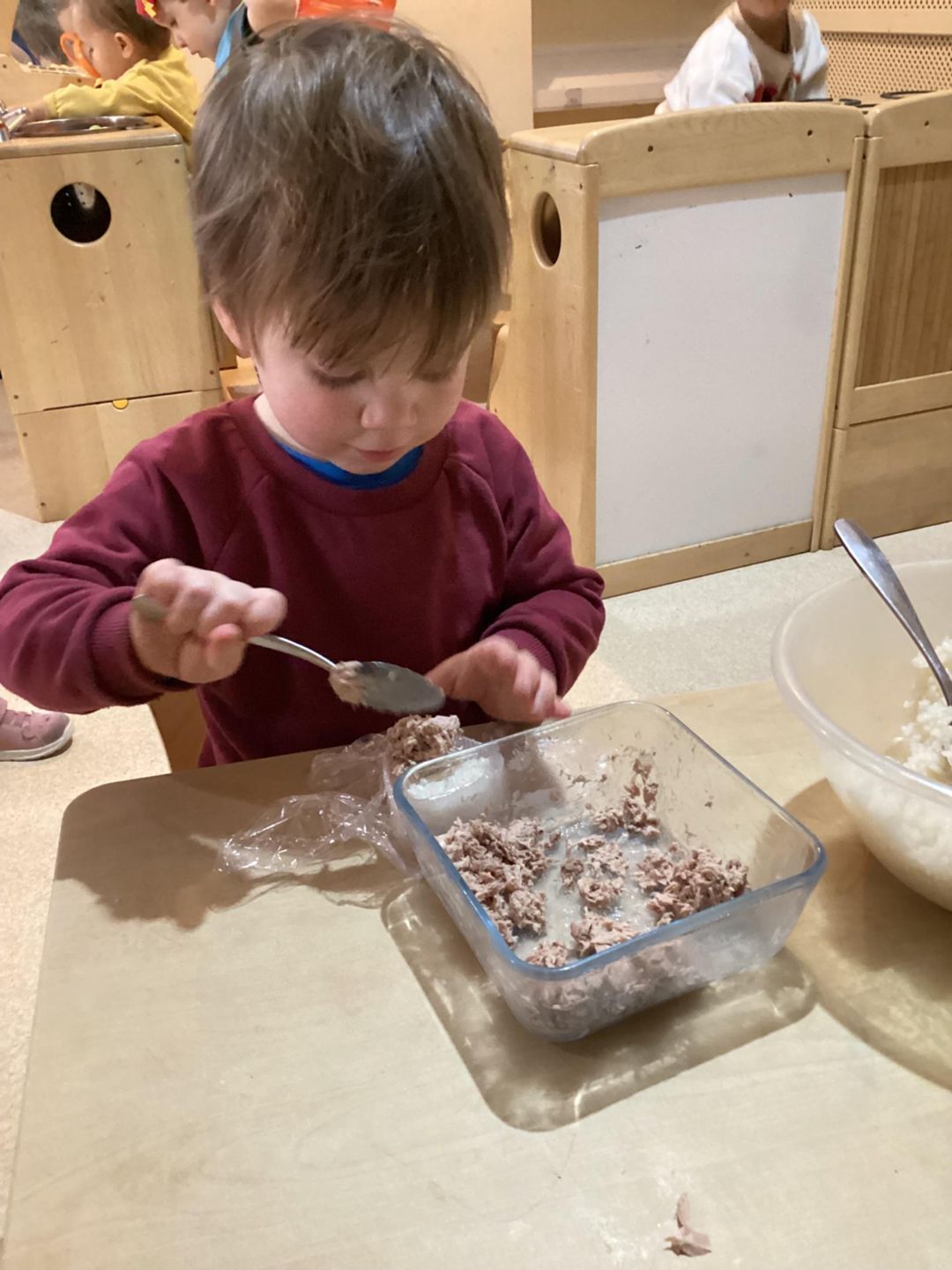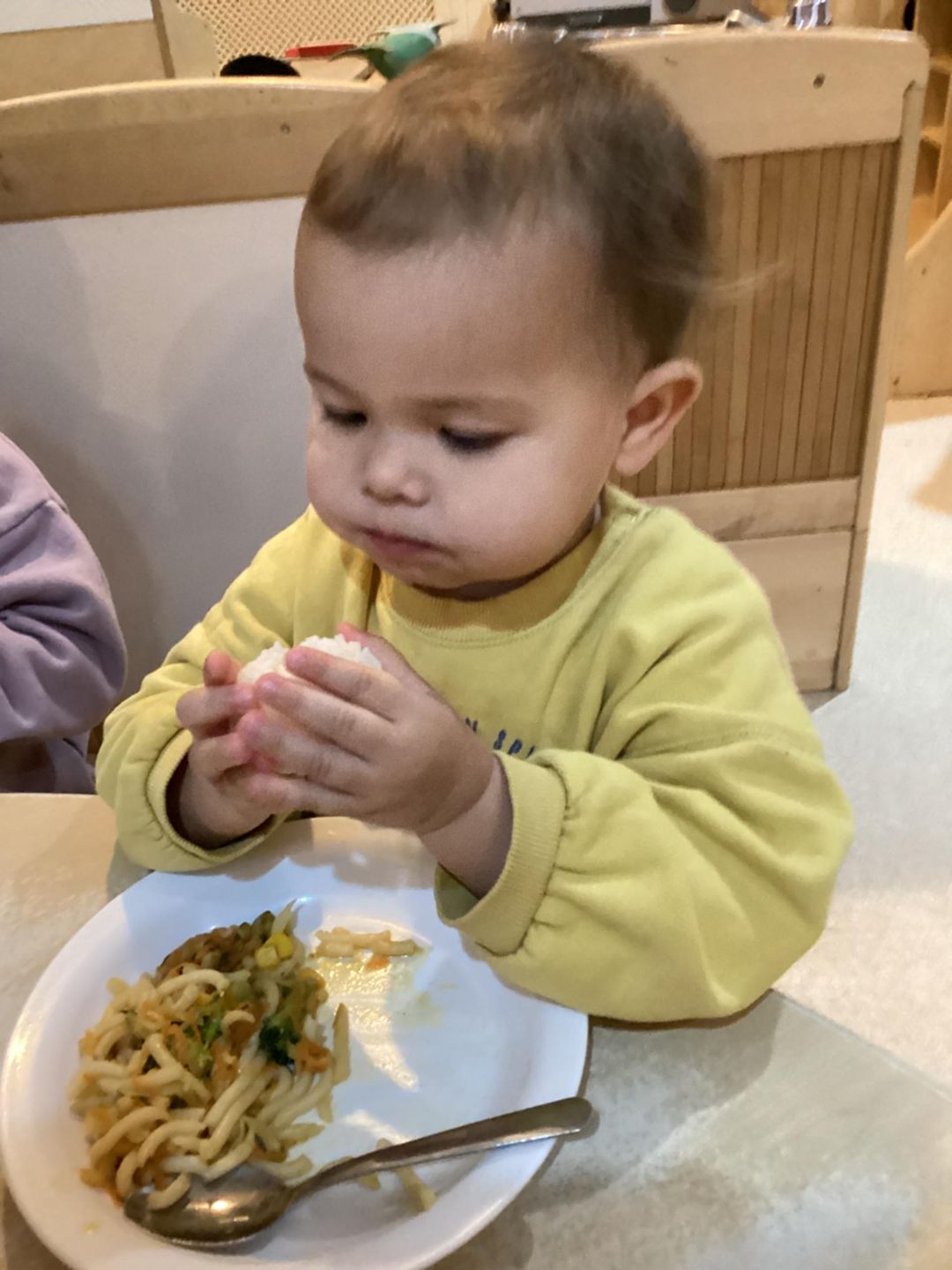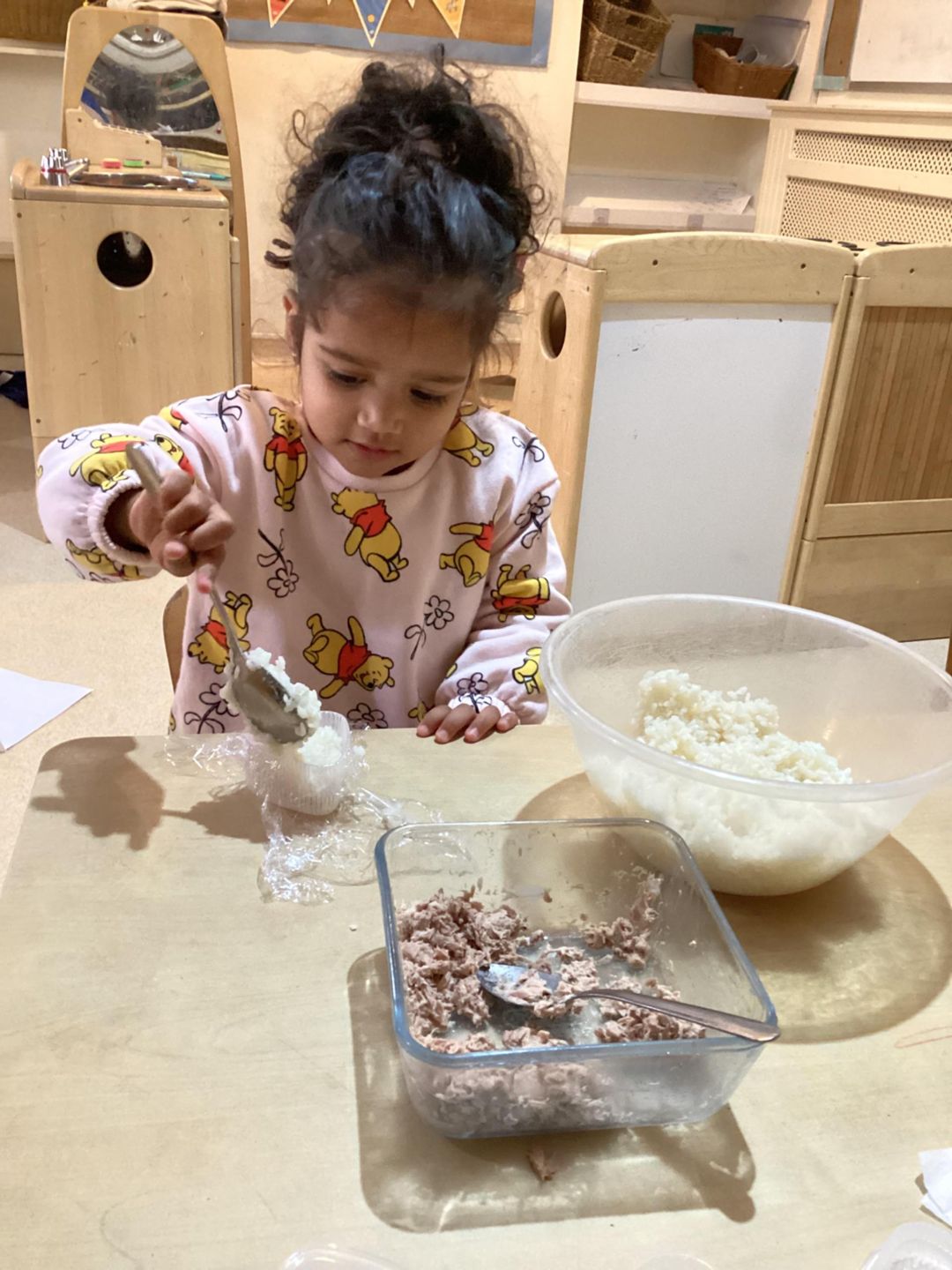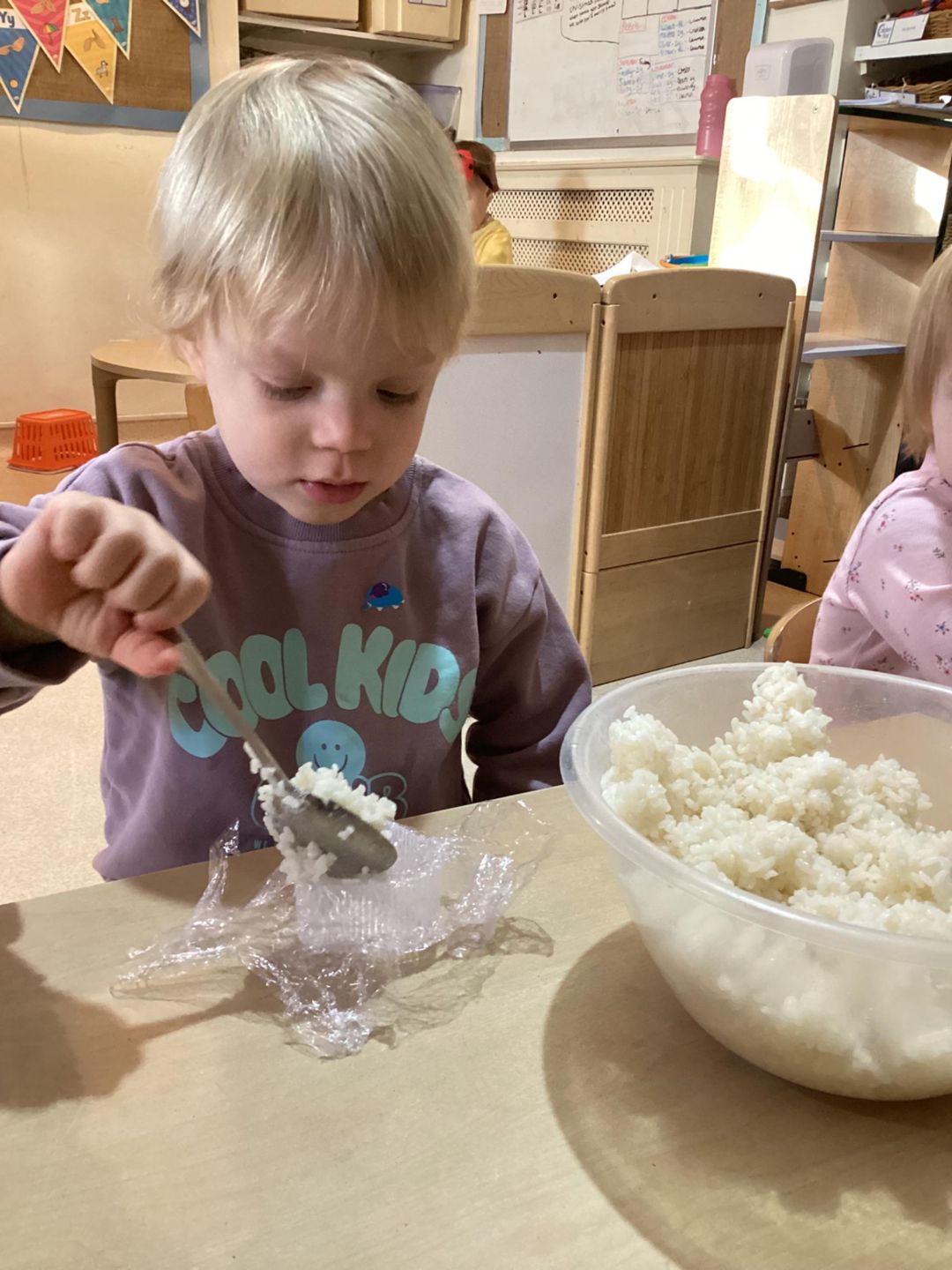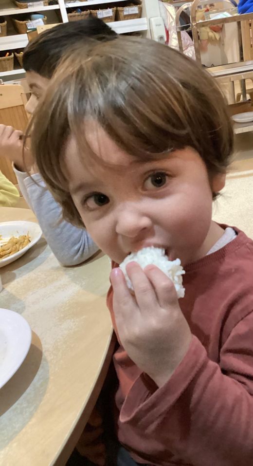 The children in Grasshoppers have enjoyed exploring the culinary world of Japan with a fun onigiri-making activity! The children carefully filled their rice-ball moulds with Japanese rice, and some chose to add tuna as a tasty filling. They then pressed the moulds to create the signature triangular onigiri shape. After all their hard work, the children happily tasted their homemade onigiri with tea, alongside a delicious udon stir-fry. It was a wonderful hands-on experience that invited them to discover new flavours and practise their fine-motor skills.