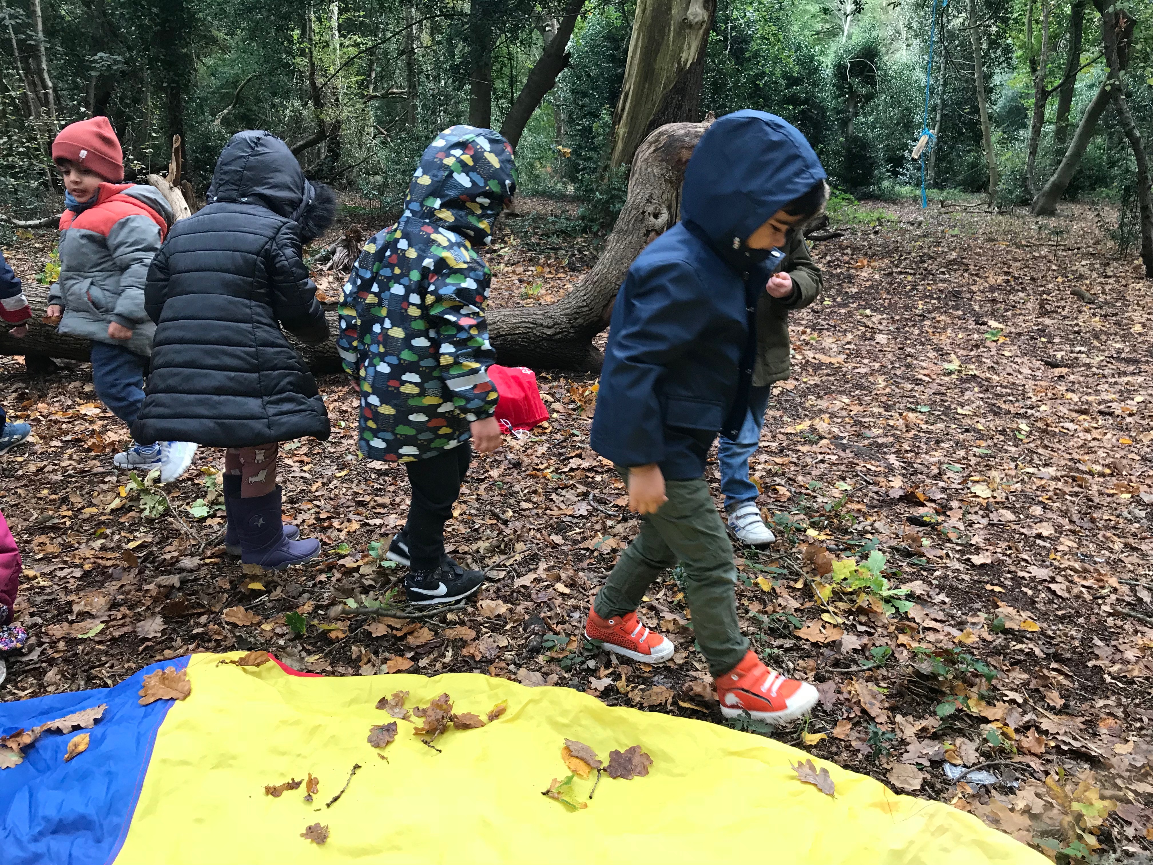Then the children had fun lifting the parachute as high as possible to allow the leaves to fall and cascade around them.