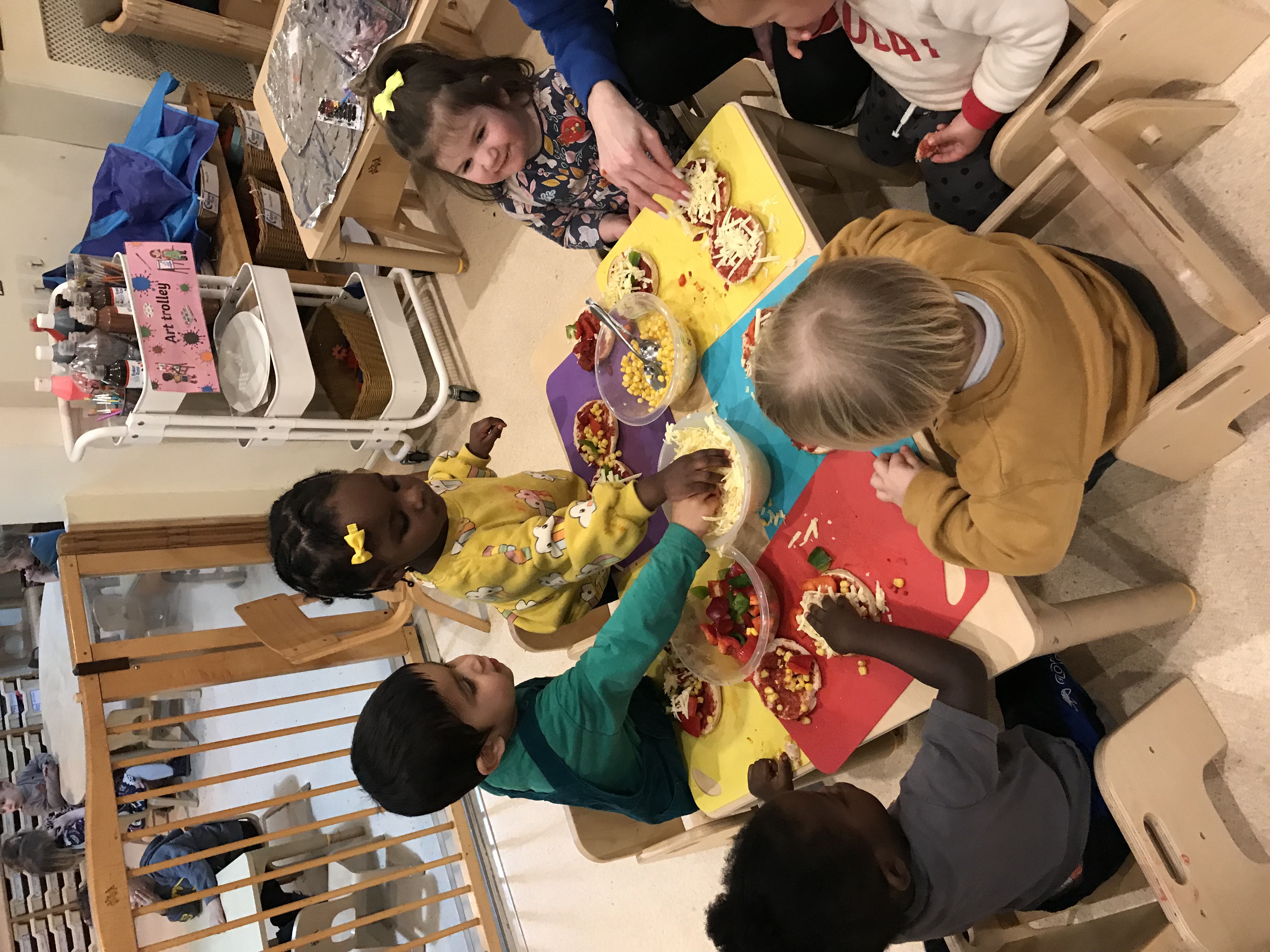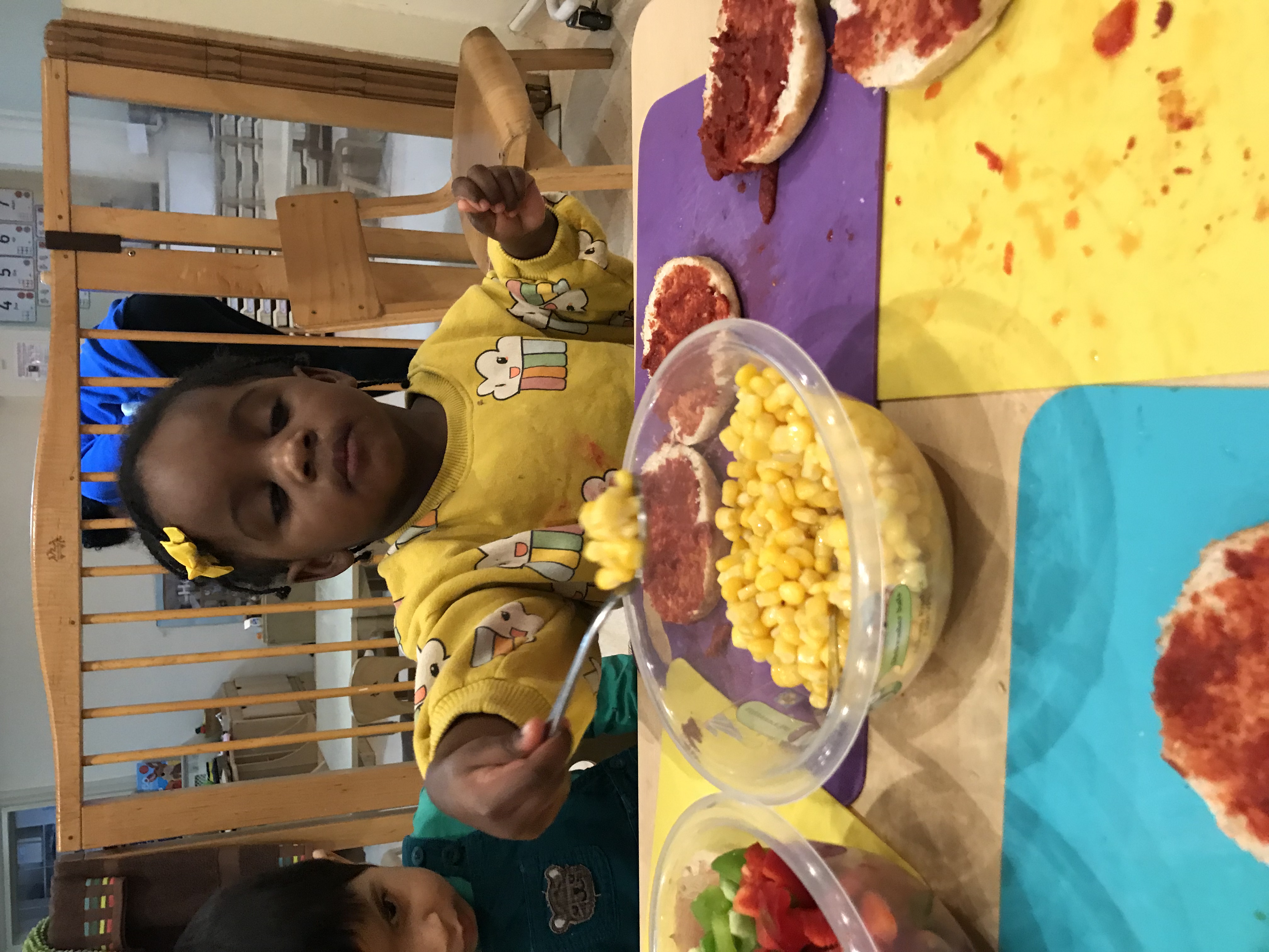 Our chef Lana takes part in weekly cooking activities with the children. These include meals from the menu that the children can eat, healthy snacks and bread for breakfast. This week the Ladybirds made pizzas with Lana. The children manipulated knives to cut up pieces of peppers. Carefully maneuvering the knife and managing the risk of the knife. Spoons were used to scoop sweetcorn on pizzas. children used fine motor skills an were skilled at this maneuvering the spoon with little spill. Children also sprinkled grated cheese onto the pizzas using a pincer motions that supports early writing skills.
