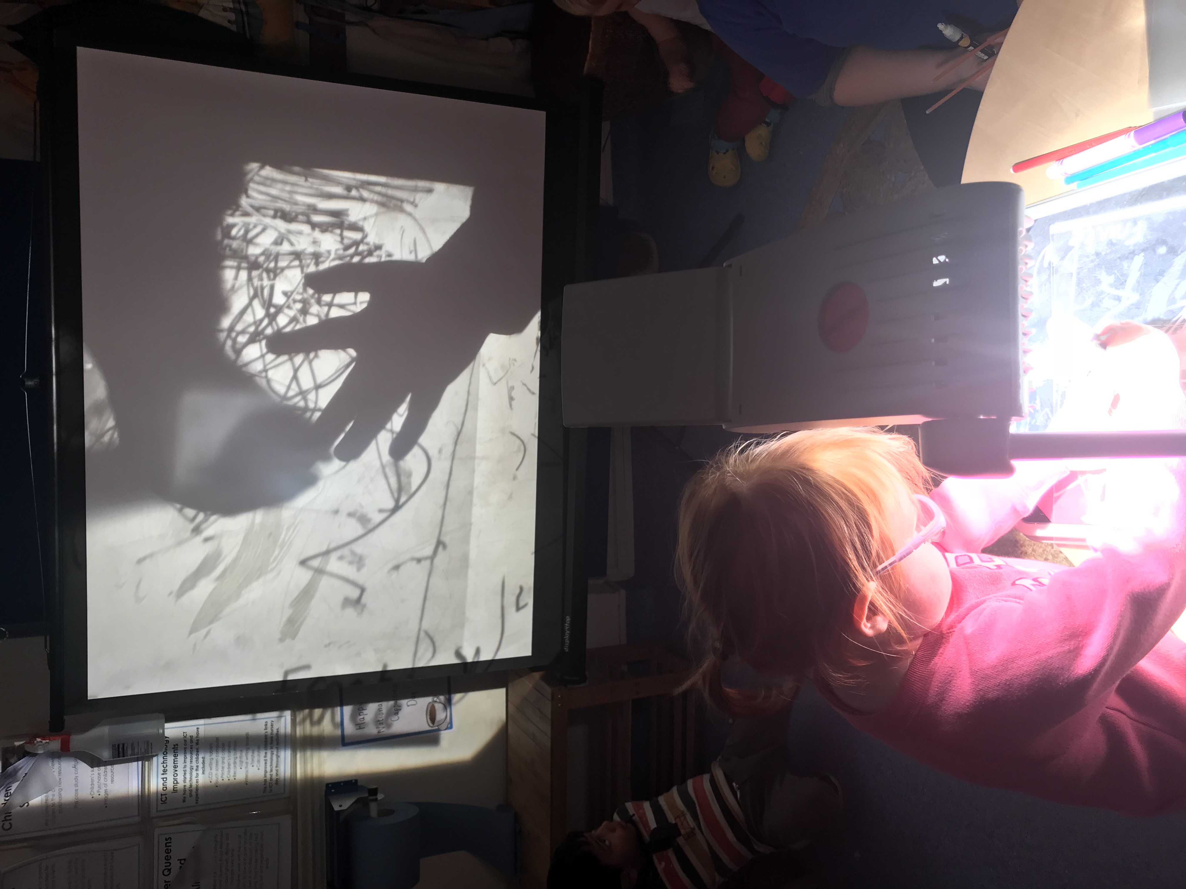 The children were interested in the projector commenting on the light and saying it was bright. exploring new vocabulary.