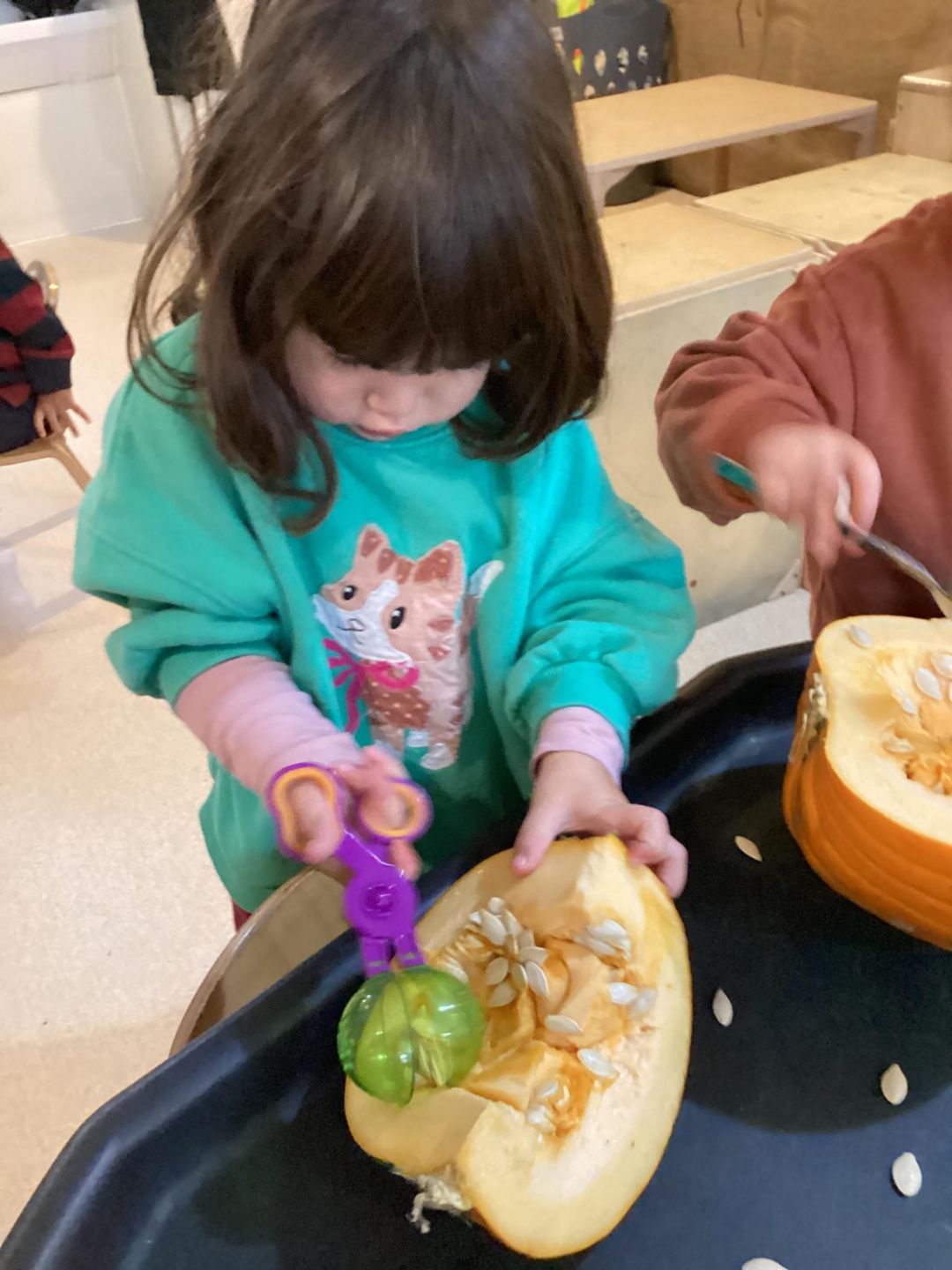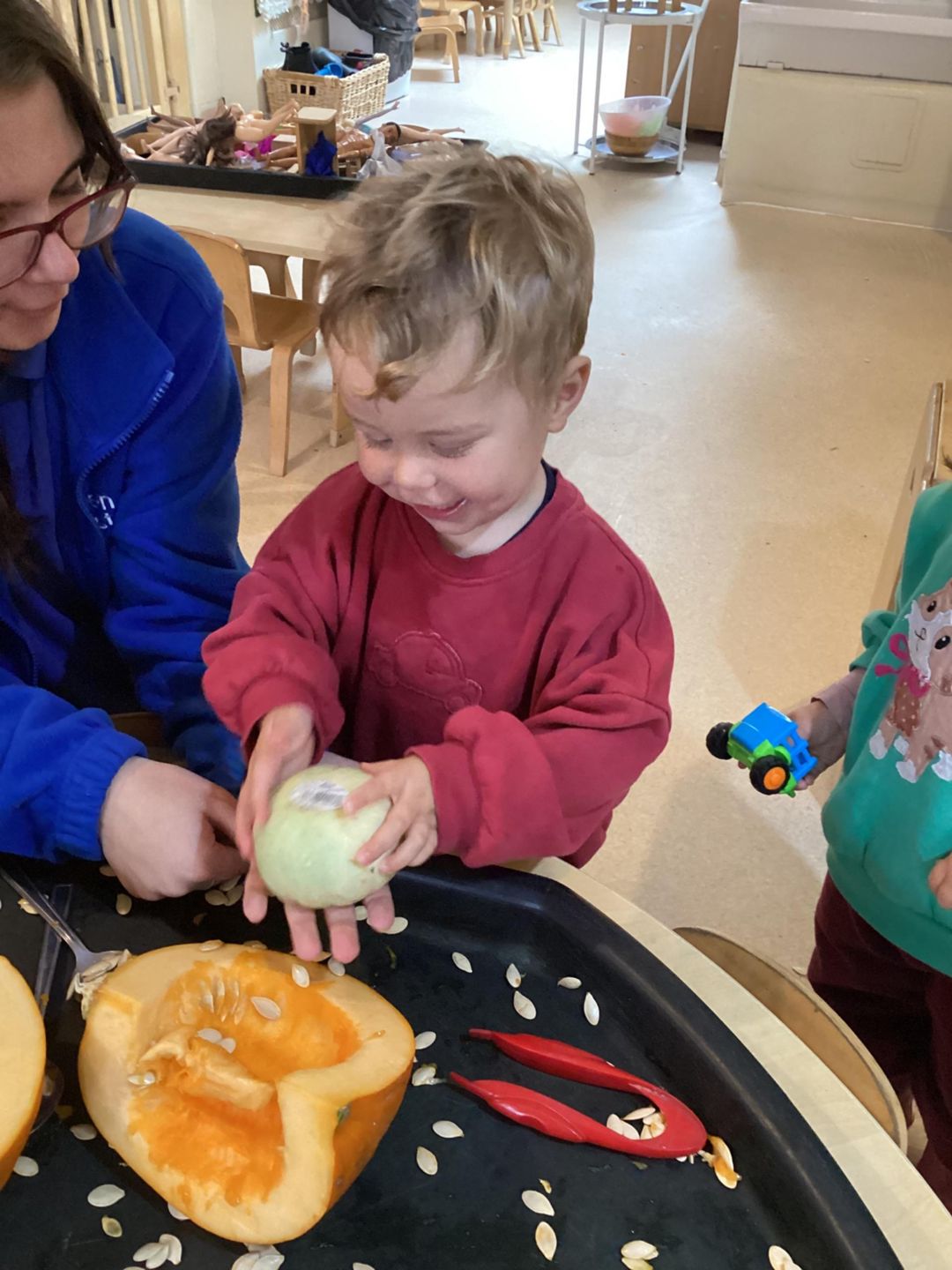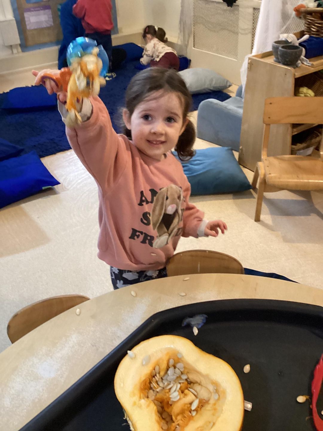 The Butterflies have had lots of fun exploring pumpkins. The children looked inside the pumpkins exploring the different textures. They used a variety of different tools to scoop out the middle including tweezers, scoops and spoons. The children used fine motor skills to handle the tools as they used skills that will support them with early writing skills as they strengthen hand muscles. The children talked about what they found inside the pumpkins and what might happen with the pumpkin seeds, using lots of describing words such as slimy, wet, sticky and cold!