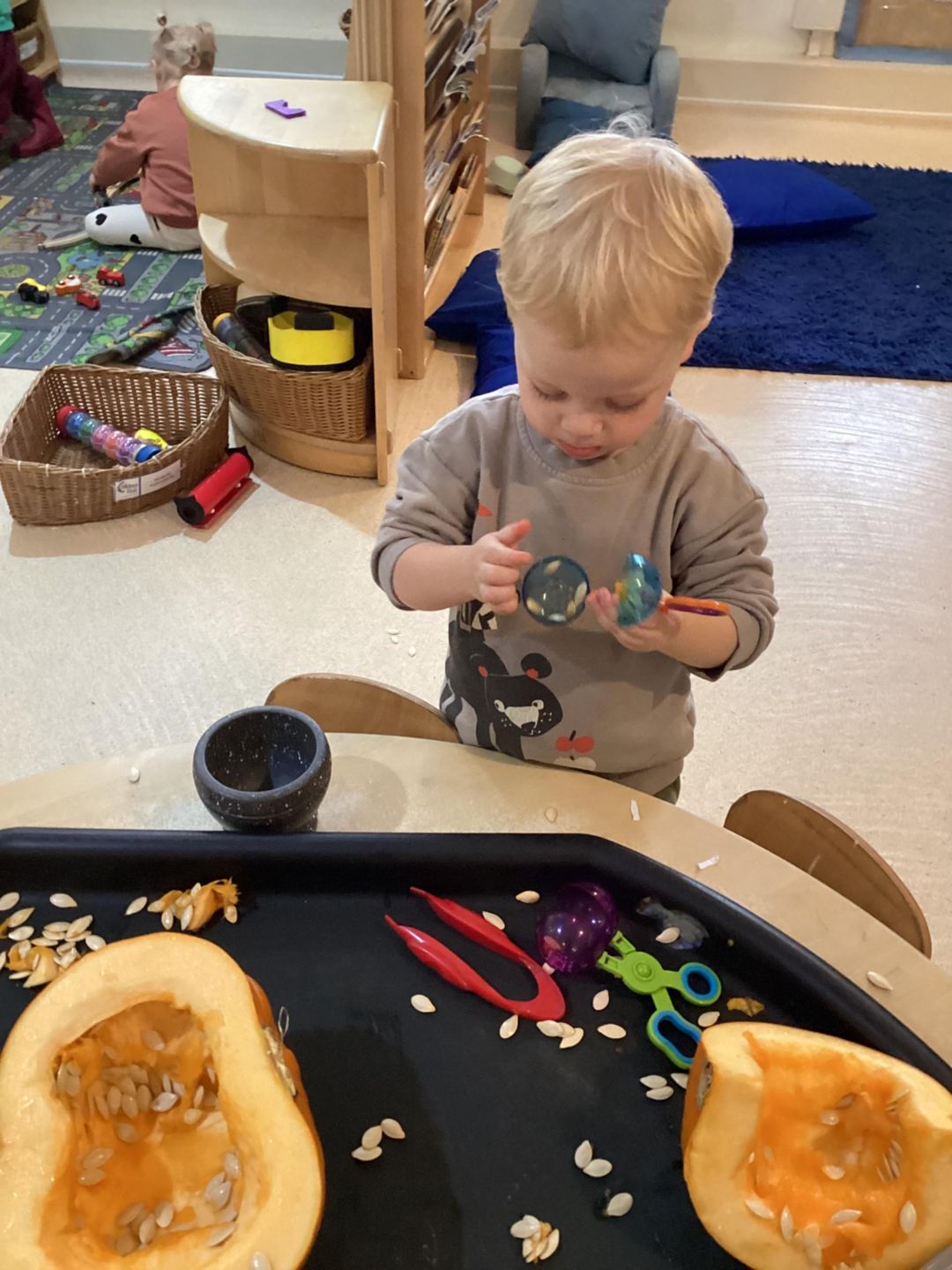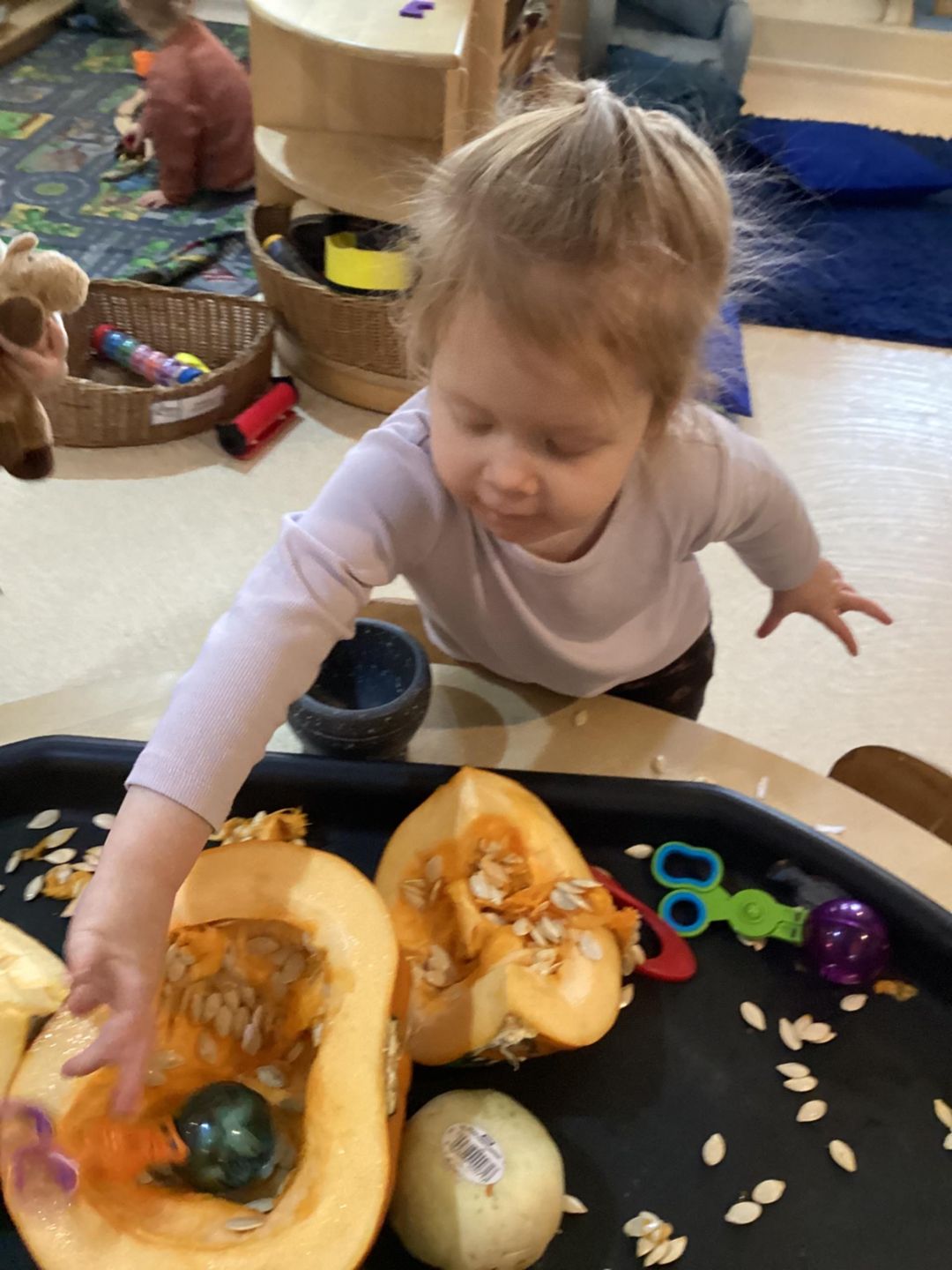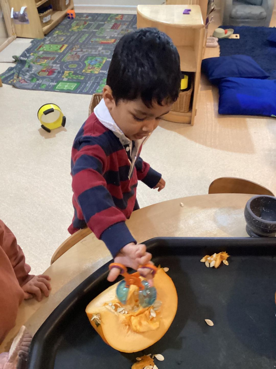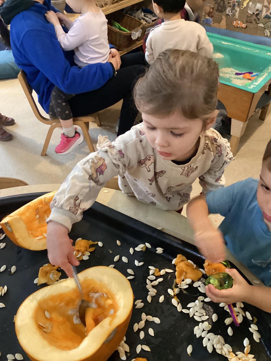 The Butterflies have had lots of fun exploring pumpkins. The children looked inside the pumpkins exploring the different textures. They used a variety of different tools to scoop out the middle including tweezers, scoops and spoons. The children used fine motor skills to handle the tools as they used skills that will support them with early writing skills as they strengthen hand muscles. The children talked about what they found inside the pumpkins and what might happen with the pumpkin seeds, using lots of describing words such as slimy, wet, sticky and cold!