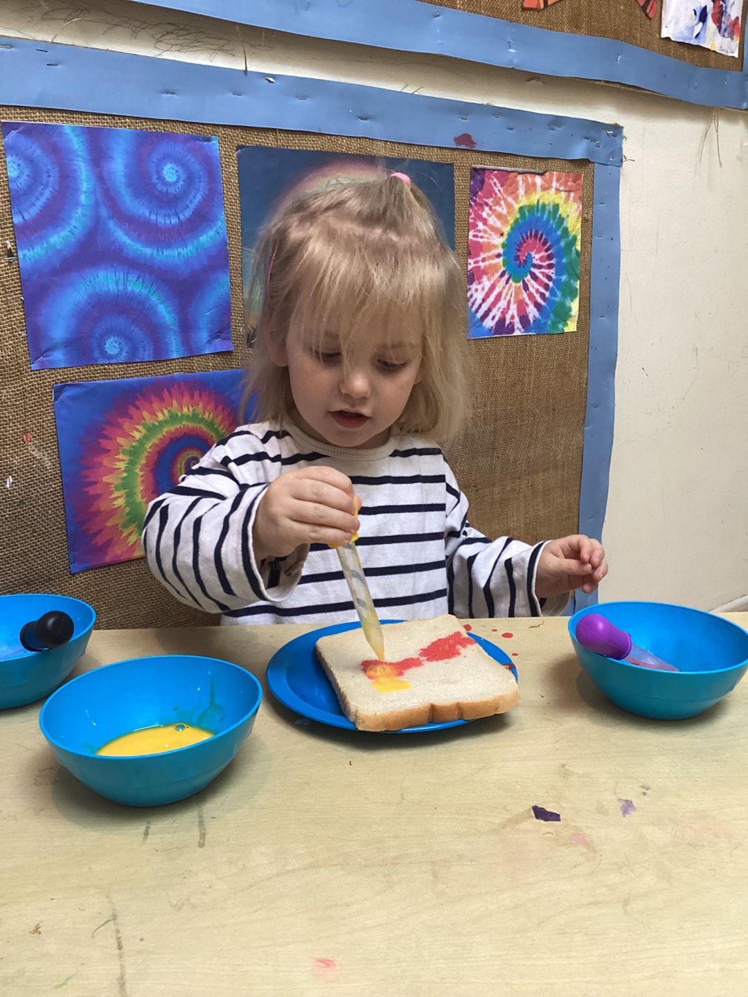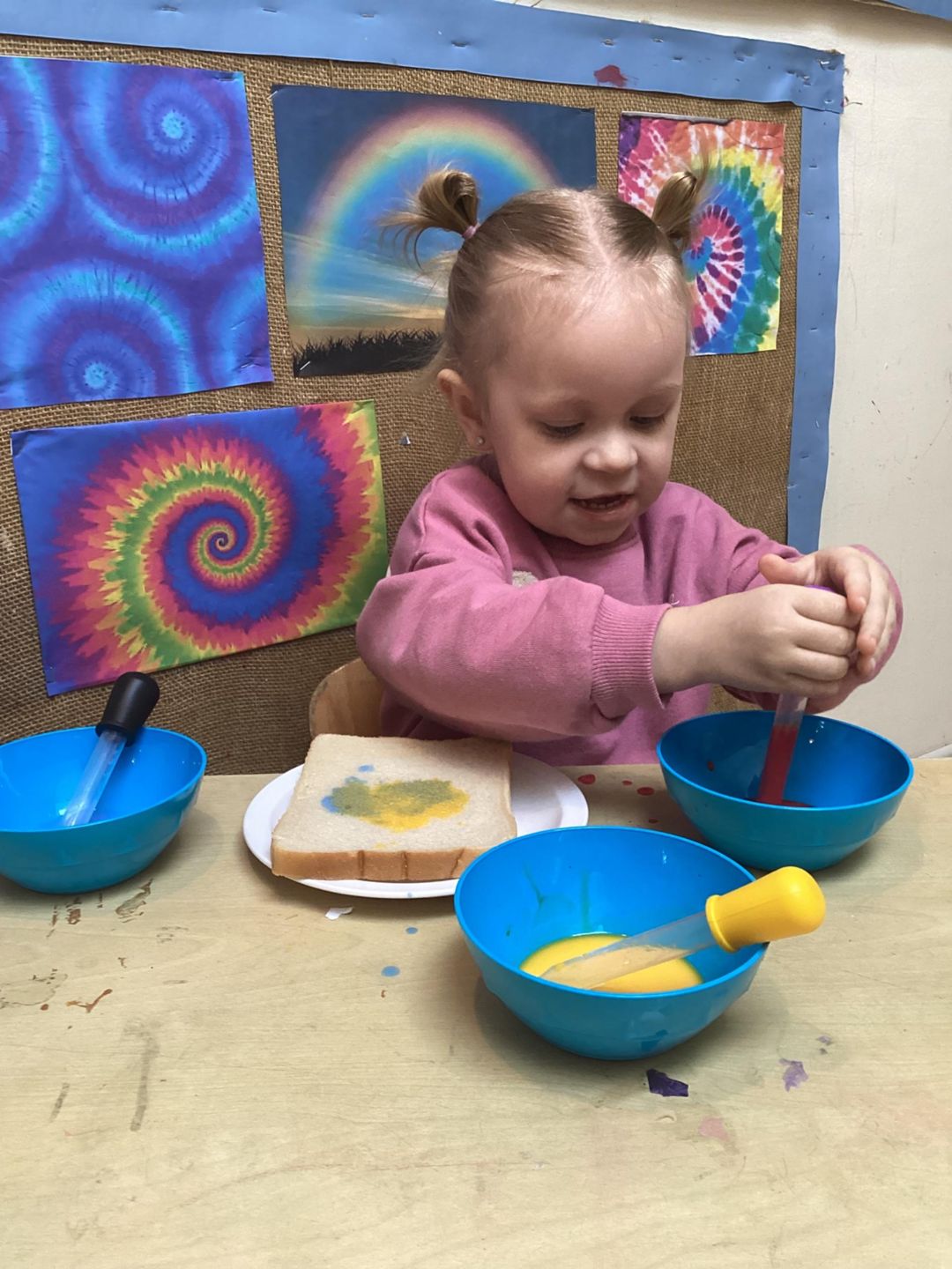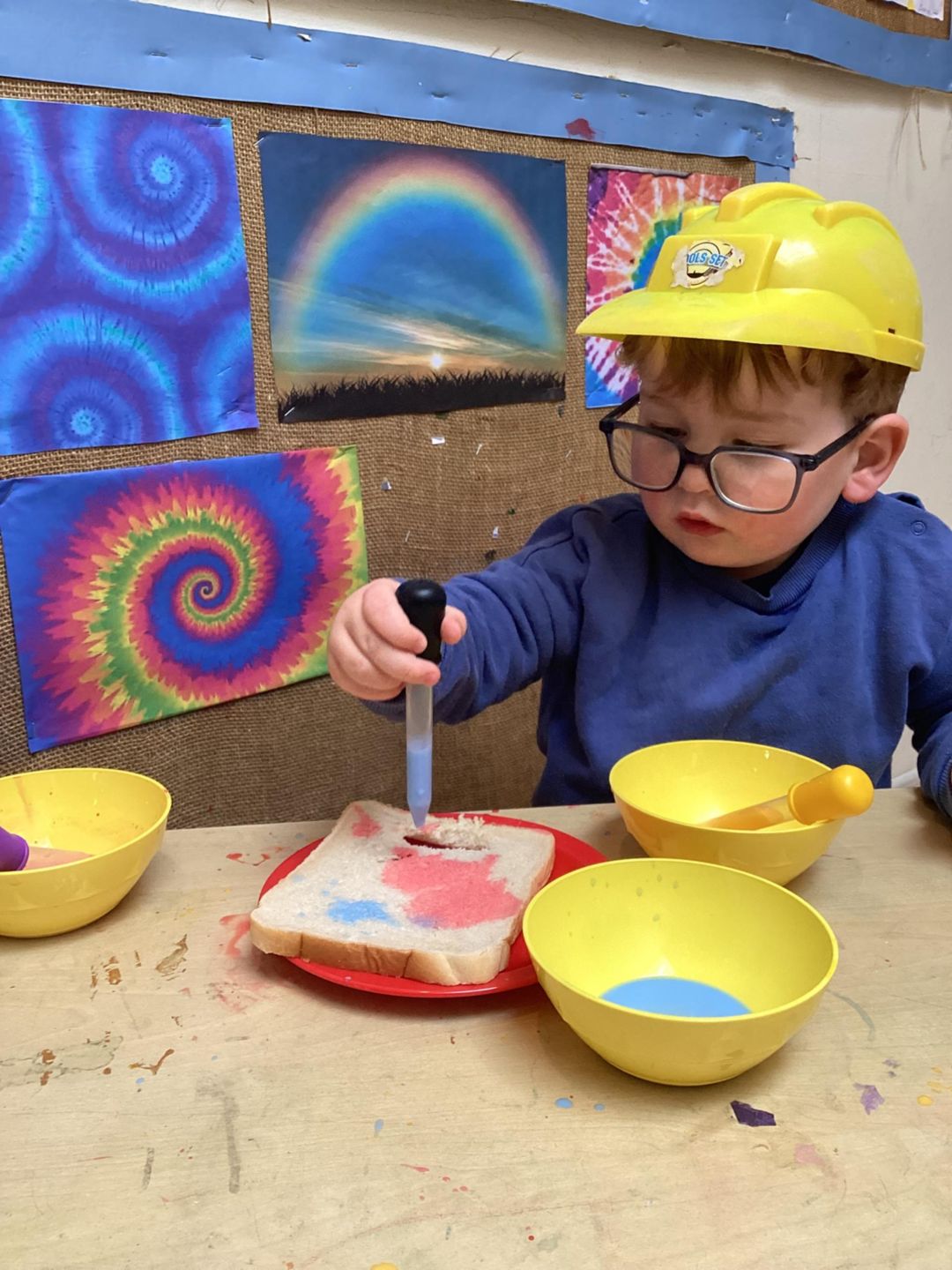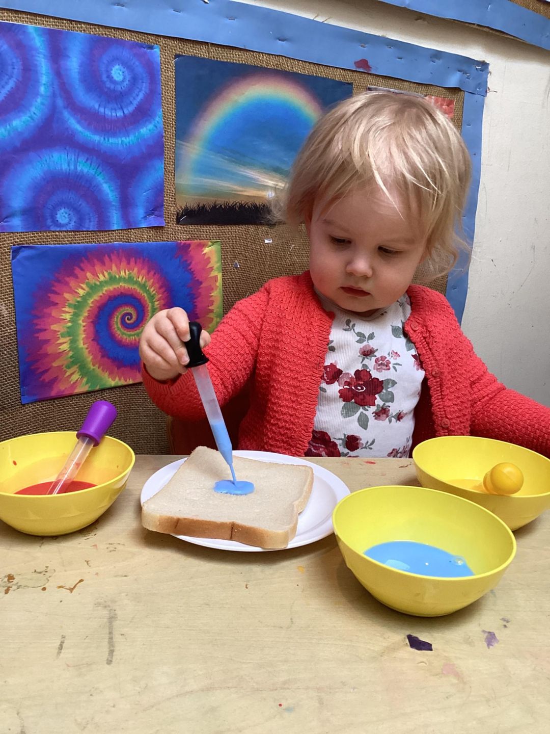 Spring has sprung so we decided to make some colourful rainbow toast for snack whilst talking about spring colours. The children used their fine motor skills to correctly use a pippette to carry out this activity.