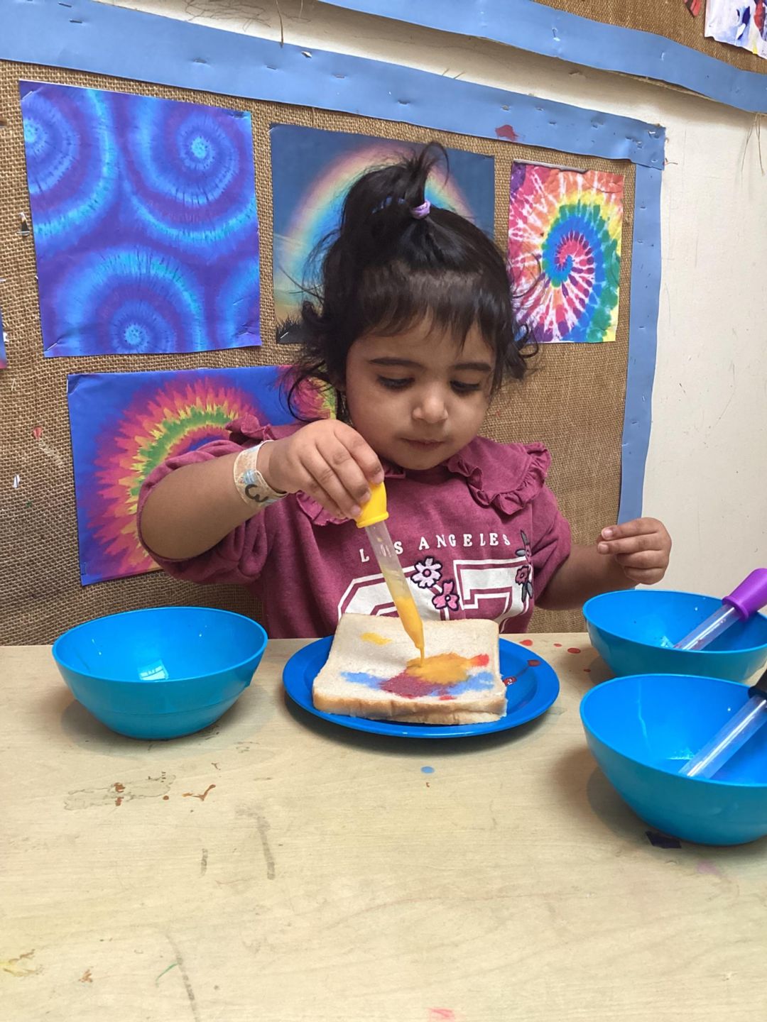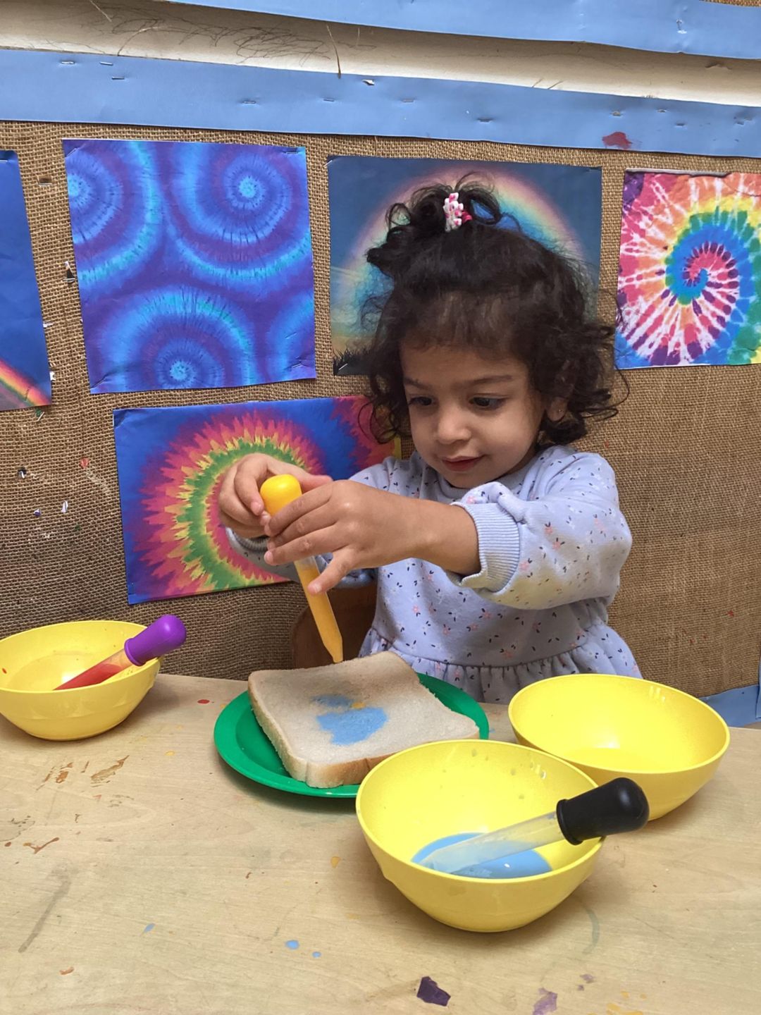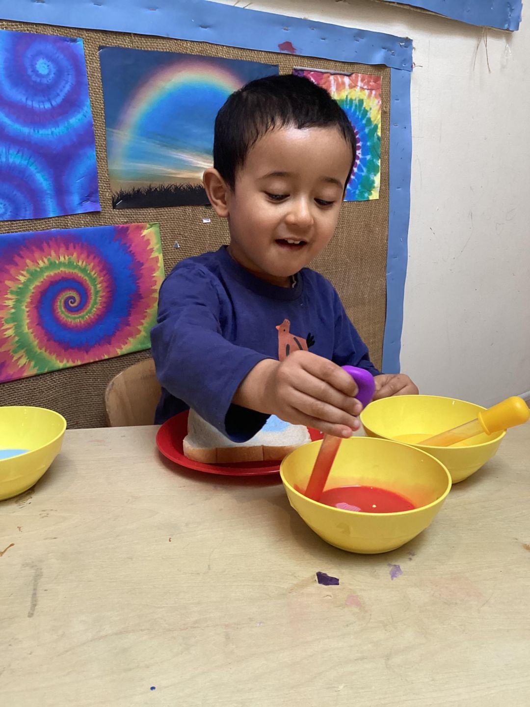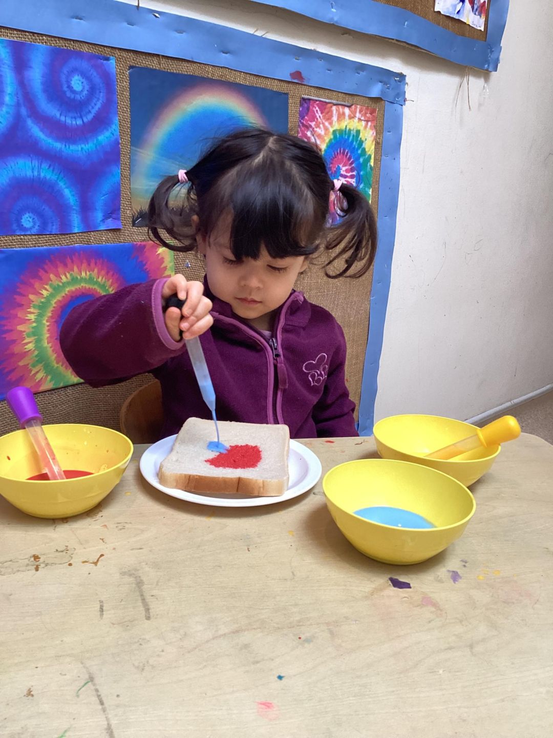 Spring has sprung so we decided to make some colourful rainbow toast for snack whilst talking about spring colours. The children used their fine motor skills to correctly use a pippette to carry out this activity.
