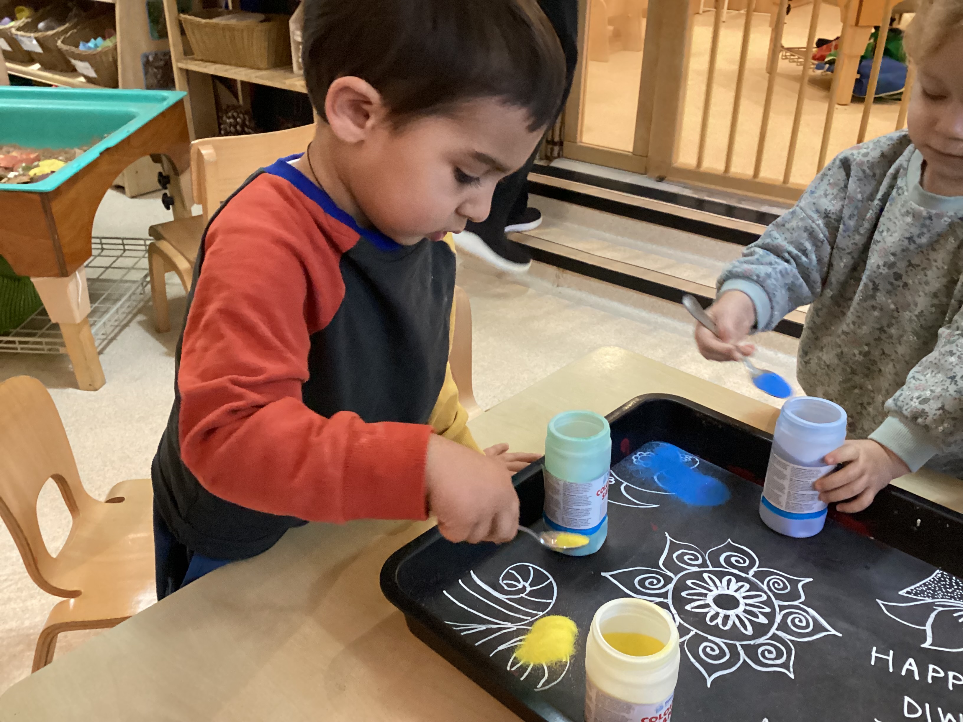 The Butterflies have been celebrating Diwali and made some rangoli patterns. The children used different coloured sand in their hands and with spoons to scoop into patterns into the try. The children discussed the mixing colours and swirled them together to create new patterns and shades of colours. The children looked at lots of images of different rangoli patterns and created their own interpretations in the tray.